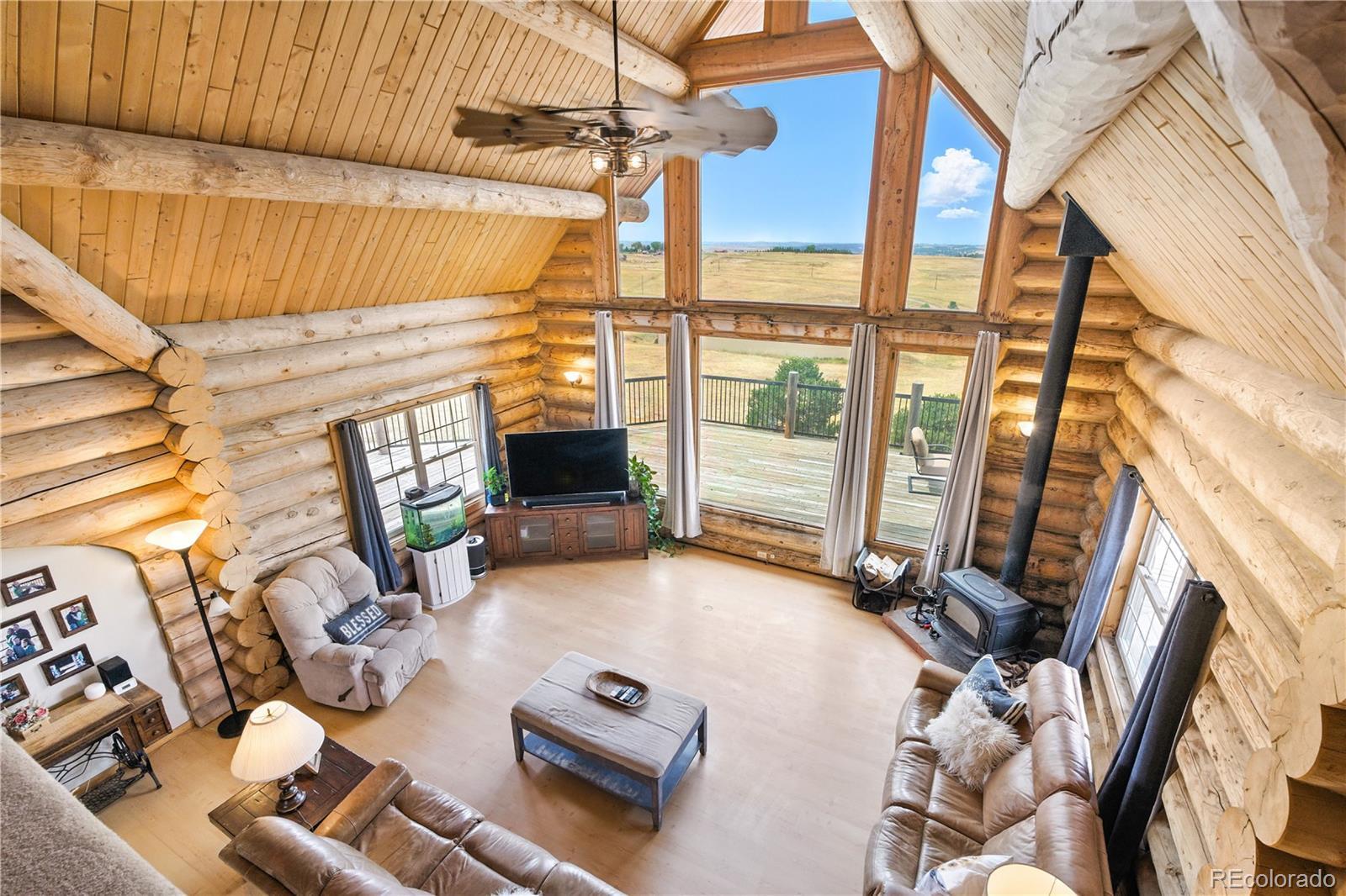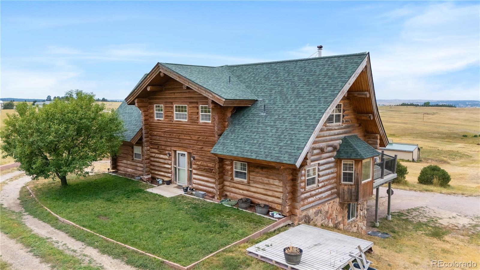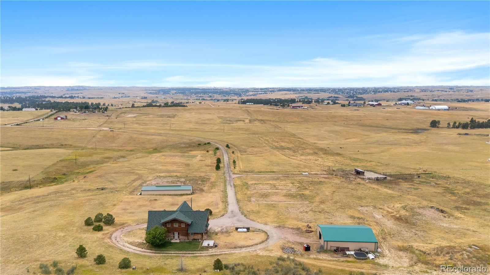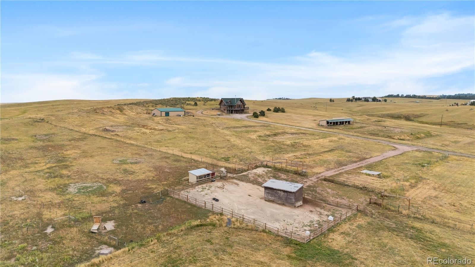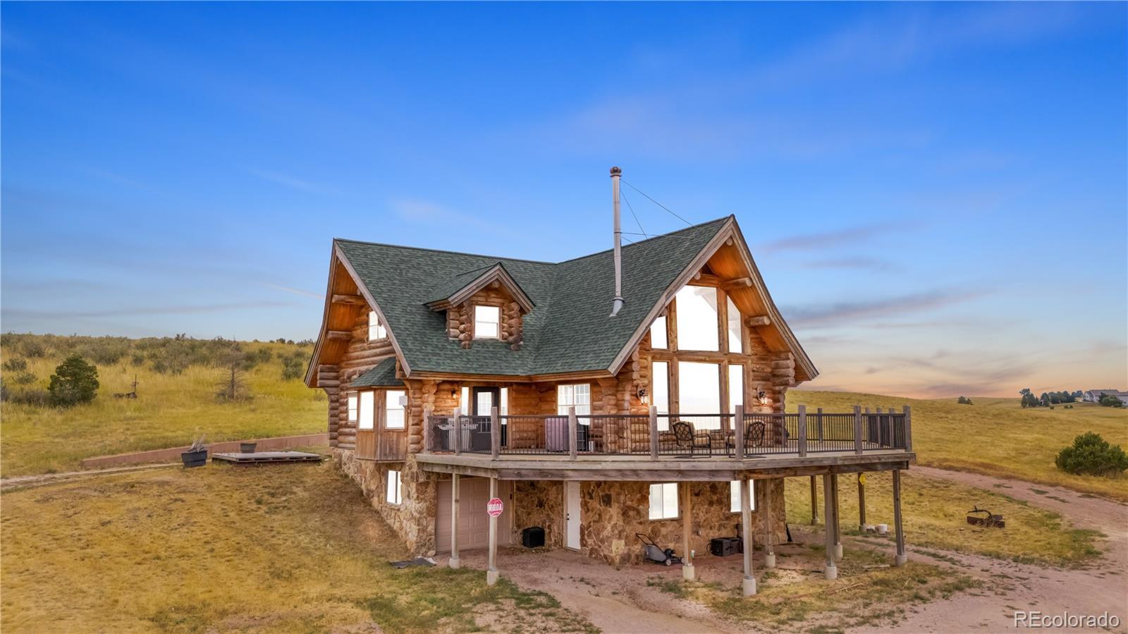 Escape to the wide open spaces of Elbert County with this one-of-a-kind log home retreat on over 35 fully fenced acres in Foxtail Farms. Tucked at the end of a quiet cul-de-sac, this three-bedroom, three-bathroom mountain contemporary offers scenic privacy, panoramic views, and the ultimate in rural living. The soaring great room showcases tongue-and-groove ceilings, hand-hewn logs, and a wall of windows that bathe the home in natural light. The open-concept main level features a spacious primary suite, wood-burning stove, and wraparound deck that invites morning coffee or sunset gatherings. Upstairs, you’ll find two additional bedrooms, a full bath, and a cozy loft overlooking the great room. The unfinished walkout basement provides ample room to expand or customize. This property is ready for your homesteading or ranching dreams, complete with deeded water rights, a private well, and four versatile outbuildings—including two loafing sheds, a stable, and large 2000 square-foot steel barn. Zoned residential with no HOA, the property is ideal for livestock, horses, goats, and more. Whether you’re seeking a peaceful getaway, a hobby farm, or a forever home, this rare opportunity delivers the best of Colorado country living—without compromising comfort or charm.