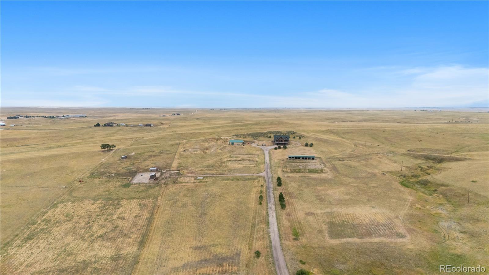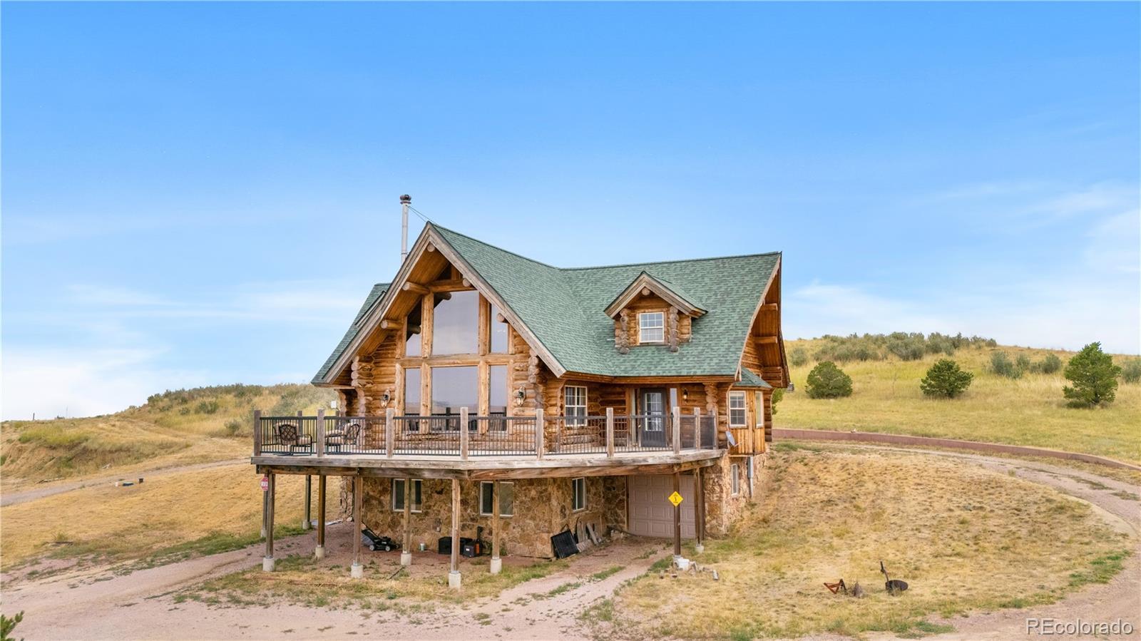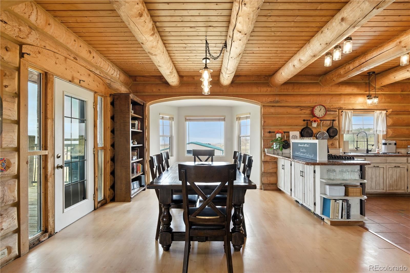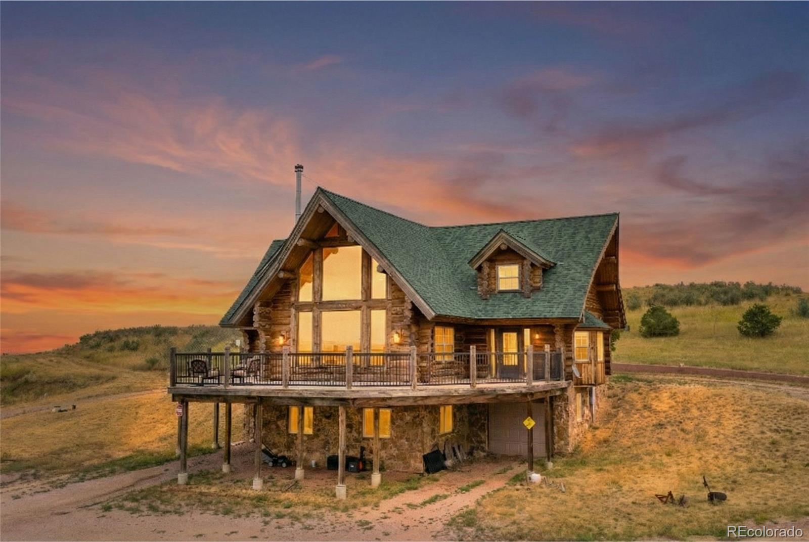 Escape to the wide open spaces of Elbert County with this one-of-a-kind log home retreat on over 35 fully fenced acres in Foxtail Farms. Tucked at the end of a quiet cul-de-sac, this three-bedroom, three-bathroom mountain contemporary offers scenic privacy, panoramic views, and the ultimate in rural living. The soaring great room showcases tongue-and-groove ceilings, hand-hewn logs, and a wall of windows that bathe the home in natural light. The open-concept main level features a spacious primary suite, wood-burning stove, and wraparound deck that invites morning coffee or sunset gatherings. Upstairs, you’ll find two additional bedrooms, a full bath, and a cozy loft overlooking the great room. The unfinished walkout basement provides ample room to expand or customize. This property is ready for your homesteading or ranching dreams, complete with deeded water rights, a private well, and four versatile outbuildings—including two loafing sheds, a stable, and large 2000 square-foot steel barn. Zoned residential with no HOA, the property is ideal for livestock, horses, goats, and more. Whether you’re seeking a peaceful getaway, a hobby farm, or a forever home, this rare opportunity delivers the best of Colorado country living—without compromising comfort or charm.