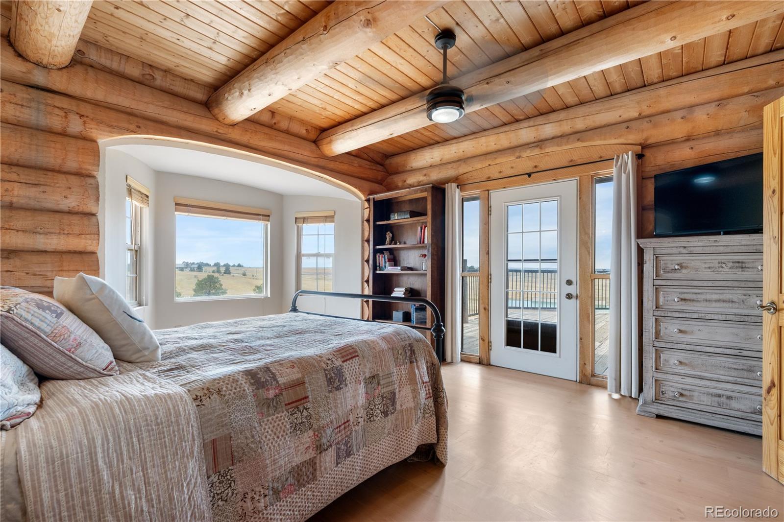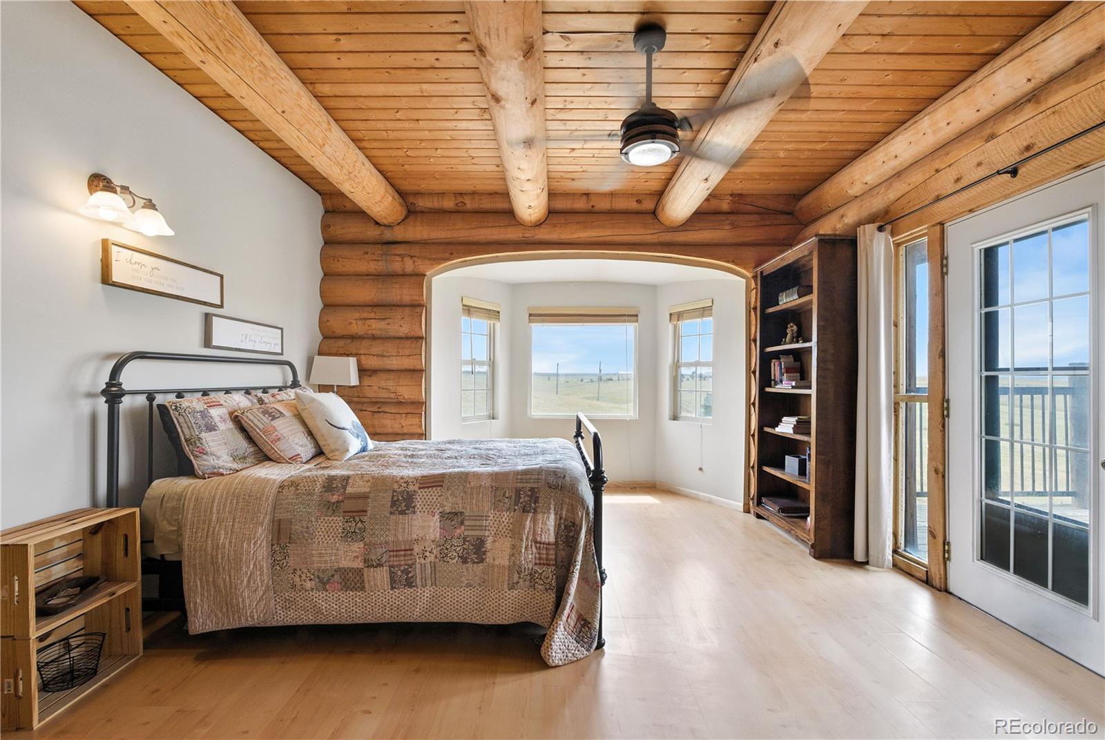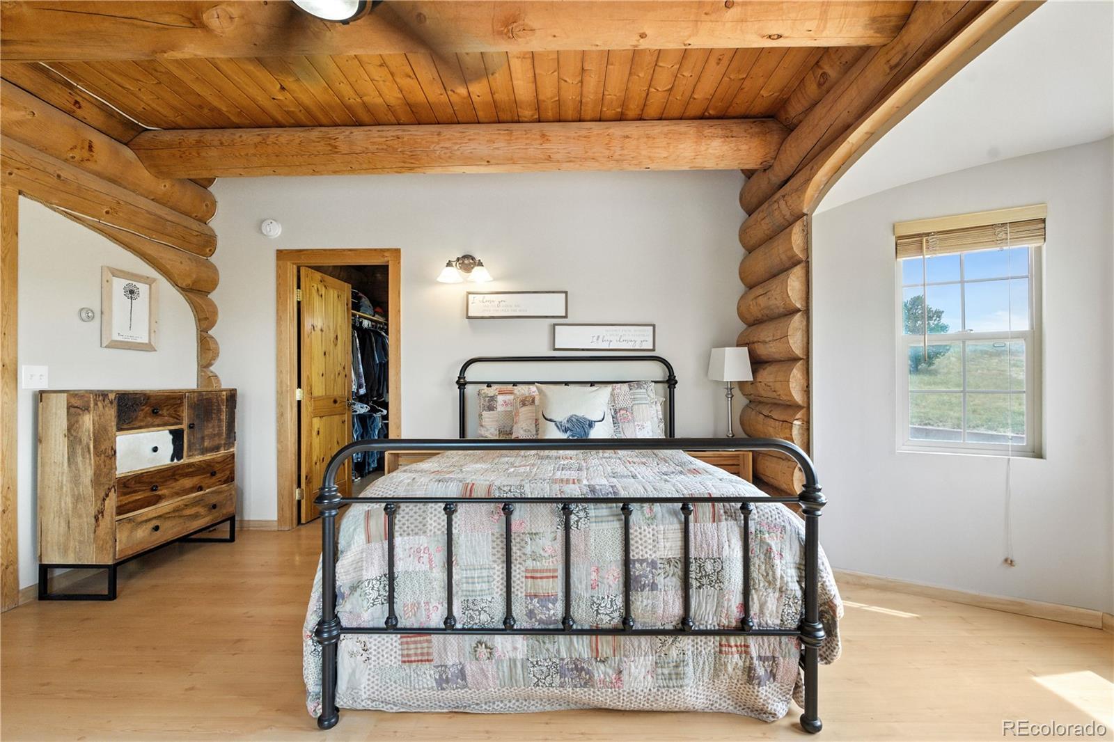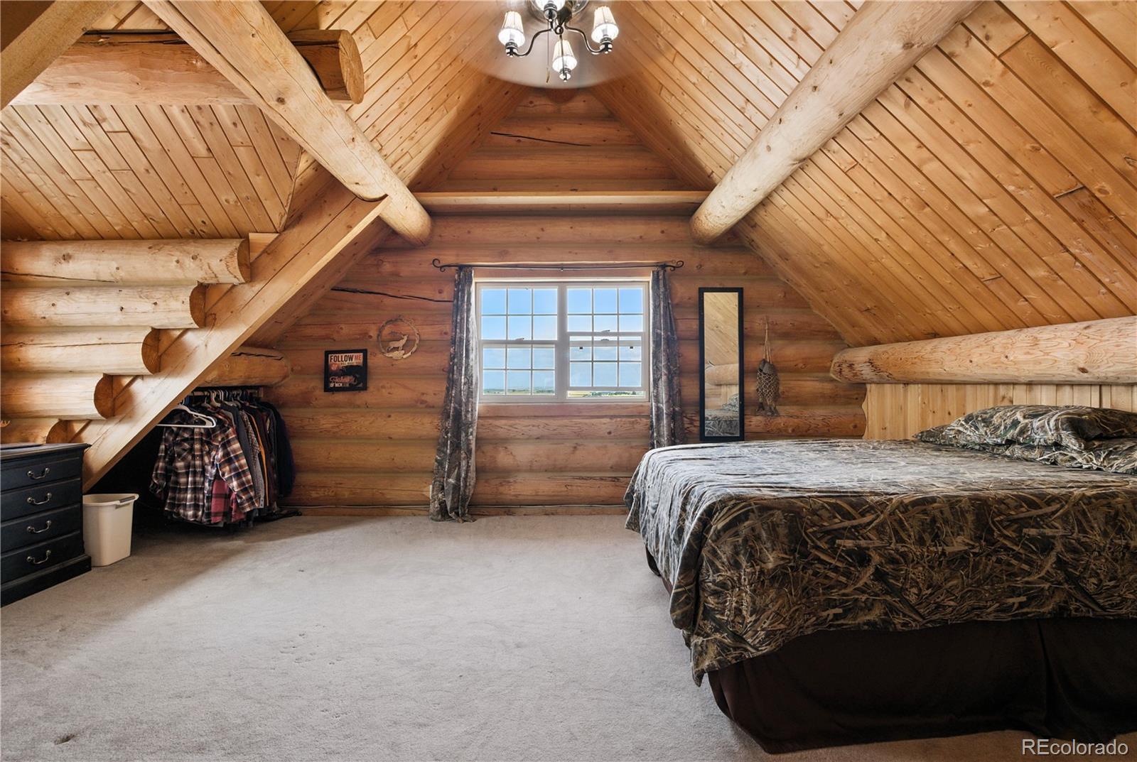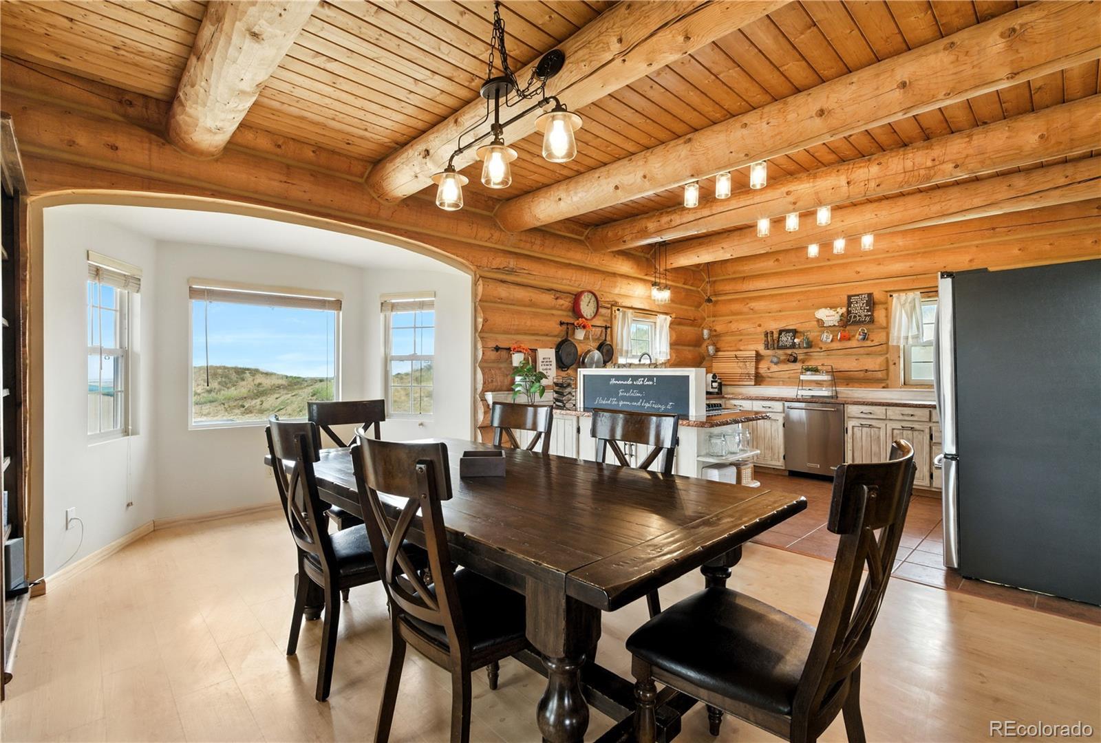 Escape to the wide open spaces of Elbert County with this one-of-a-kind log home retreat on over 35 fully fenced acres in Foxtail Farms. Tucked at the end of a quiet cul-de-sac, this three-bedroom, three-bathroom mountain contemporary offers scenic privacy, panoramic views, and the ultimate in rural living. The soaring great room showcases tongue-and-groove ceilings, hand-hewn logs, and a wall of windows that bathe the home in natural light. The open-concept main level features a spacious primary suite, wood-burning stove, and wraparound deck that invites morning coffee or sunset gatherings. Upstairs, you’ll find two additional bedrooms, a full bath, and a cozy loft overlooking the great room. The unfinished walkout basement provides ample room to expand or customize. This property is ready for your homesteading or ranching dreams, complete with deeded water rights, a private well, and four versatile outbuildings—including two loafing sheds, a stable, and large 2000 square-foot steel barn. Zoned residential with no HOA, the property is ideal for livestock, horses, goats, and more. Whether you’re seeking a peaceful getaway, a hobby farm, or a forever home, this rare opportunity delivers the best of Colorado country living—without compromising comfort or charm.