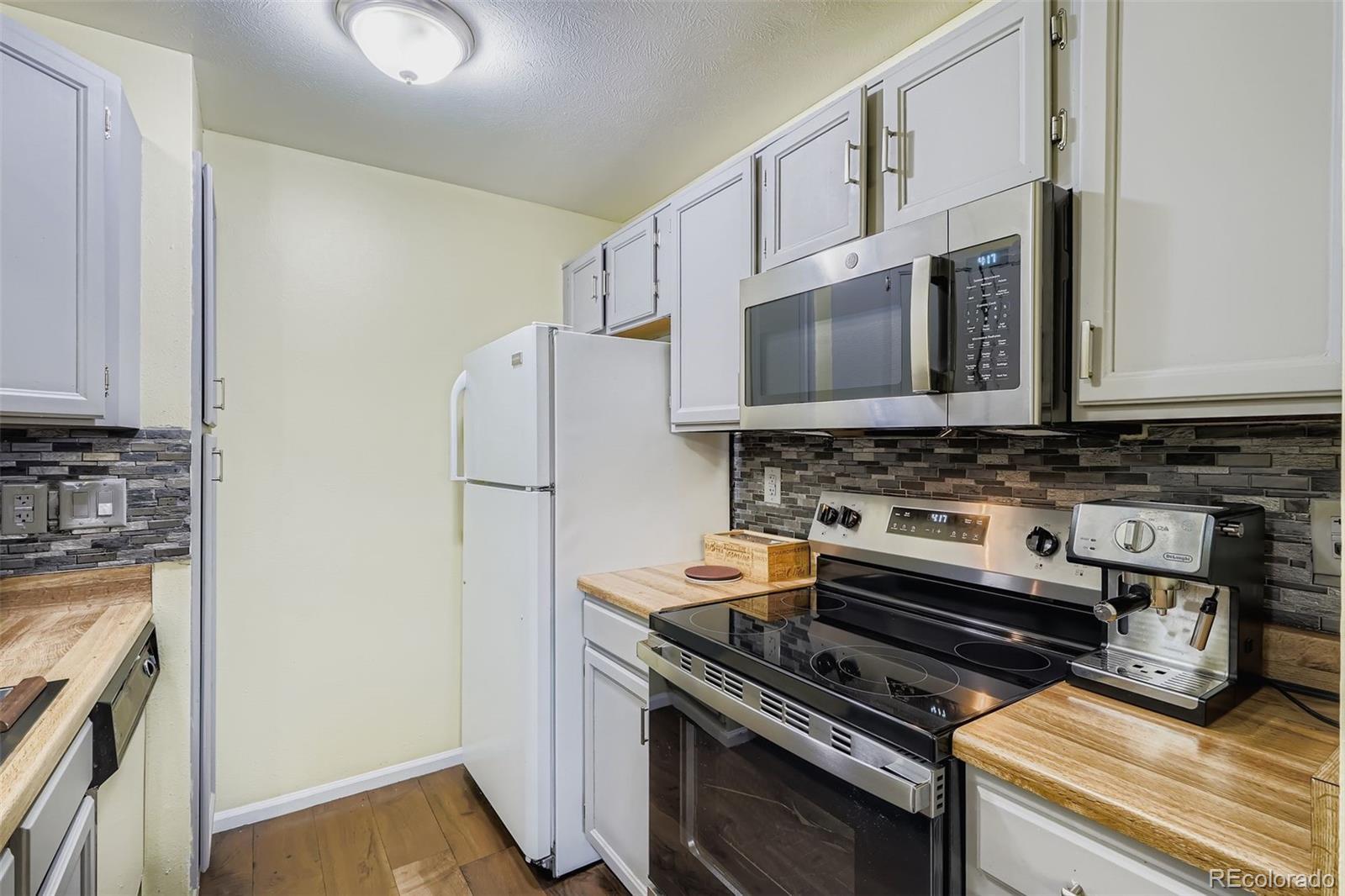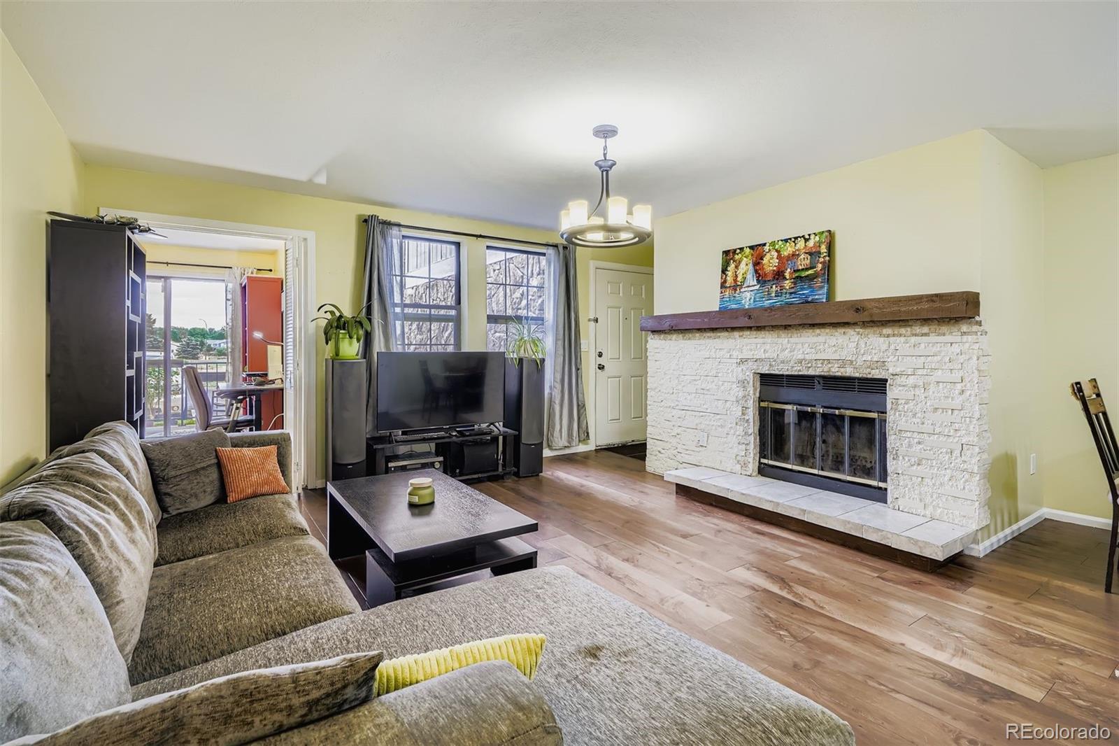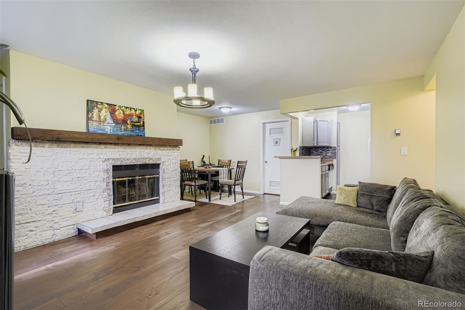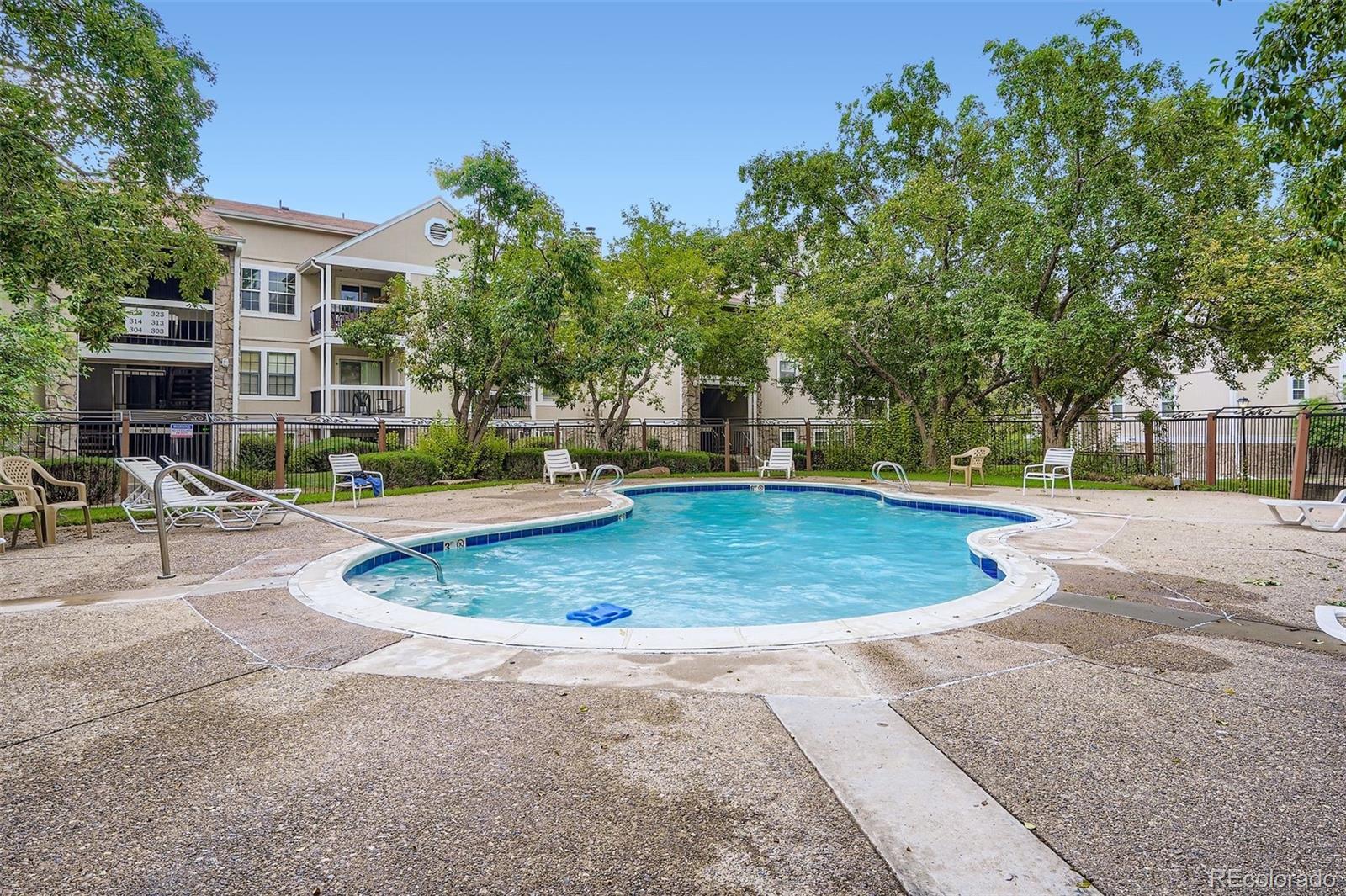 Beautiful Arvada @ Wood Creek, GROUND LEVEL sparkling Condominium... no stairs inside or out, with in-unit laundry! This property has had very few owners since it was built... super quiet, clean, open layout, and convenient, the easy life for certain. Very well-maintained condo with expansive gleaming laminate wood flooring; newer carpet in the primary bedroom; new stone backsplash in the kitchen, newer appliances, newer water heater, and stacked stone fireplace surround with amazing mantle. The rooms are generously sized, and the layout is fantastic with the bathroom having direct on-suite access for the primary bedroom and hallway access for guests. the spaciously covered patio is off the 2nd bedroom and the private storage space is located there. The pool is sparkling clean and beautiful and landscape is lusg and well maintained. Amazing value here! Open space out the front door and patio gate with miles of paved pathways and lawns. (will be completed in dec.) The walk to the light rail is about 30 minutes, to drive is about 5 min; You're close to shopping, parks, restaurants, public library, and the fun downtown Westminster and Olde Town Arvada! Incredible location to so much and an easy drive to the Rocky Mountains just west of this home... amazing location to our amazing Colorado outdoor adventures! Brand new stainless kitchen... refrigerator, dishwasher, range, stunning sink and faucet. New modern lighting at bathroom vanity. Super pretty! Clean, and very well loved and cared for.