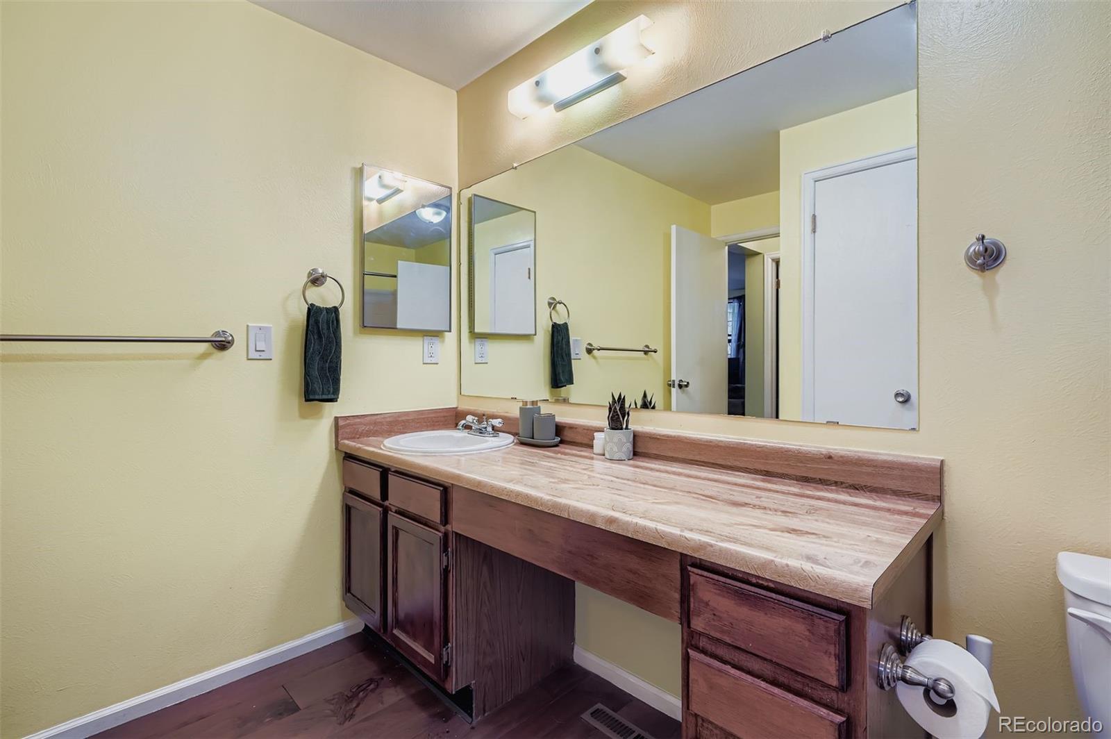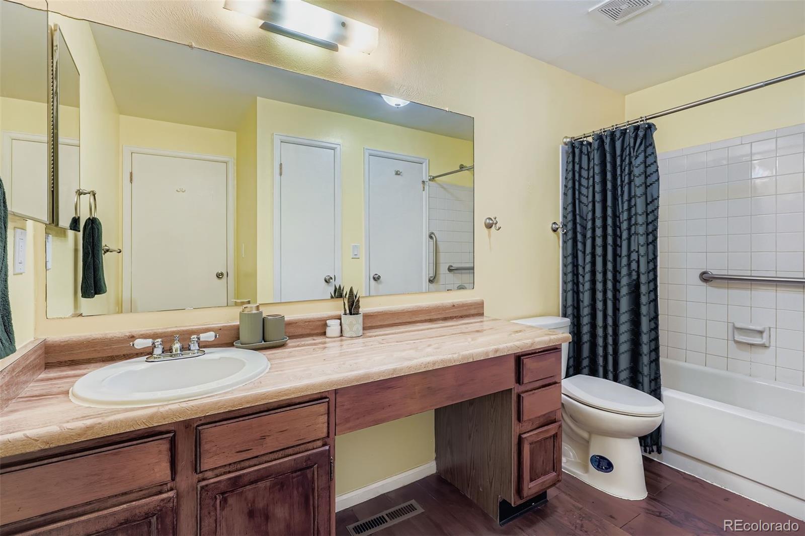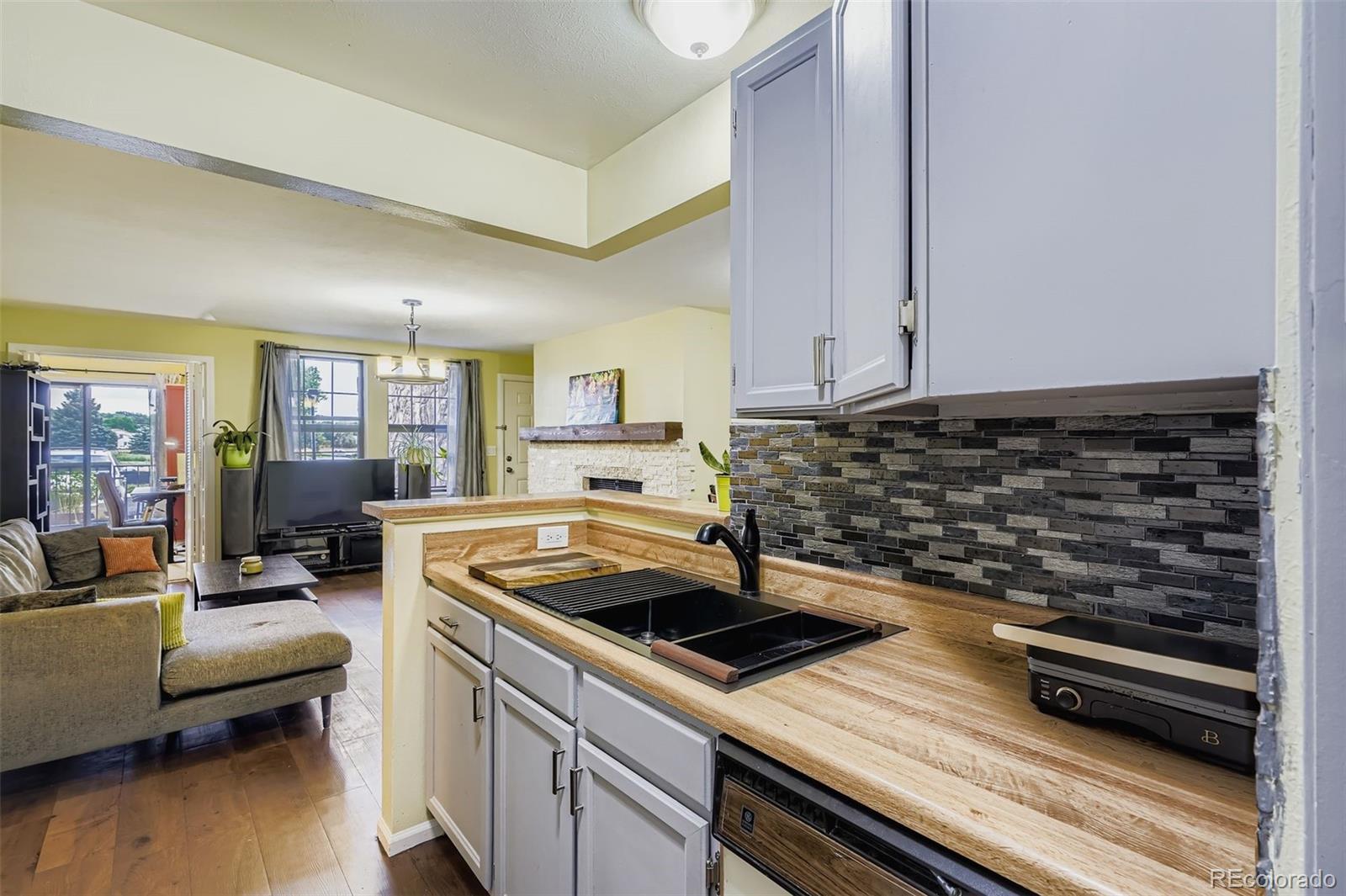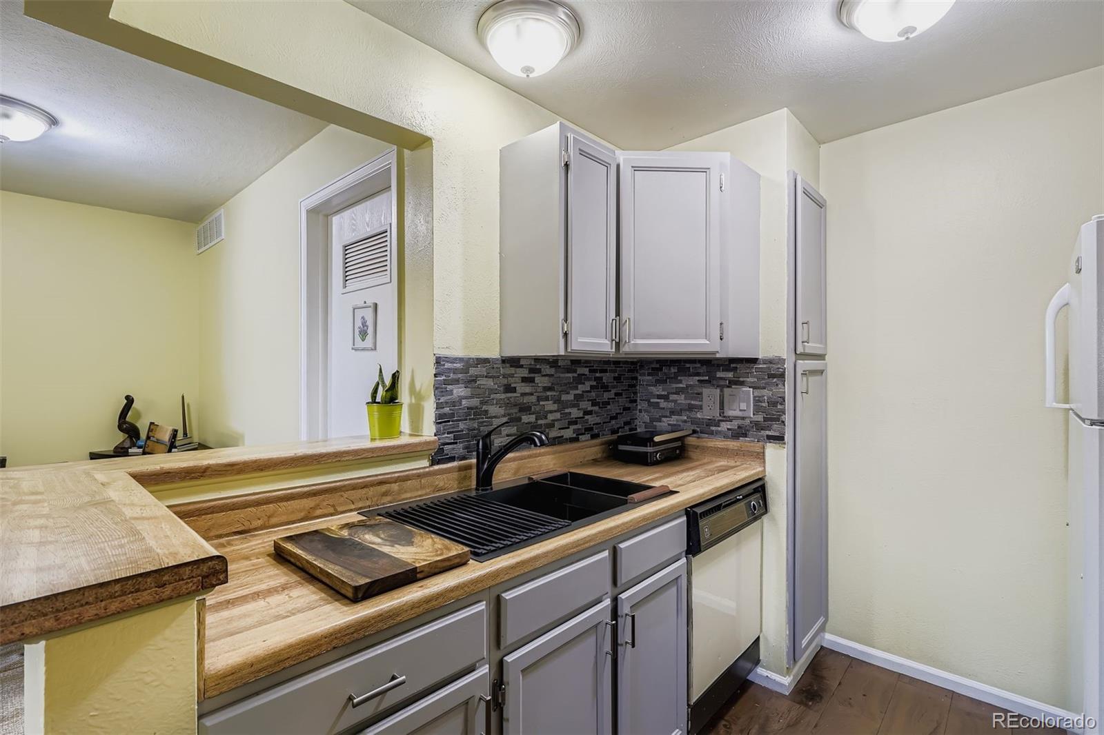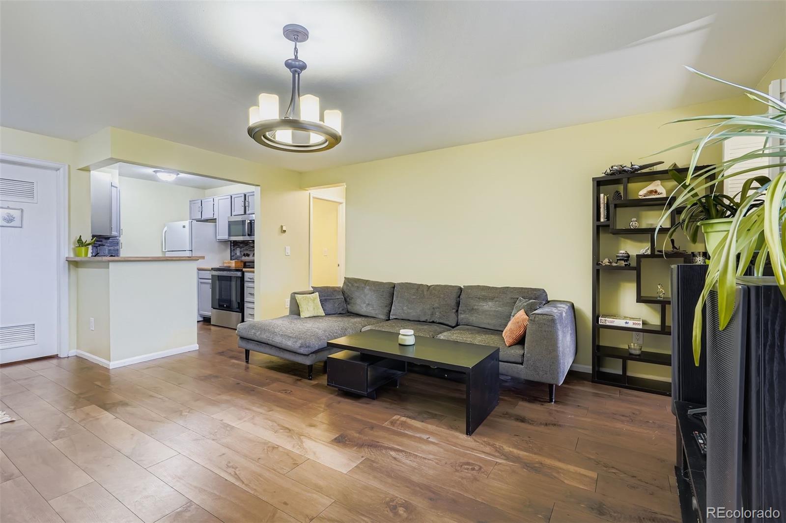 Beautiful Arvada @ Wood Creek, GROUND LEVEL sparkling Condominium... no stairs inside or out, with in-unit laundry! This property has had very few owners since it was built... super quiet, clean, open layout, and convenient, the easy life for certain. Very well-maintained condo with expansive gleaming laminate wood flooring; newer carpet in the primary bedroom; new stone backsplash in the kitchen, newer appliances, newer water heater, and stacked stone fireplace surround with amazing mantle. The rooms are generously sized, and the layout is fantastic with the bathroom having direct on-suite access for the primary bedroom and hallway access for guests. the spaciously covered patio is off the 2nd bedroom and the private storage space is located there. The pool is sparkling clean and beautiful and landscape is lusg and well maintained. Amazing value here! Open space out the front door and patio gate with miles of paved pathways and lawns. (will be completed in dec.) The walk to the light rail is about 30 minutes, to drive is about 5 min; You're close to shopping, parks, restaurants, public library, and the fun downtown Westminster and Olde Town Arvada! Incredible location to so much and an easy drive to the Rocky Mountains just west of this home... amazing location to our amazing Colorado outdoor adventures! Brand new stainless kitchen... refrigerator, dishwasher, range, stunning sink and faucet. New modern lighting at bathroom vanity. Super pretty! Clean, and very well loved and cared for.