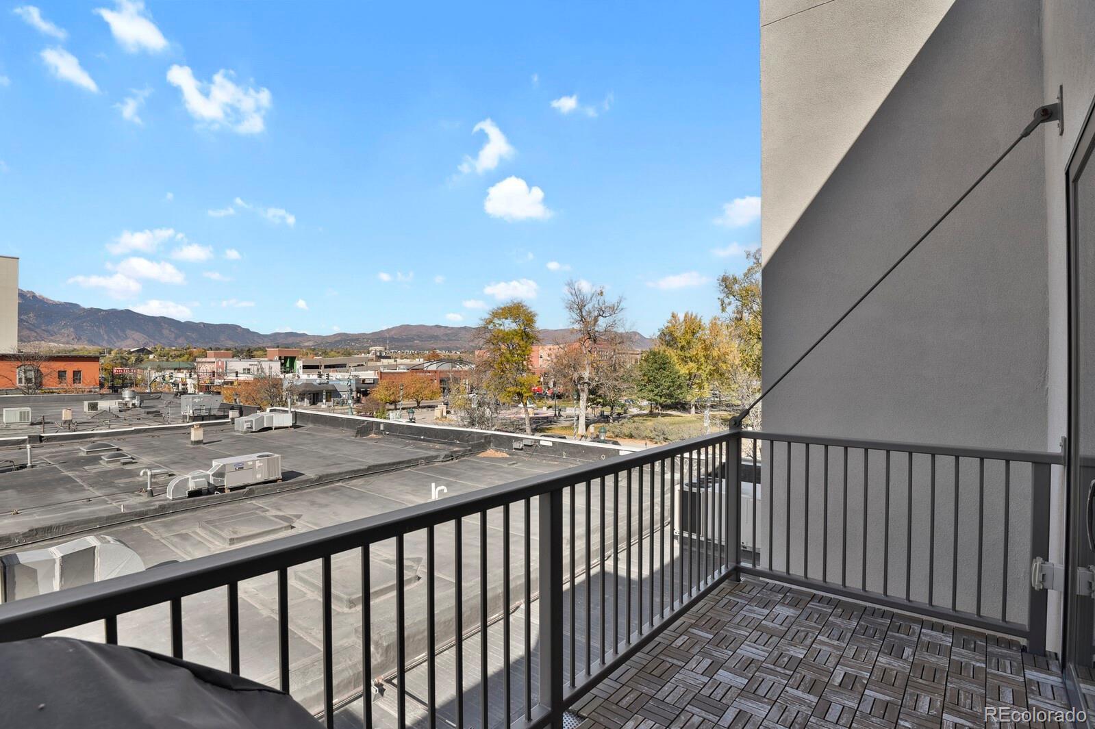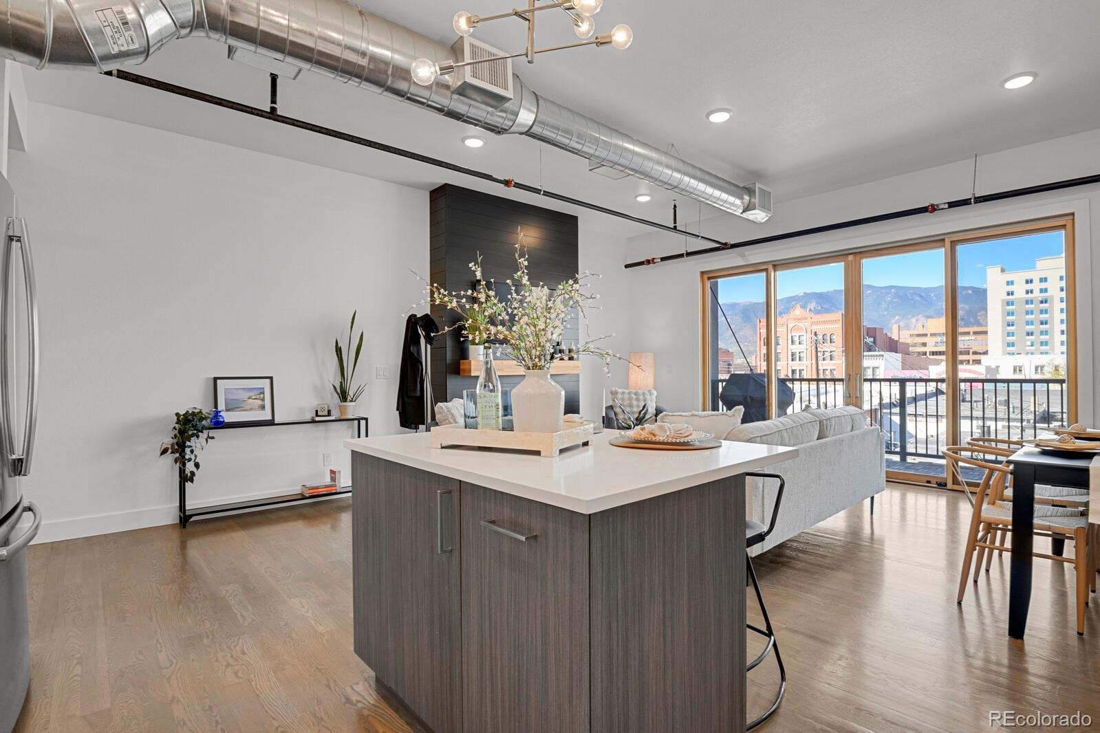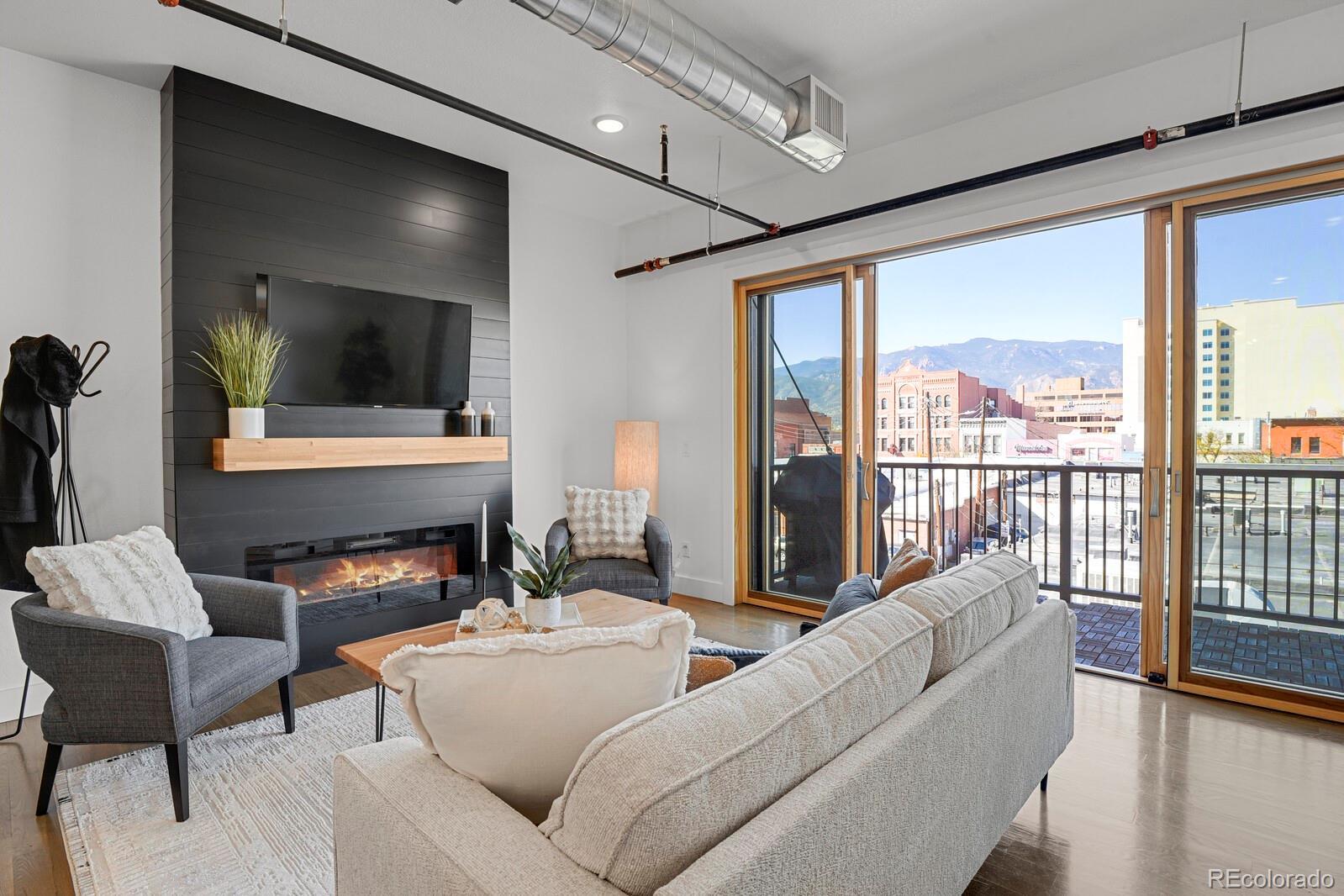 Experience loft living, ideally located across from Acacia Park in the heart of downtown Colorado Springs. Set atop the historic Colburn Motors building, this stunning loft blends modern comfort with urban character. The open floor plan showcases 10’ ceilings, exposed ductwork, and site-finished white oak hardwood flooring throughout. A sleek electric fireplace adds warmth and ambiance to the living area, while the gourmet kitchen impresses with a center island, quartz countertops, custom soft-close cabinetry, tile backsplash, and stainless steel appliances. Enjoy sunset views of the city, mountains and park from your private west-facing balcony. The spacious bedroom offers double lighted closets, wall of shelving ideal for home office space, and convenient in-unit laundry. Unwind in the luxurious bathroom featuring a quartz-topped vanity, tile flooring, and 6’ full wall tiled shower with frameless glass. Additional important features include elevator access, secure access to the building, a deeded parking space in adjacent secure garage, on-site private storage, and ALL utilities are included in HOA dues. Step outside your door to enjoy restaurants, coffee shops, galleries, and downtown events—all just steps away. Urban living at its finest!