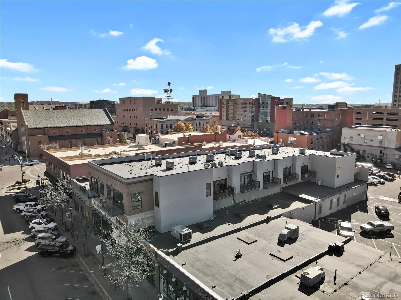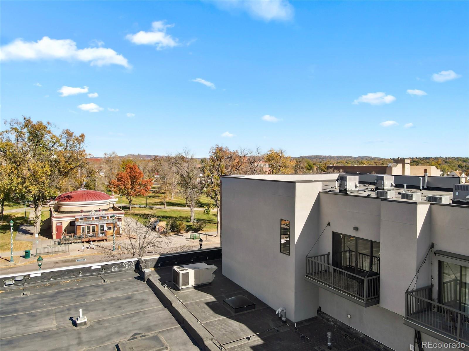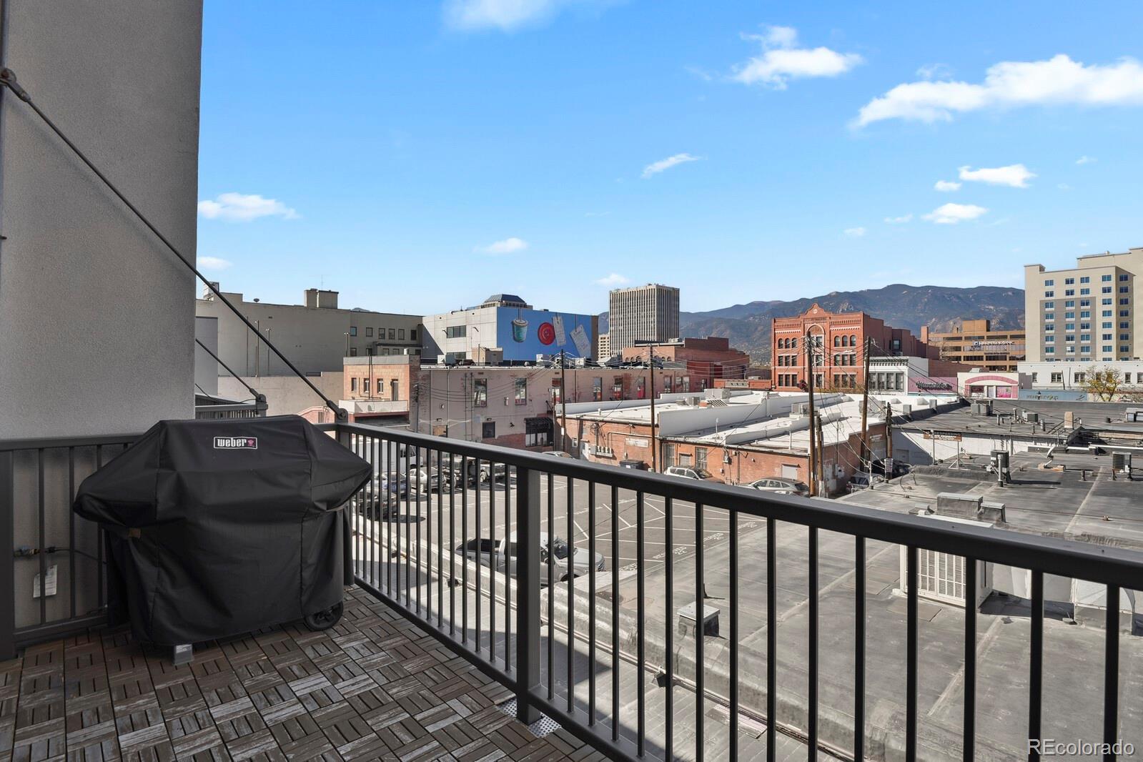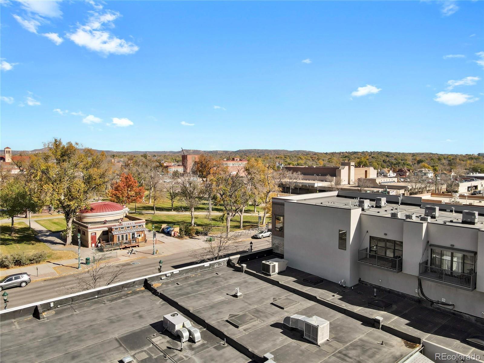 Experience loft living, ideally located across from Acacia Park in the heart of downtown Colorado Springs. Set atop the historic Colburn Motors building, this stunning loft blends modern comfort with urban character. The open floor plan showcases 10’ ceilings, exposed ductwork, and site-finished white oak hardwood flooring throughout. A sleek electric fireplace adds warmth and ambiance to the living area, while the gourmet kitchen impresses with a center island, quartz countertops, custom soft-close cabinetry, tile backsplash, and stainless steel appliances. Enjoy sunset views of the city, mountains and park from your private west-facing balcony. The spacious bedroom offers double lighted closets, wall of shelving ideal for home office space, and convenient in-unit laundry. Unwind in the luxurious bathroom featuring a quartz-topped vanity, tile flooring, and 6’ full wall tiled shower with frameless glass. Additional important features include elevator access, secure access to the building, a deeded parking space in adjacent secure garage, on-site private storage, and ALL utilities are included in HOA dues. Step outside your door to enjoy restaurants, coffee shops, galleries, and downtown events—all just steps away. Urban living at its finest!