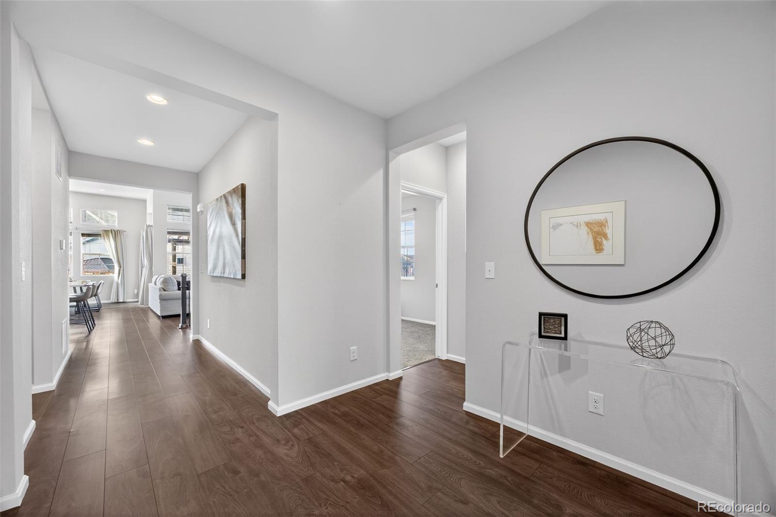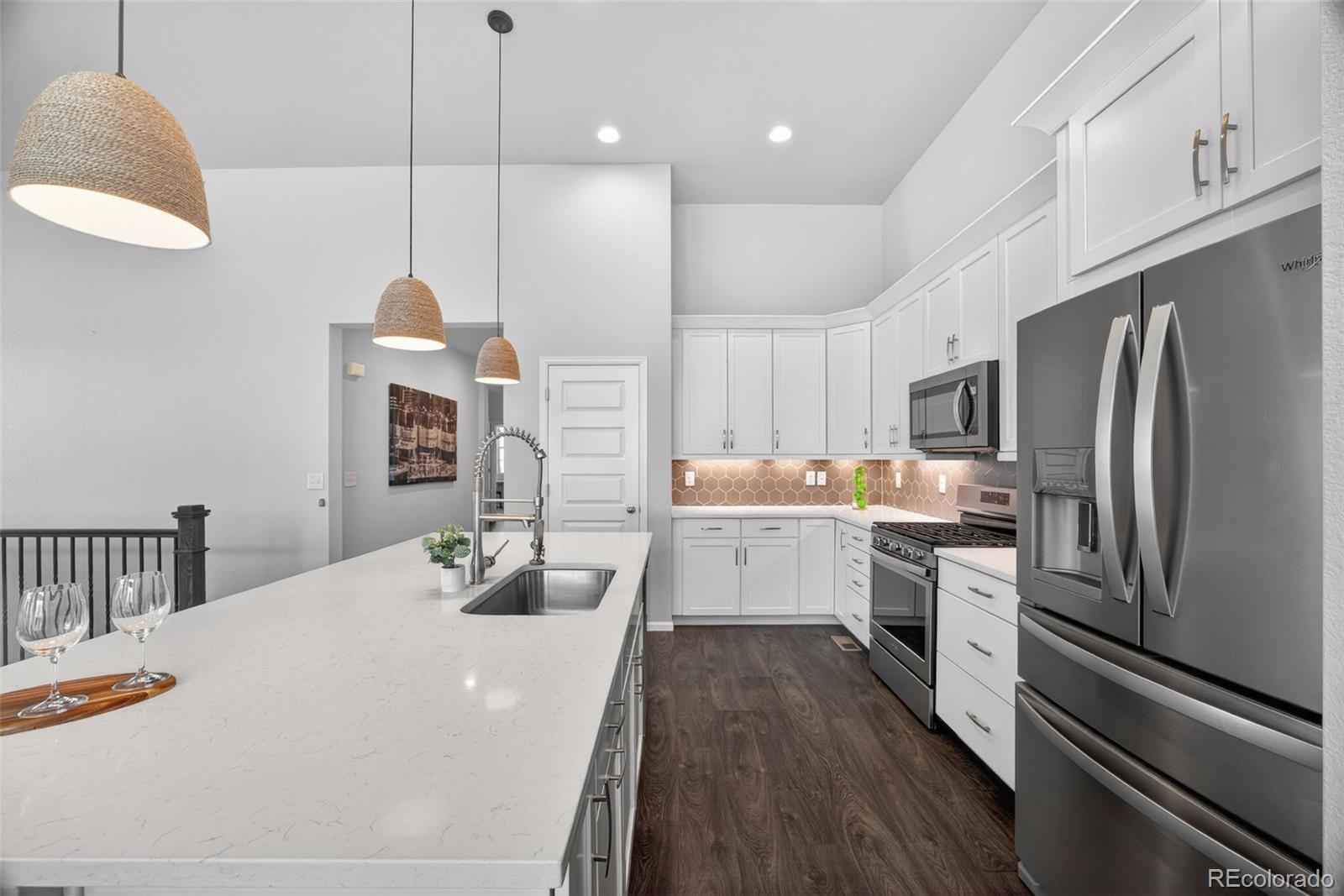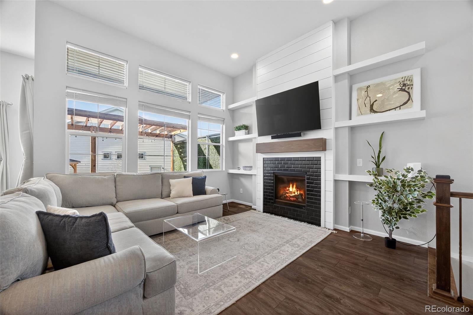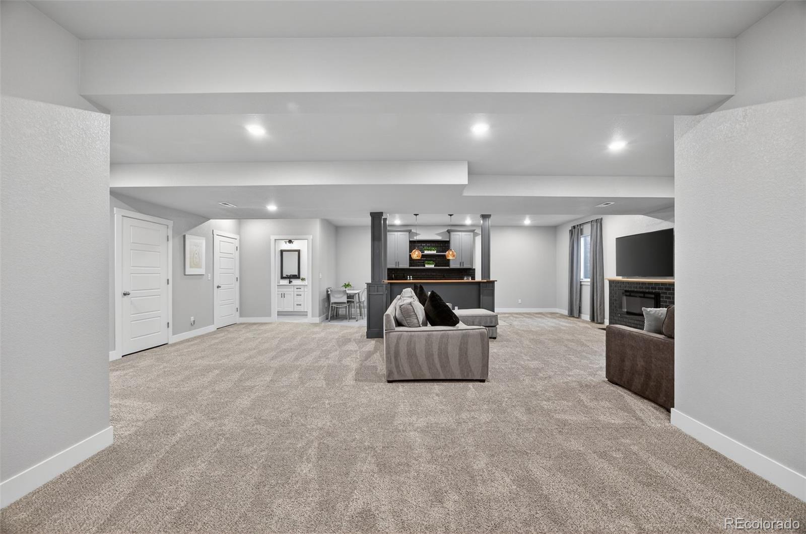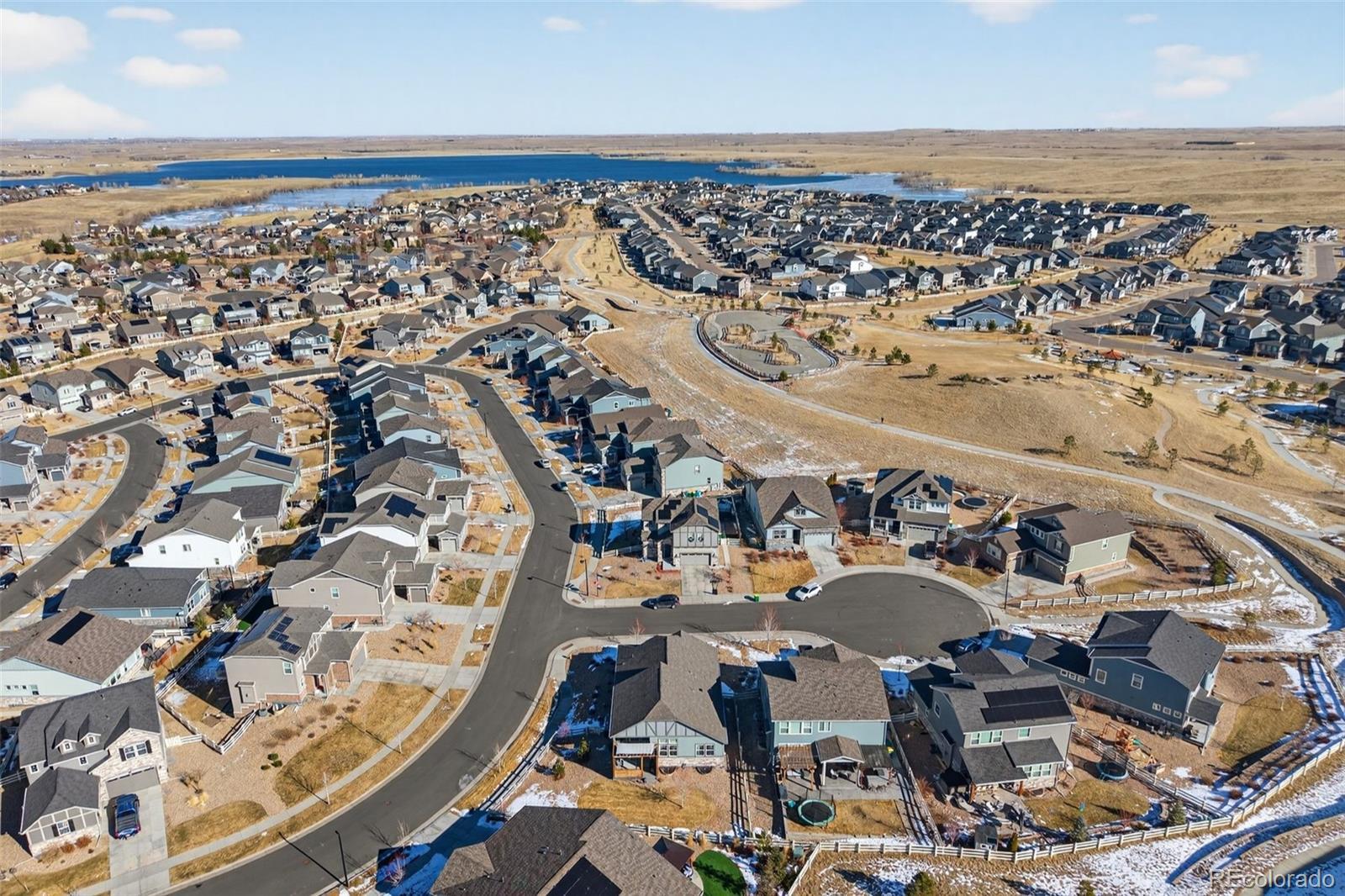 This beautifully appointed 4-bedroom, 3-bath ranch home in Southshore sits on a private corner lot and showcases exceptional design and inviting character. Enjoy true one-level living complemented by an expansive, custom-finished basement. On the main floor, an open layout brings together luxury vinyl plank floors, high ceilings, and plenty of natural light. The kitchen is a true highlight, offering a large center island, stylish pendant lighting, quartz counters, and a gas range, all flowing seamlessly into a roomy dining space perfect for gatherings. A custom fireplace surrounds the living room as a striking focal point. The oversized primary suite includes a five-piece bath with a spacious soaking tub, quartz dual counter tops, and an expansive walk-in closet. On the main floor, you will find two additional bedrooms, a full bath, and a laundry room. The fully finished basement continues the home’s elevated design with an electric fireplace, custom wet bar, complete with pendant lighting, a beverage fridge, and a full-size dishwasher. Downstairs showcases an additional guest bedroom, guest bathroom with quartz counter tops, dual sinks, and a rain shower head. The versatile bonus area—perfect for a home office or potential fifth bedroom— completes the lower level. Step outside to a private, covered seating area enhanced by a pergola and ambient exterior lighting—an ideal space for relaxing or entertaining. Radon Mitigation System installed. The home is conveniently located near the Aurora Reservoir, and Southshore offers an impressive array of amenities, including two community clubhouses, multiple pools, a private boating lake, a dog park, and miles of scenic trails. Residents also enjoy easy access to the reservoir’s swim beach and can walk to nearby Cherry Creek School District elementary, middle, and high schools.