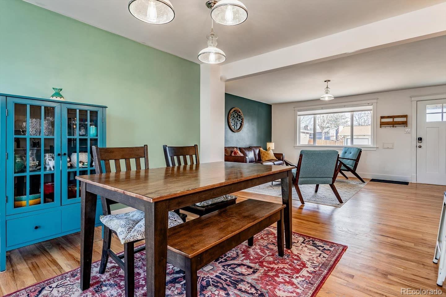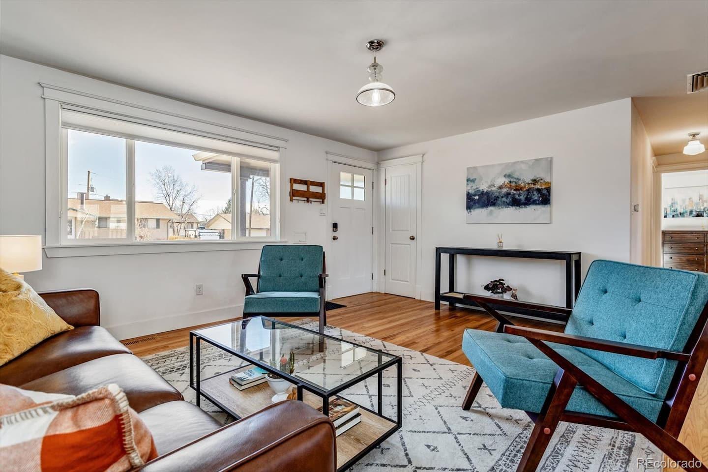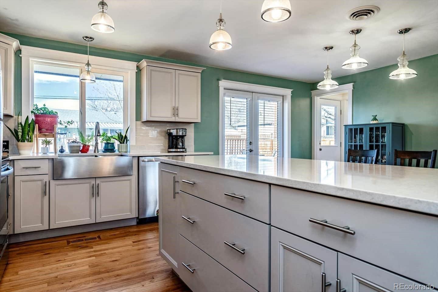 Welcome to 6349 Eaton Court, a beautifully updated ranch home in the desirable Karnes Lake View Estates neighborhood of Arvada. This 4-bedroom, 3-bathroom property offers nearly 2,300 square feet of living space and blends mid-century charm with modern upgrades. The open layout is filled with natural light and features refinished hardwood floors, a fully remodeled kitchen with quartz countertops, stainless steel appliances, and French doors leading to the backyard. Bathrooms have been stylishly updated, and the home includes modern lighting, fresh interior paint, new AC unit and newer windows. Seller is a lender and offering a special rate on his property. Please reach out for more info.