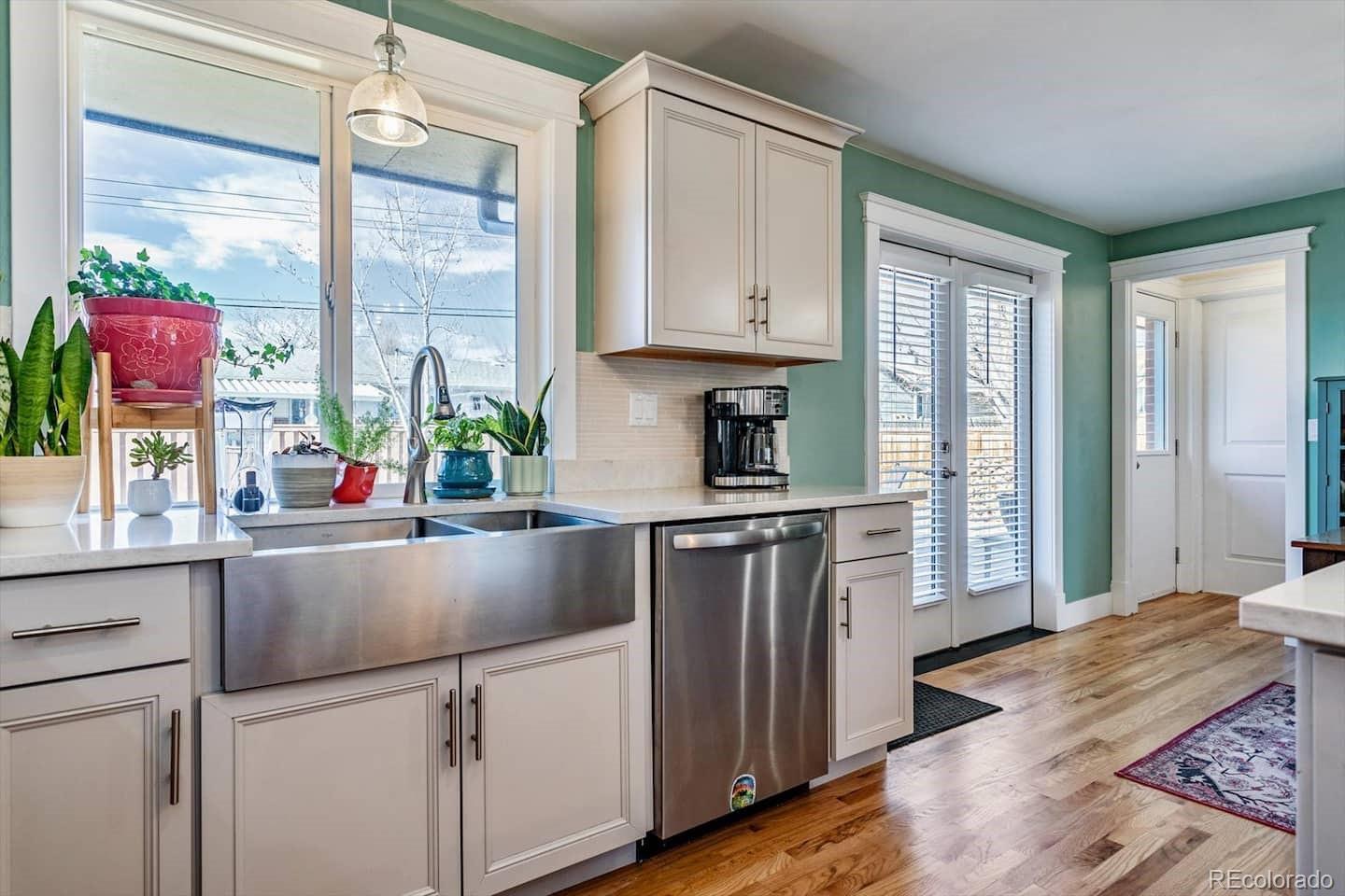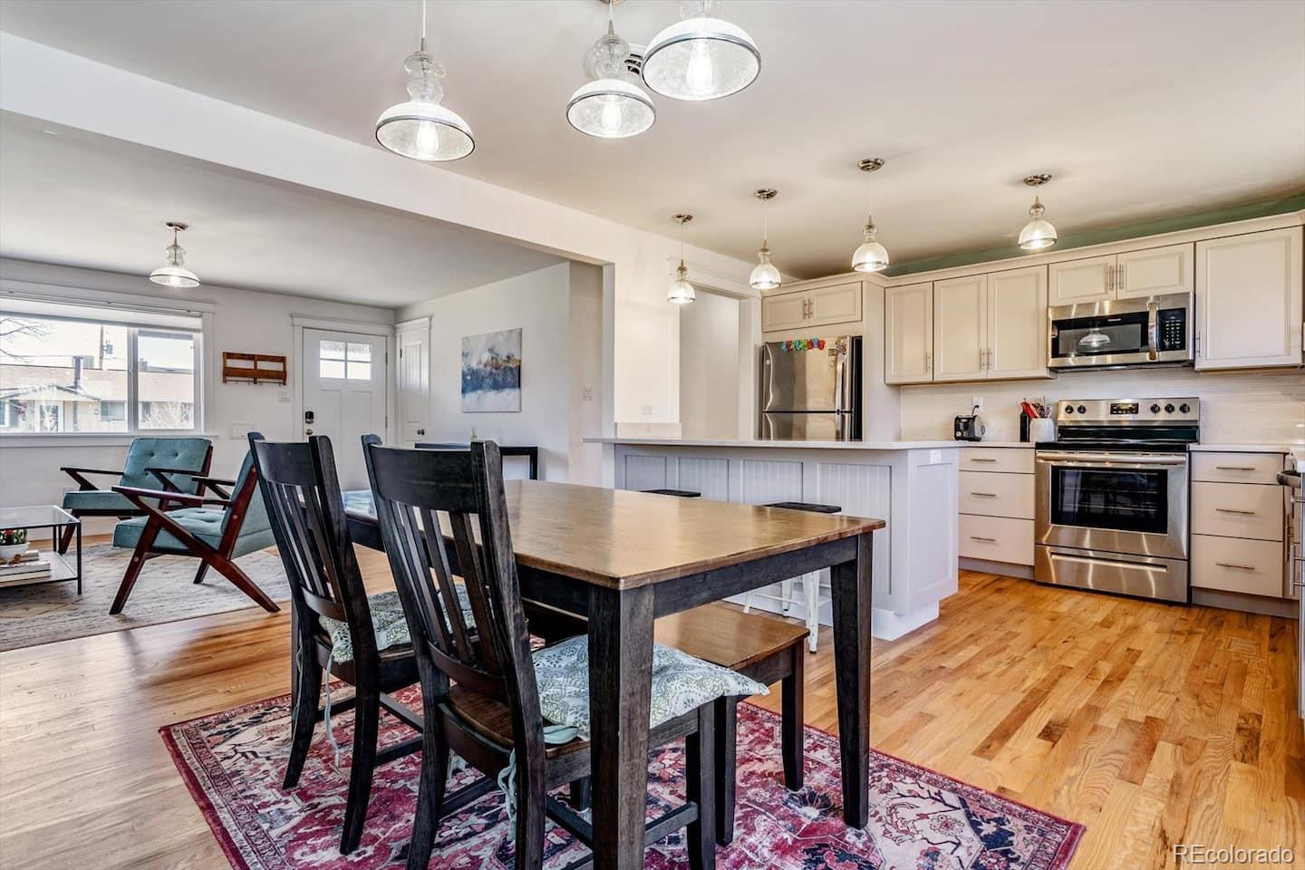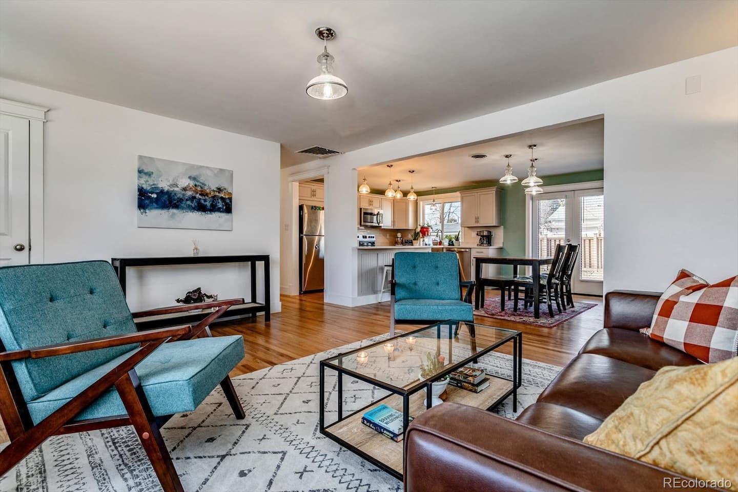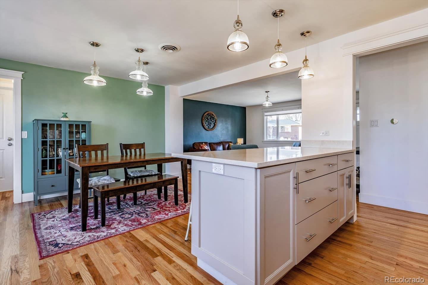 Welcome to 6349 Eaton Court, a beautifully updated ranch home in the desirable Karnes Lake View Estates neighborhood of Arvada. This 4-bedroom, 3-bathroom property offers nearly 2,300 square feet of living space and blends mid-century charm with modern upgrades. The open layout is filled with natural light and features refinished hardwood floors, a fully remodeled kitchen with quartz countertops, stainless steel appliances, and French doors leading to the backyard. Bathrooms have been stylishly updated, and the home includes modern lighting, fresh interior paint, new AC unit and newer windows. Seller is a lender and offering a special rate on his property. Please reach out for more info.