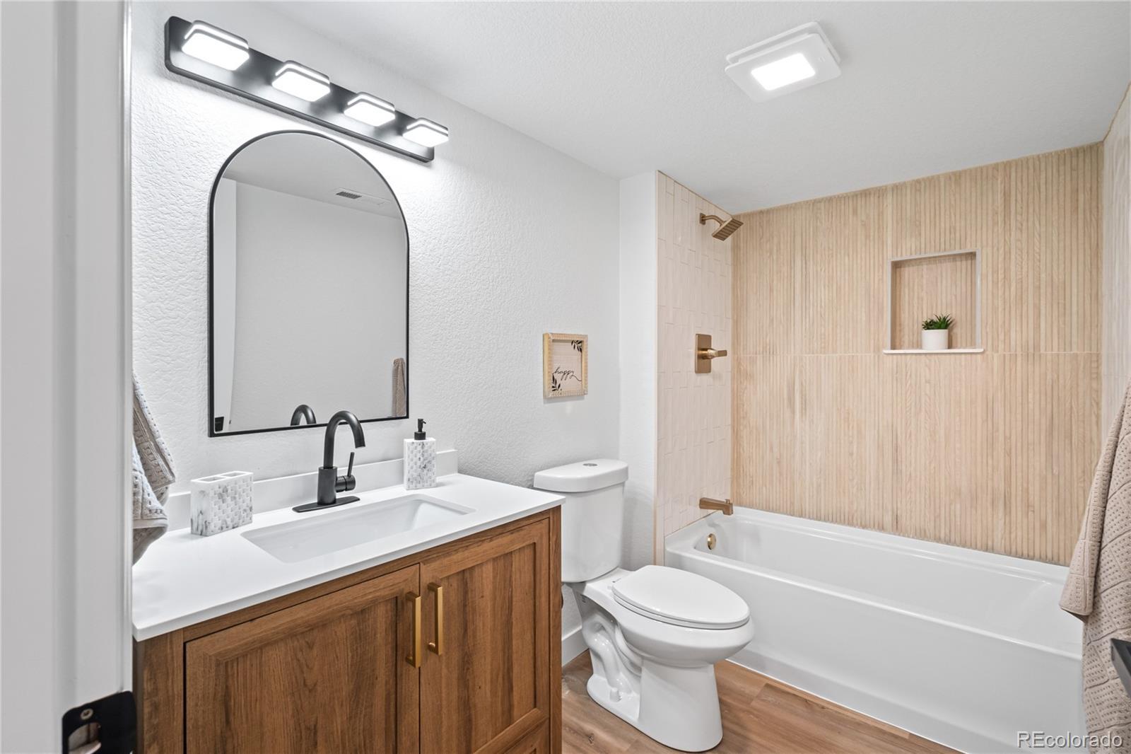 Welcome to this beautifully updated 5-bedroom, 3.5-bath home featuring a versatile layout and modern upgrades throughout. The private lower-level suite offers its own mini kitchenette, laundry, full bath, and living room — with flexible door configurations allowing it to function as a one- or two-bedroom space. Perfect for independent living, a mother-in-law suite, or even a rental opportunity. Recent updates include a new A/C, water heater, hardwood flooring, carpet, and fresh interior/exterior paint. The home boasts renovated bathrooms, newer stainless steel appliances, quartz countertops with a full-height backsplash, and white shaker soft-close cabinets. Enjoy thoughtful design touches like a fireplace, vaulted ceilings, LED lighting with secondary night-light features, designer floor-to-ceiling tile, and an undermount kitchen sink. Step outside to a large back deck, refreshed landscaping, and a storage shed, making this home move-in ready inside and out.