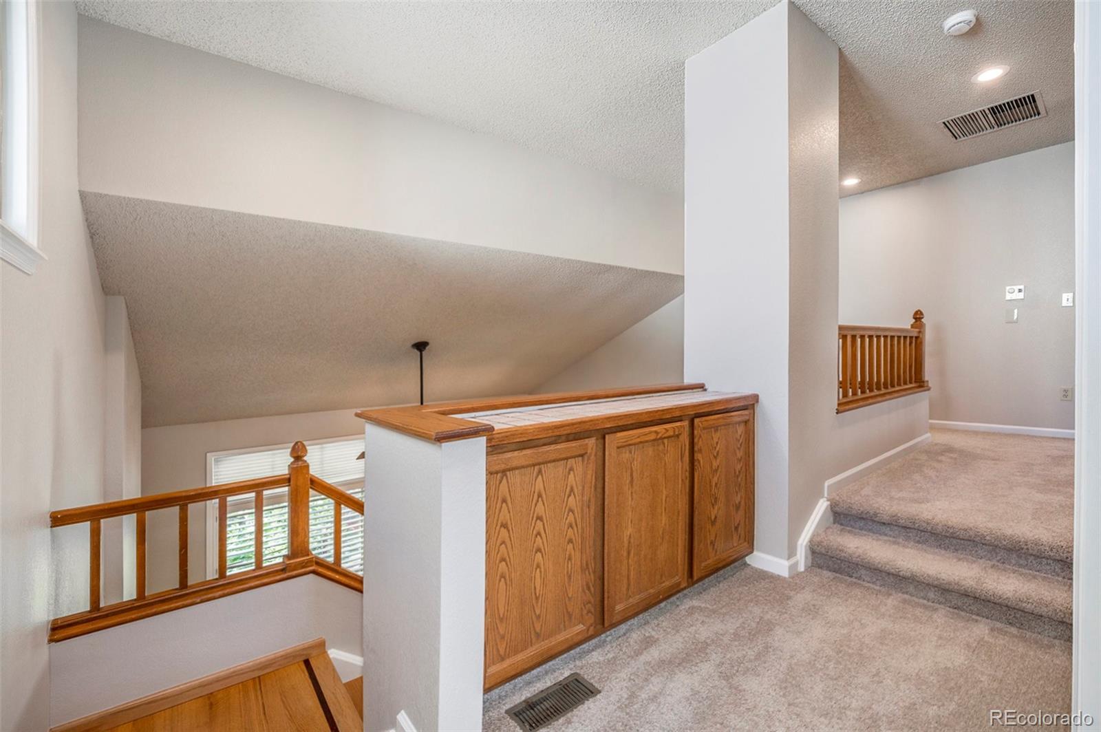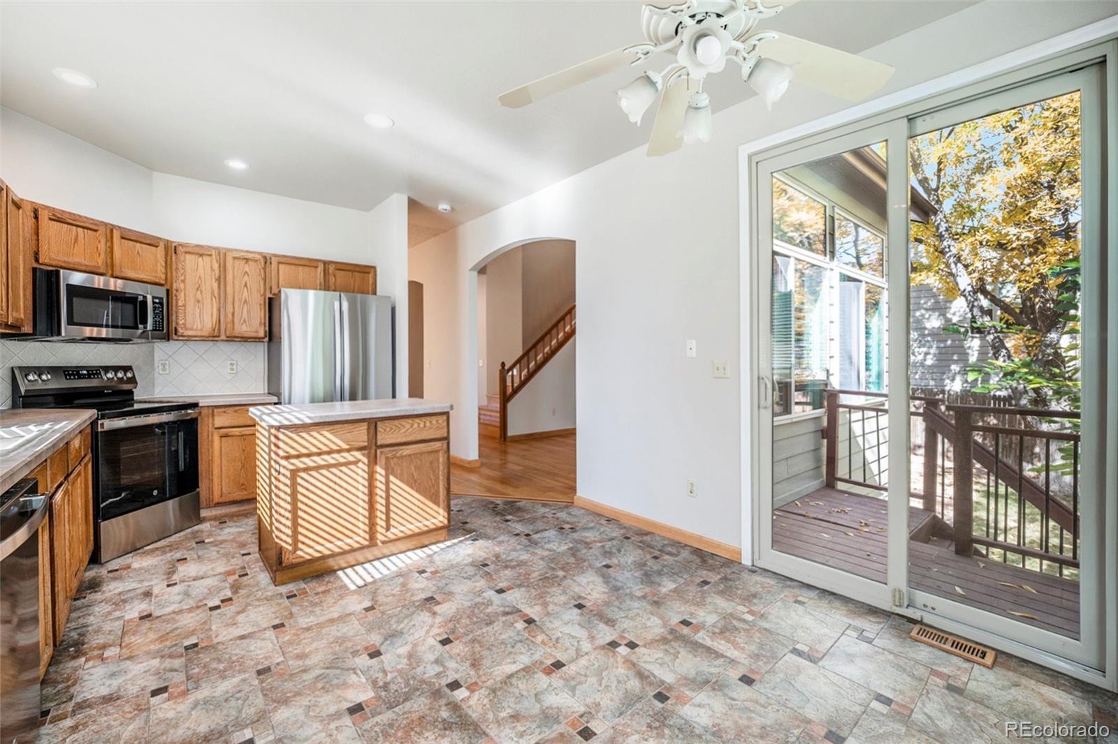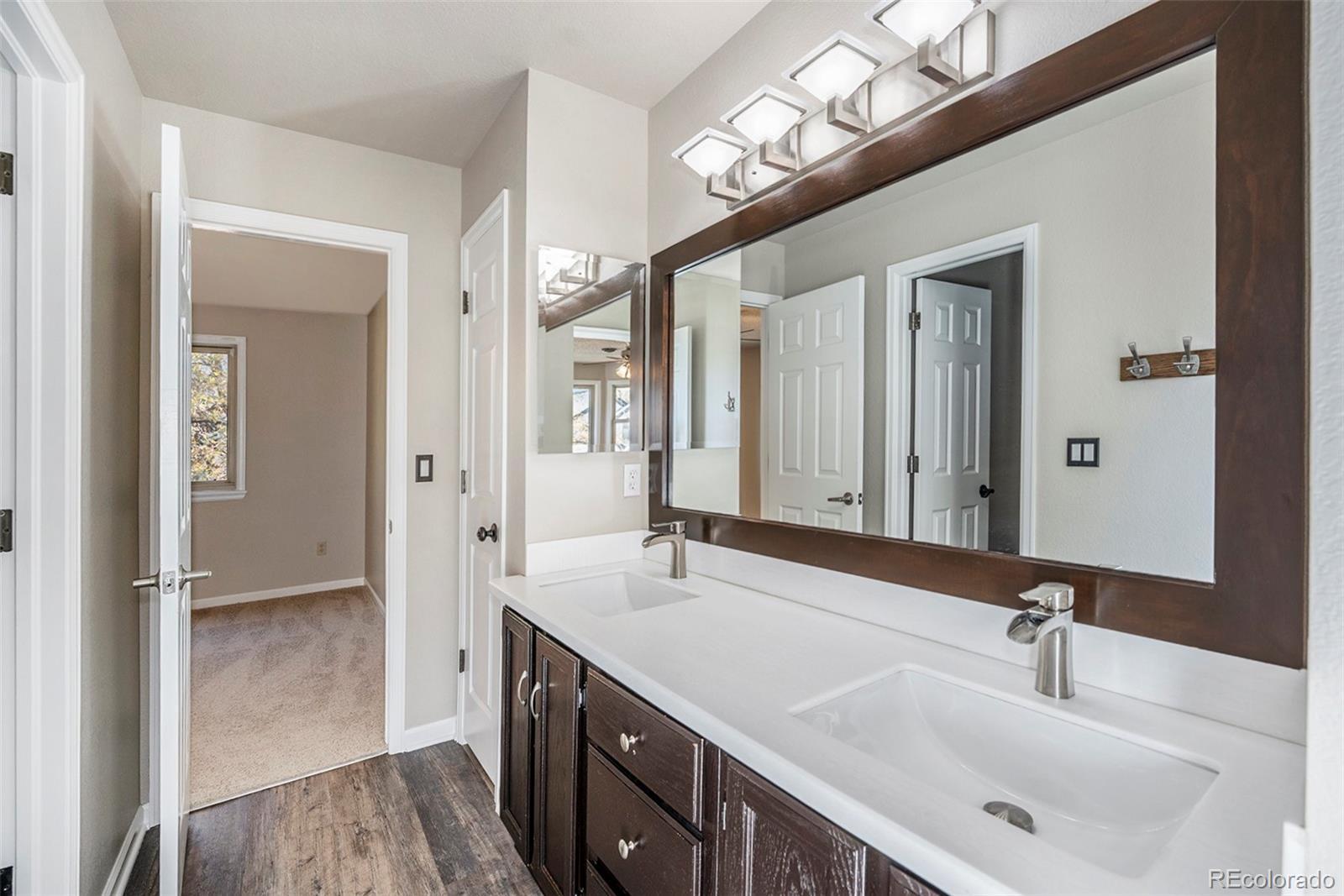 Welcome to this charming 5-bedroom, 3-bathroom home in the highly desired Green Mountain neighborhood. Step inside to find all-new interior paint, new carpet, and brand-new stainless steel appliances, giving the home a fresh and move-in-ready feel. The open floor plan is filled with natural light and features hardwood floors throughout the main level. A main-floor bedroom and remodeled ¾ bath offer ideal flexibility for guests or a home office. The spacious great room off the kitchen boasts vaulted ceilings and a cozy gas fireplace, creating a warm and inviting atmosphere. Convenient main-floor laundry adds everyday ease. Upstairs, you’ll find two large bedrooms connected by an updated Jack-and-Jill bathroom, plus a primary suite with a walk-in closet and a five-piece bath for the perfect private retreat. The finished basement provides additional living space with a family room, fourth bedroom, and utility/storage area. Step outside to your private backyard, featuring a large deck, mature trees, and plenty of space for year-round entertaining or relaxing. Two car garage plus an extended side driveway for more space. Just minutes from Green Mountain, outdoor adventure is right at your doorstep. Explore all the nearby trails or spend the day at Bear Creek Lake Park—a 2,600-acre outdoor paradise for paddle boarding, camping, horseback riding, and more. Check out the video link; https://listings.nextdoorphotos.com/vd/218594531