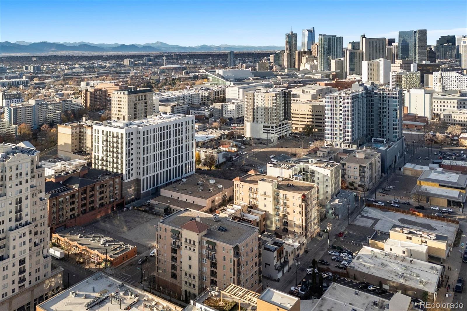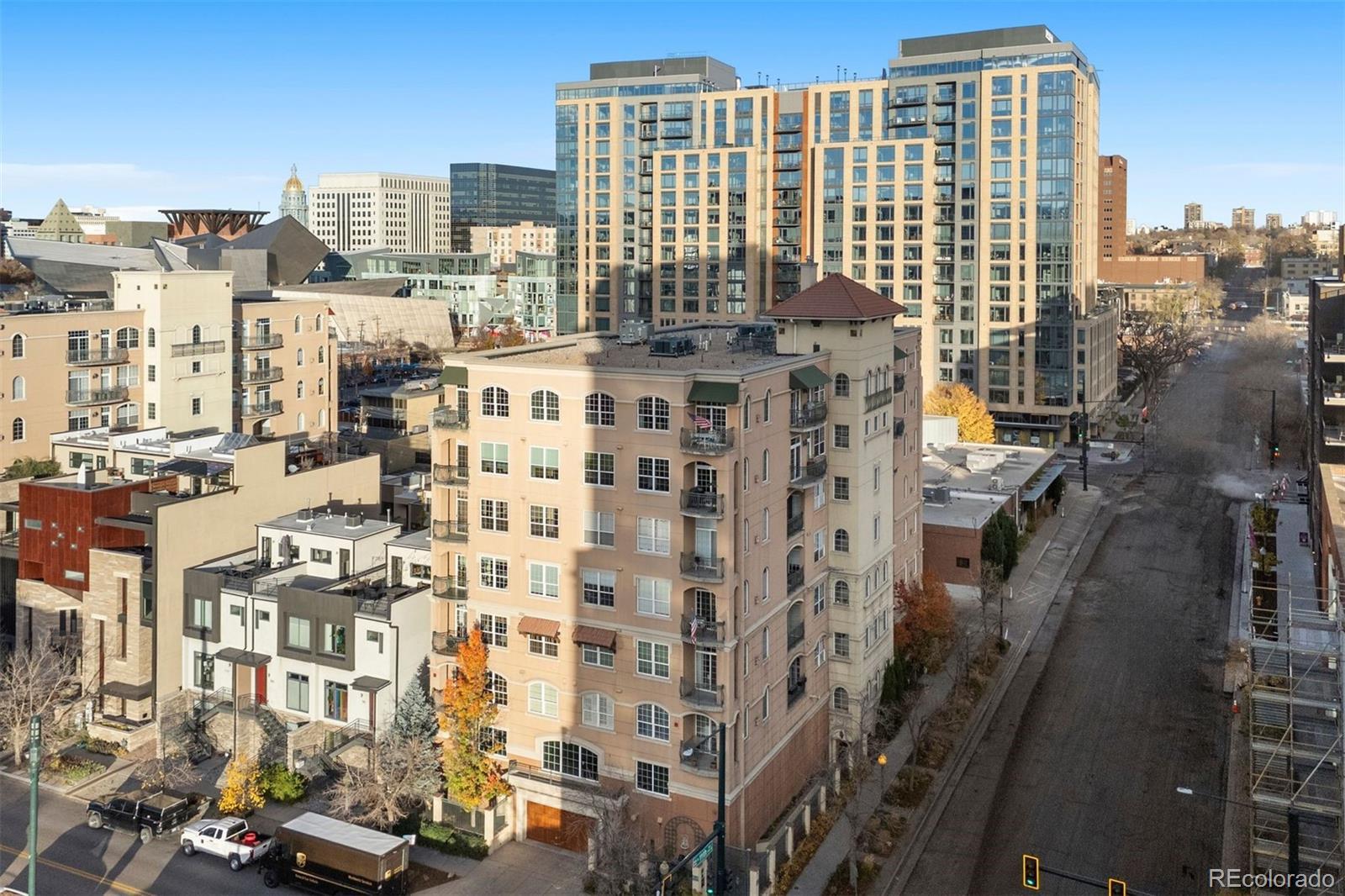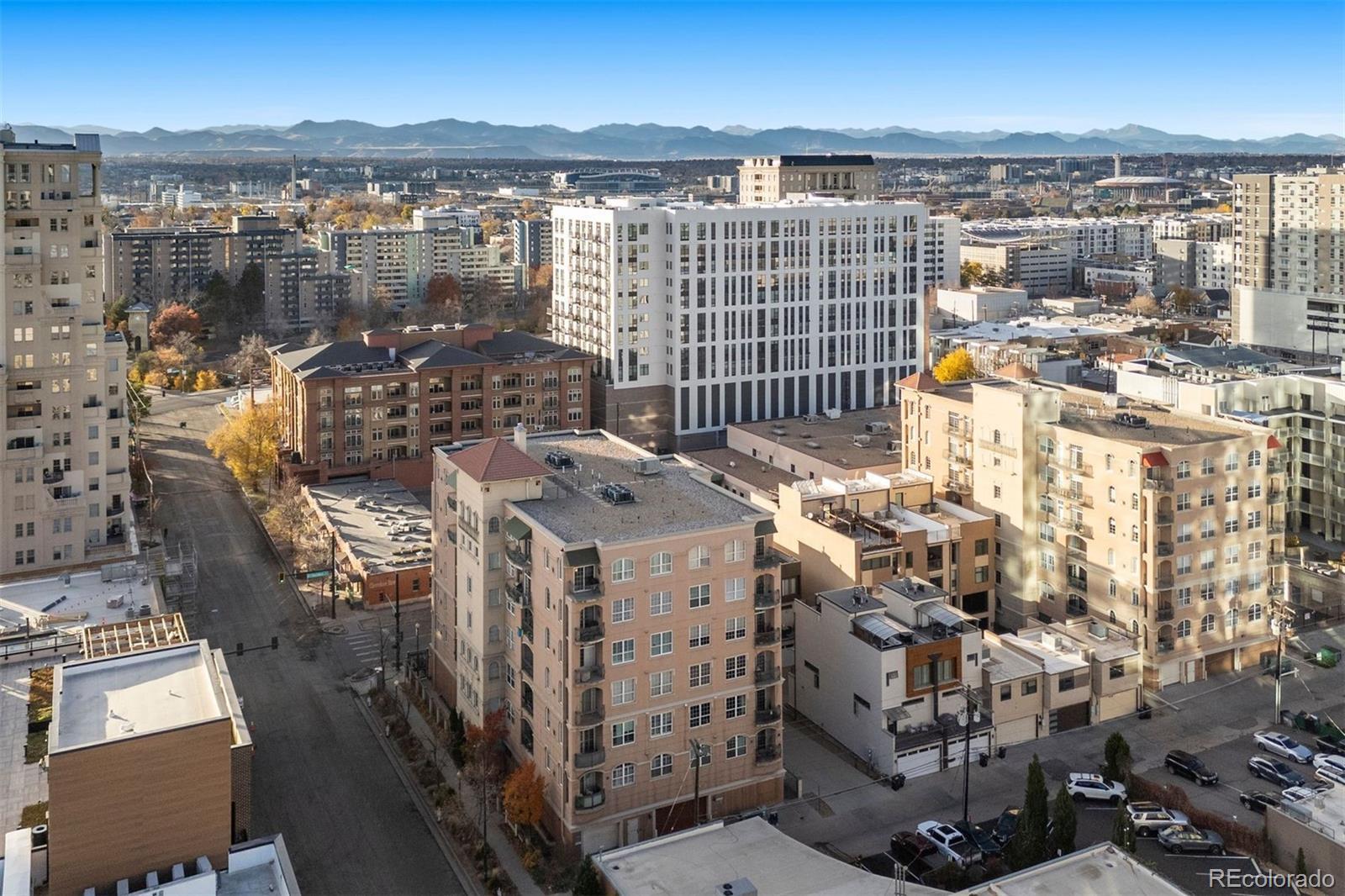 Flooded with natural light, this beautifully appointed penthouse residence offers an exceptional blend of comfort, function, and timeless style. The open-concept living area is anchored by a stately gas fireplace, while oversized windows with classic shutters frame sweeping city and mountain views to the East, South and West. Hardwood flooring throughout adds warmth, continuity, and an understated elegance. The thoughtfully designed kitchen showcases generous counter space, a large center island with seating, and abundant custom cabinetry—equally suited for casual mornings or sophisticated entertaining. Quartz surfaces, new Bosch stainless steel appliances, and refined pendant lighting elevate the space, while the seamless connection to the living and dining areas enhances flow and livability. A dedicated dining area comfortably accommodates formal gatherings and opens to one of two private balconies, creating an indoor-outdoor experience. Neutral finishes throughout provide a timeless backdrop for effortless personalization, while quartz and marble surfaces in the kitchen and both bathrooms add a layer of refined luxury. The primary suite is a true retreat, featuring a custom closet, balcony access, and a newly renovated five-piece bath designed to impress. A second bedroom with a custom Murphy bed and cabinetry offers exceptional flexibility, with second 3/4 bath adjacent. There’s a bonus dedicated office space and laundry and storage closets. Additional highlights include two parking spaces + storage locker in a heated garage, new windows and doors, newer mechanical systems, and thoughtful upgrades throughout. Ideally located in Denver’s coveted Golden Triangle neighborhood, this rare penthouse offering places you just steps from premier coffee shops, dining, museums, and entertainment. Come experience elevated urban living!