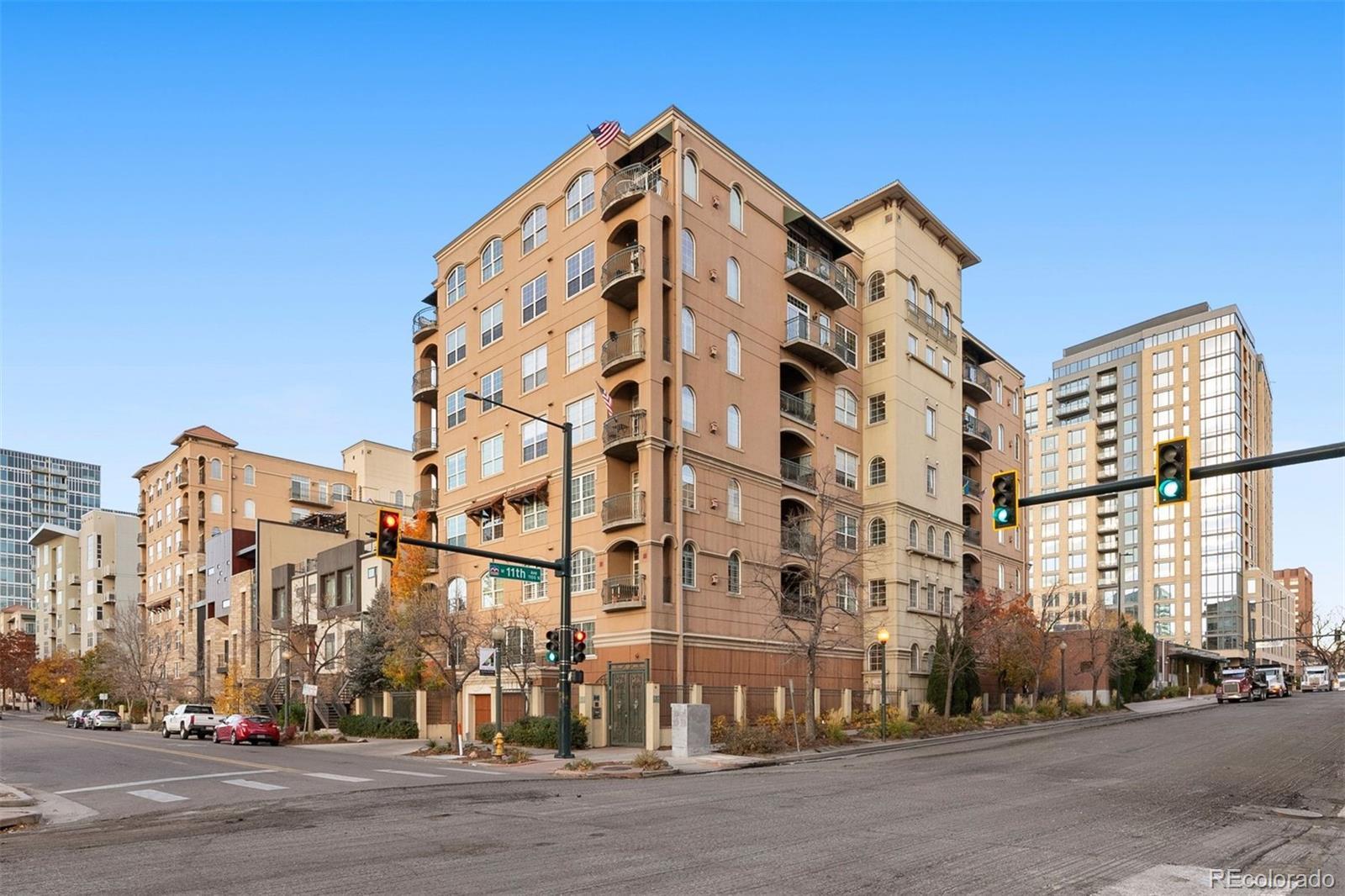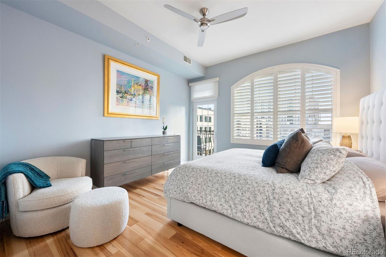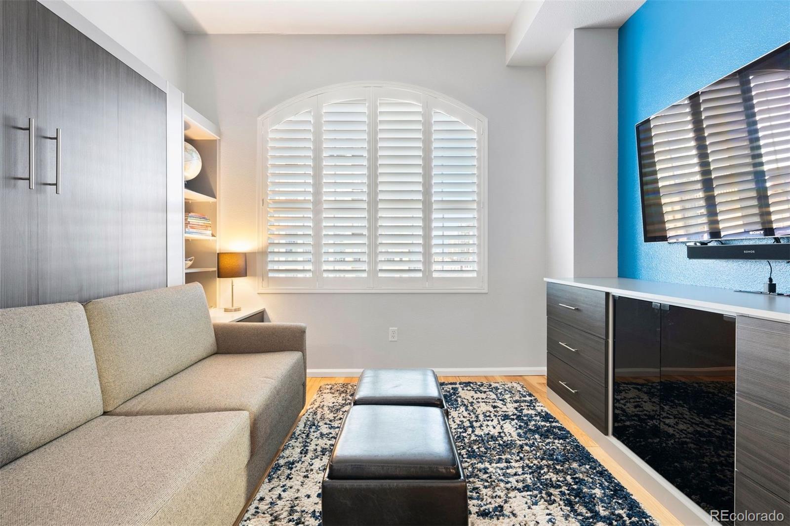 Flooded with natural light, this beautifully appointed penthouse residence offers an exceptional blend of comfort, function, and timeless style. The open-concept living area is anchored by a stately gas fireplace, while oversized windows with classic shutters frame sweeping city and mountain views to the East, South and West. Hardwood flooring throughout adds warmth, continuity, and an understated elegance. The thoughtfully designed kitchen showcases generous counter space, a large center island with seating, and abundant custom cabinetry—equally suited for casual mornings or sophisticated entertaining. Quartz surfaces, new Bosch stainless steel appliances, and refined pendant lighting elevate the space, while the seamless connection to the living and dining areas enhances flow and livability. A dedicated dining area comfortably accommodates formal gatherings and opens to one of two private balconies, creating an indoor-outdoor experience. Neutral finishes throughout provide a timeless backdrop for effortless personalization, while quartz and marble surfaces in the kitchen and both bathrooms add a layer of refined luxury. The primary suite is a true retreat, featuring a custom closet, balcony access, and a newly renovated five-piece bath designed to impress. A second bedroom with a custom Murphy bed and cabinetry offers exceptional flexibility, with second 3/4 bath adjacent. There’s a bonus dedicated office space and laundry and storage closets. Additional highlights include two parking spaces + storage locker in a heated garage, new windows and doors, newer mechanical systems, and thoughtful upgrades throughout. Ideally located in Denver’s coveted Golden Triangle neighborhood, this rare penthouse offering places you just steps from premier coffee shops, dining, museums, and entertainment. Come experience elevated urban living!