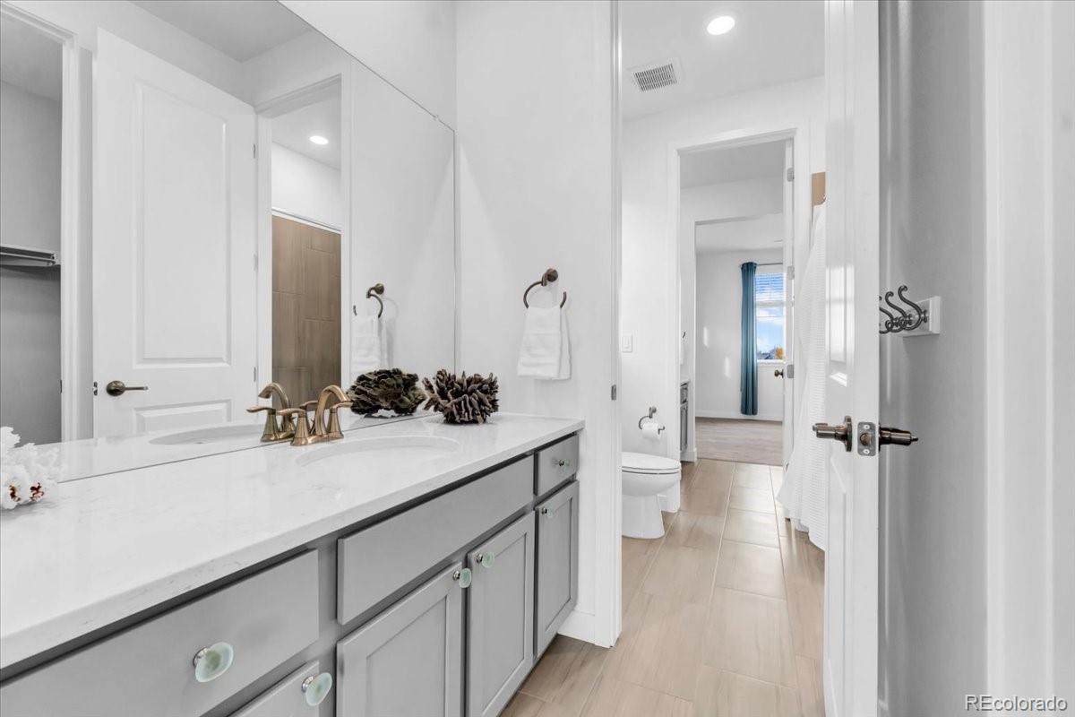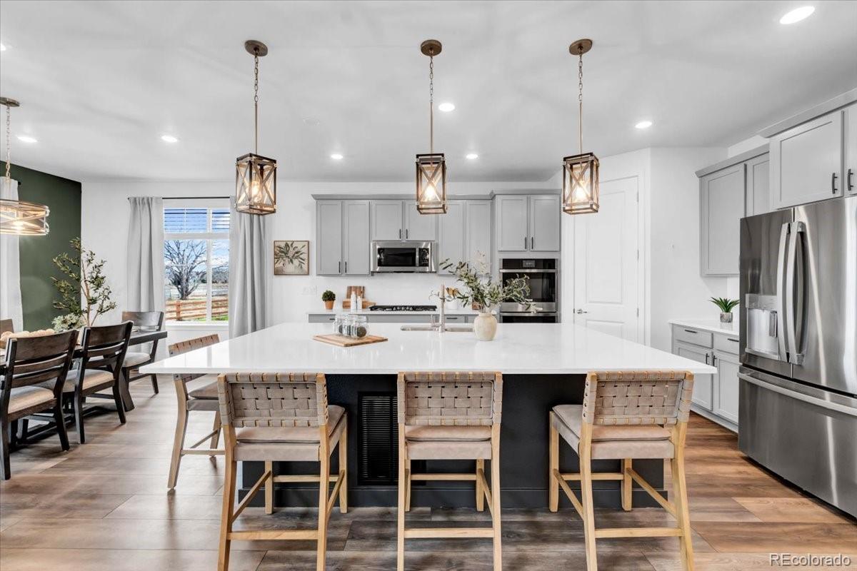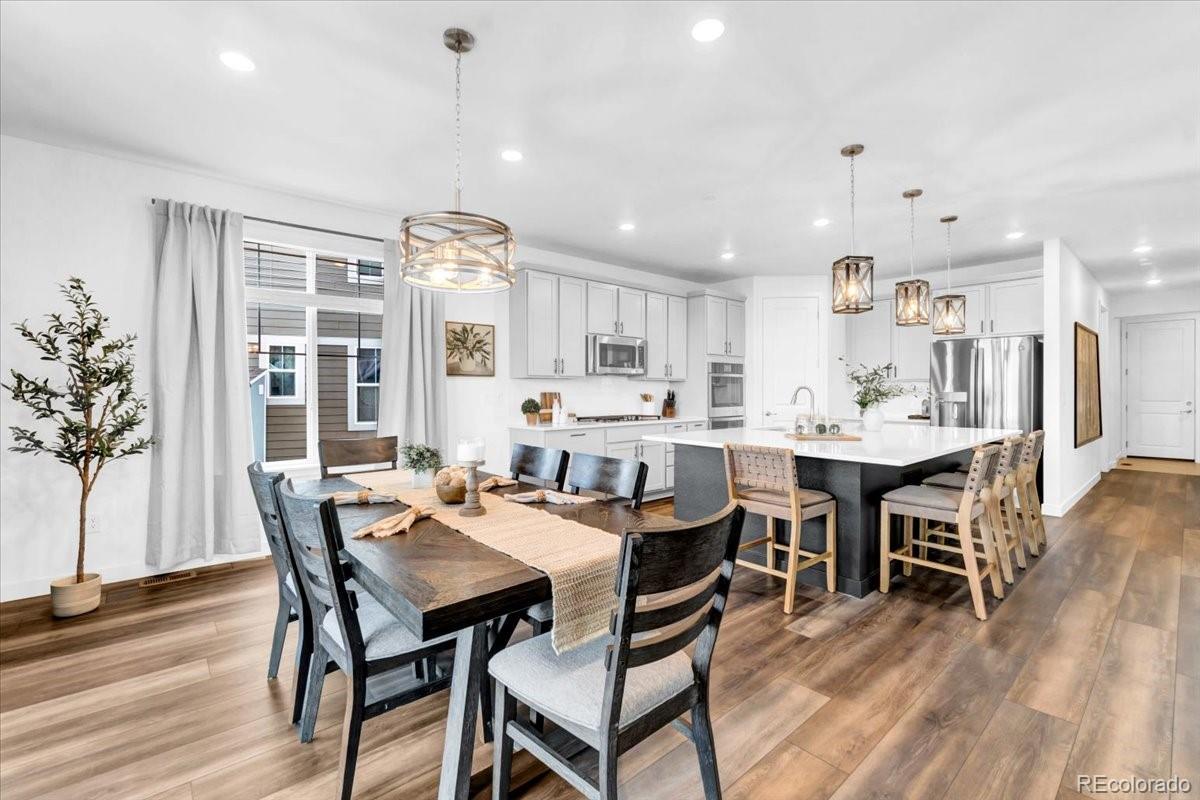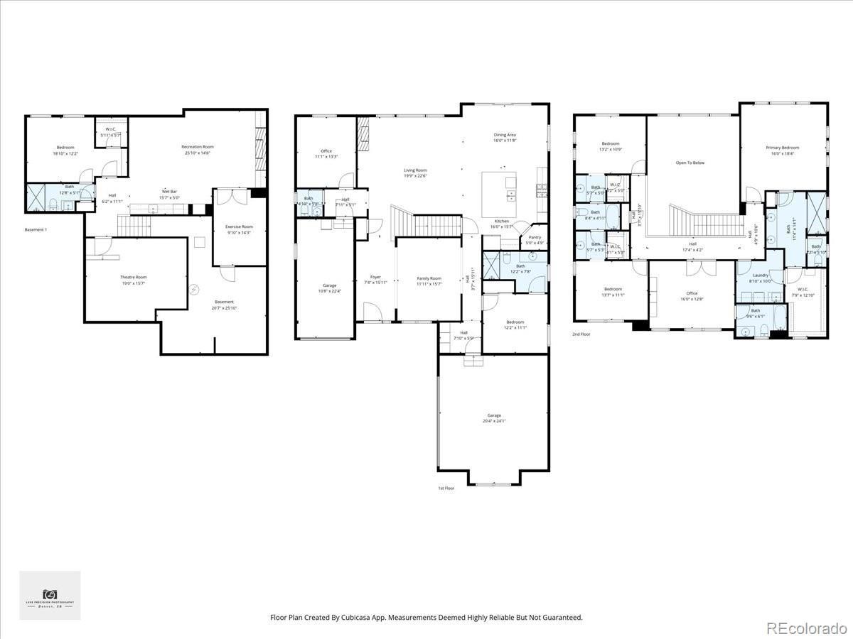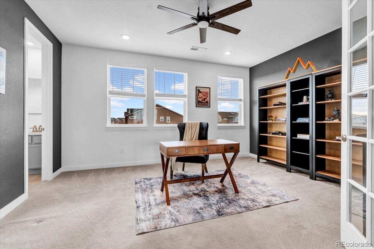 Situated on a premium open-space lot in Boulder County’s coveted Wildrose community with stunning mountain views, this like-new home features 5 bedrooms, 6 bathrooms, over 5,300 finished square feet, two office spaces, and a cinematic-quality theater room — the rare home that checks boxes you didn’t even know you had. The main level is designed for both connection and comfort. A gourmet kitchen with quartz counters, an oversized island, double ovens, and upgraded appliances opens into a dramatic two-story great room where natural light and elevated views take center stage. A private main-level guest suite and separate home office offer flexibility for multi-generational living, long-term guests, or work-from-home needs. Upstairs, the private primary retreat offers serene views and a spa-inspired bath with an oversized walk-in shower, dual-sink quartz vanity, and expansive closet. A second office/flex space provides valuable versatility and could easily convert to a junior suite. Two additional bedrooms — each with a walk-in closet and private sink vanity — share a Jack-and-Jill bath. The upper-level laundry room connects directly to the primary closet for everyday convenience. The finished basement adds even more lifestyle space, including a premium theater room, wet bar with beverage fridge, fitness studio, guest suite with adjoining bath, and generous storage. The garage includes epoxy flooring, overhead storage, and pre-wiring for EV charging. Outdoor living features a large covered deck overlooking open space, low-maintenance turf, and a peaceful backdrop perfect for coffee, outdoor dining, and mountain sunset views. Trails connect throughout the neighborhood, schools are walkable, and Old Town Erie is just one mile away with easy access to Boulder, Louisville, Lafayette, and Longmont. A premium lot, a connected community, and a theater room that makes movie nights unforgettable — this home delivers the lifestyle so many want, but few ever find.