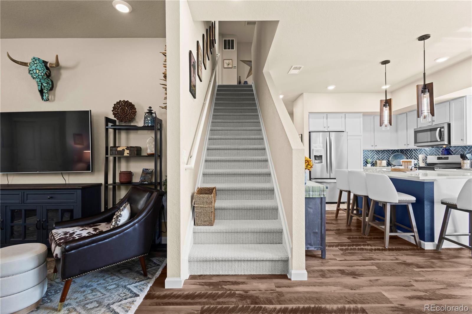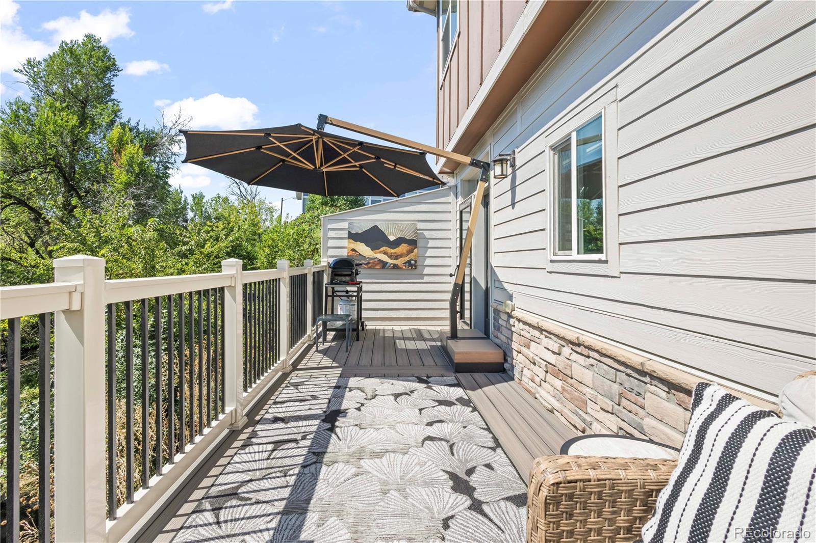 This exceptional townhome offers the ultimate blend of luxury, lifestyle and location. Every detail of this home has been thoughtfully designed and tastefully decorated. This desirable two-story floorplan townhome backs up to Sunset Park green space where you can enjoy evenings on your large private deck with views of the creek below. The open concept main floor has an upgraded kitchen layout with Quartz countertops, a large island, stainless steel appliances, low maintenance vinyl flooring and a glass tile backsplash. Your dinette has access to the new and very private Trex deck. This flows into the living room with dual coat closets for storage. You also have a three-quarter bath and a pantry conveniently located just off the garage. The second floor primary bedroom shines with two walk-in closets, an en-suite bath including a walk in shower and dual sinks. Two more bedrooms and a full bath with tub complete the second level with views of the green space and trickling creek from the windows. Two bedrooms have luxury wool carpet the third has high-end maple hardwood floors, all three bedrooms include ceiling fans. The upgraded garage is bright and clean with epoxy floors and additional celling storage. Location is ideal a short drive to Golden and only 10 minutes from Red Rocks. A quick walk to Oak St light rail gives you easy access to Golden, Ball Arena, Empower Field, and Union Station! You can’t beat this location. Seller is offering this home as a turn-key option, offering it fully furnished for additional $ (reach out to listing agent), designer furniture and finishes that fit perfectly within each space, high quality bedding and area rugs, patio furniture including a grill, all appliances and even existing TVs already mounted!