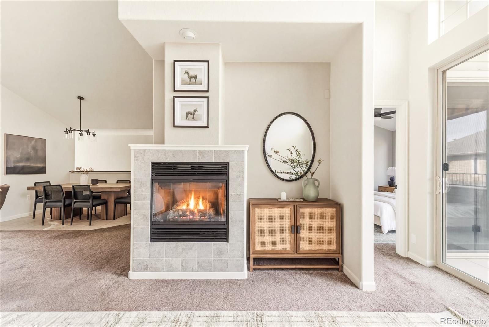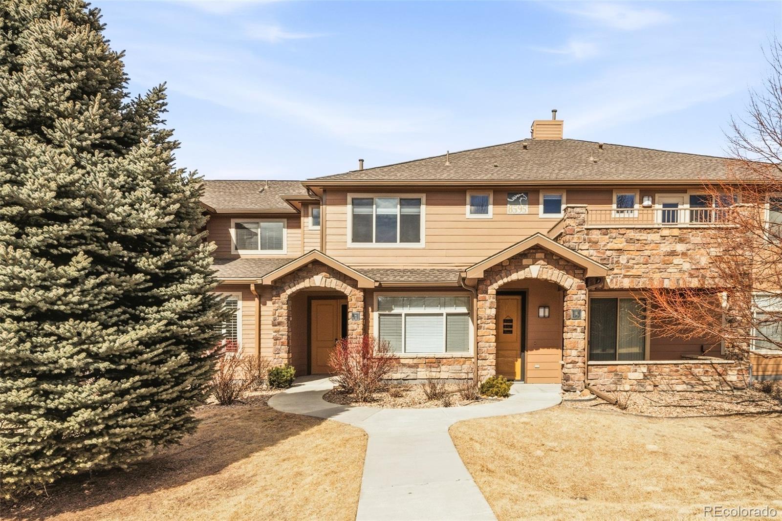 Beautifully updated home in sought-after Palomino Park offering desirable Highlands Ranch living. Soaring 15-foot vaulted ceilings, fresh paint, and abundant natural light enhance the open-concept layout connecting the dining area, kitchen, and living room. A sleek electric fireplace anchors the sunlit space, which opens through oversized sliding glass doors to a large private patio with gorgeous mountain views. The stylish kitchen features a high-top breakfast bar, pantry, and ample cabinetry for easy entertaining. Vaulted ceilings continue into the serene primary suite with a walk-in closet, private balcony access, and a spa-like en-suite bath. Both bathrooms are beautifully updated with tile flooring, chic matching vanities, modern fixtures, elegant lighting, and an oversized soaking tub. Enjoy a spacious two-car garage with extra storage and low-maintenance living, with the HOA covering snow removal, roof maintenance, exterior painting, landscaping, and common areas. Palomino Park offers unmatched resort-style amenities (truly live where you play!) including a state-of-the-art fitness club, basketball, tennis and pickleball courts, pool and hot tub, racquetball, high-impact training room, volleyball and baseball areas, putting green, frisbee golf, playground, and an on-site bar and grill. All with easy access to trails, DTC, C-470, I-25, and the mountains.