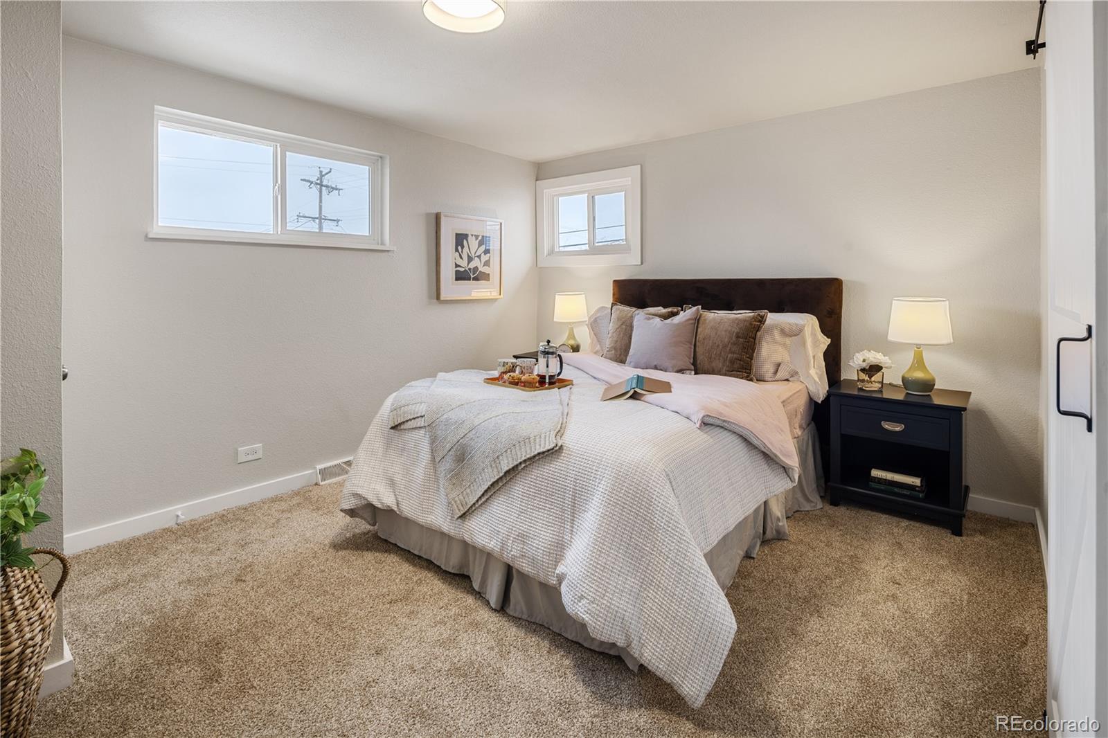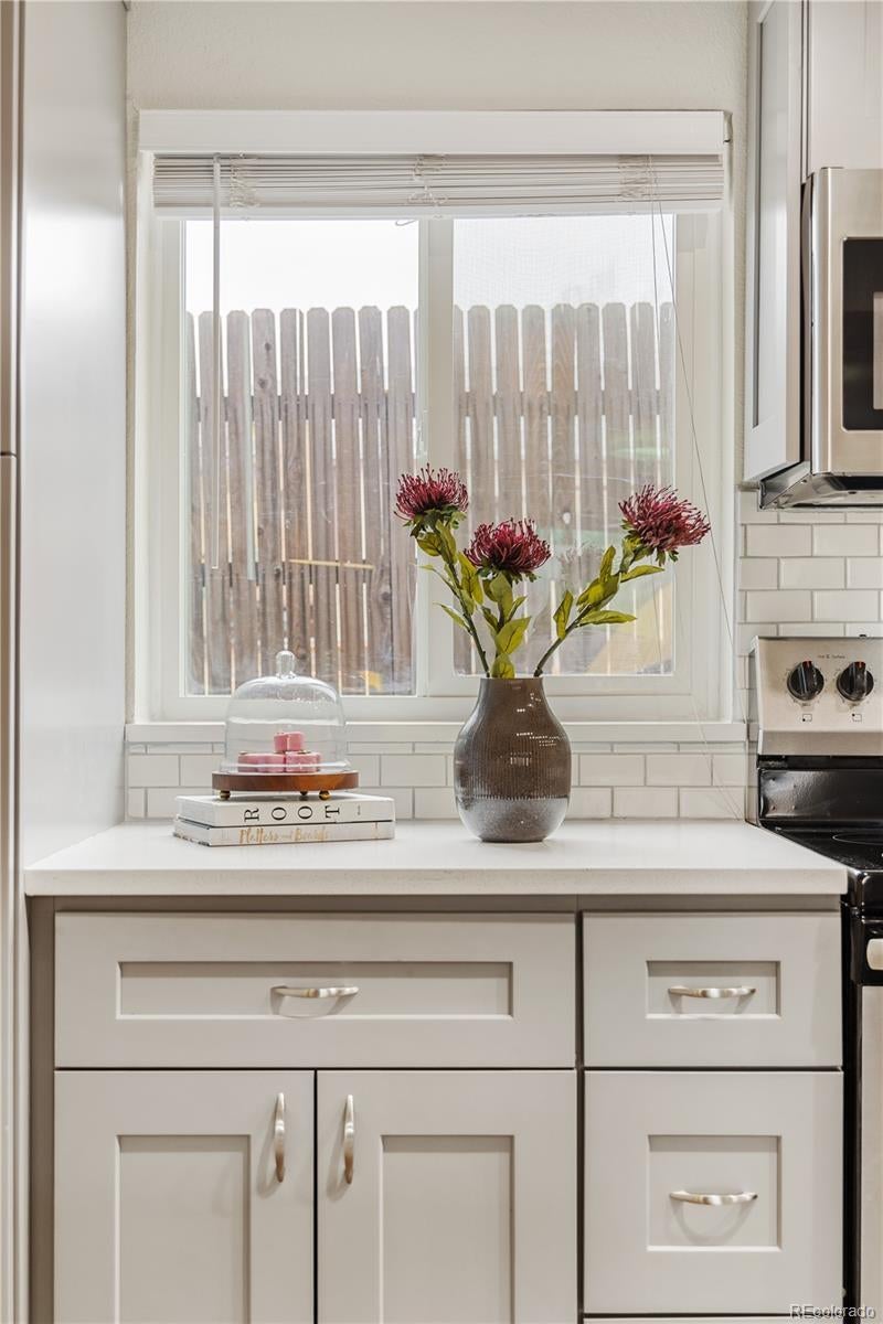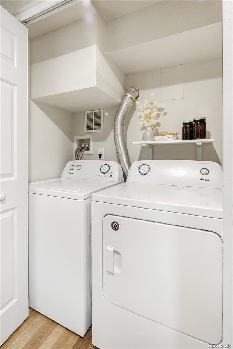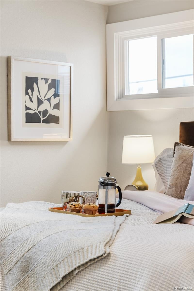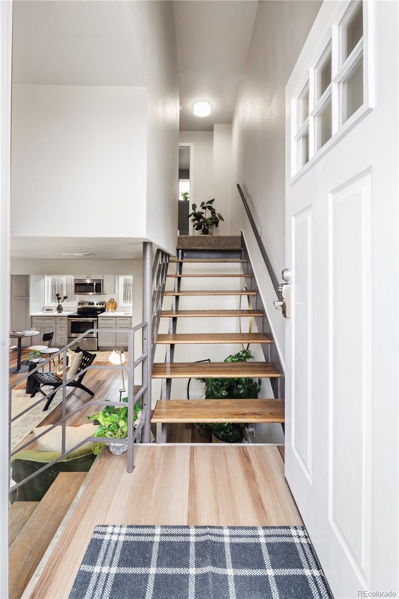 This is what affordable, walkable, urban living near Sloan's Lake looks like. Bright, open, and full of character, this two-story, two-bedroom townhouse hits the sweet spot for move-in ready living with style and soul. From the moment you enter, the open layout just works. Iron railings add a layer of texture and edge, while new paint, light fixtures, LVP flooring, doors, windows and fixtures exude quality.The flow of the main level is made for cooking, hanging out, hosting friends, or just relaxing at home. The kitchen is completely renovated with real wood shaker cabinet with slow closers. Quartz countertops and stainless appliances sparkle, while a Nest thermostat and a newer furnace/AC combo keep everything comfortable year-round. A great laundry nook is an incredible luxury and the washer/dryer are included. Upstairs two very generous bedrooms with end unit windows on two sides, high ceilings and large closets with barn doors. The primary even has a big second closet! The bright full bathroom makes the layout feel thoughtful and livable. While most townhomes offer little to no outdoor space, this one has a private concrete patio perfect for al fresco dining, a grill or firepit. The nearly 800 sqft yard is all yours and has a brand new cedar fence, established grass and HOA maintained sprinkler system. A reserved off street parking spot is included as is a private storage shed. Another bonus is a communal patio out back that gets tons of sunlight. New roof in 2024! Location Location Location! Just 10 blocks to Sloan’s Lake and Edgewater Public Market, King Soopers and Target. Several parks and the Sheridan Light Rail Station, Walmart and Home Depot and yes, the infamous Casa Bonita are all within walking distance. $200/month HOA covers water, gas, heat, sewer, sprinklers, trash and premises liability. This townhome doesn't just look good, it’s genuinely affordable. Finally a place that you can call your own for the same monthly payment as a rental.