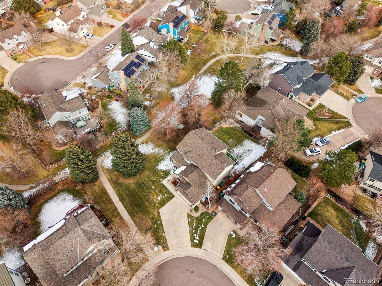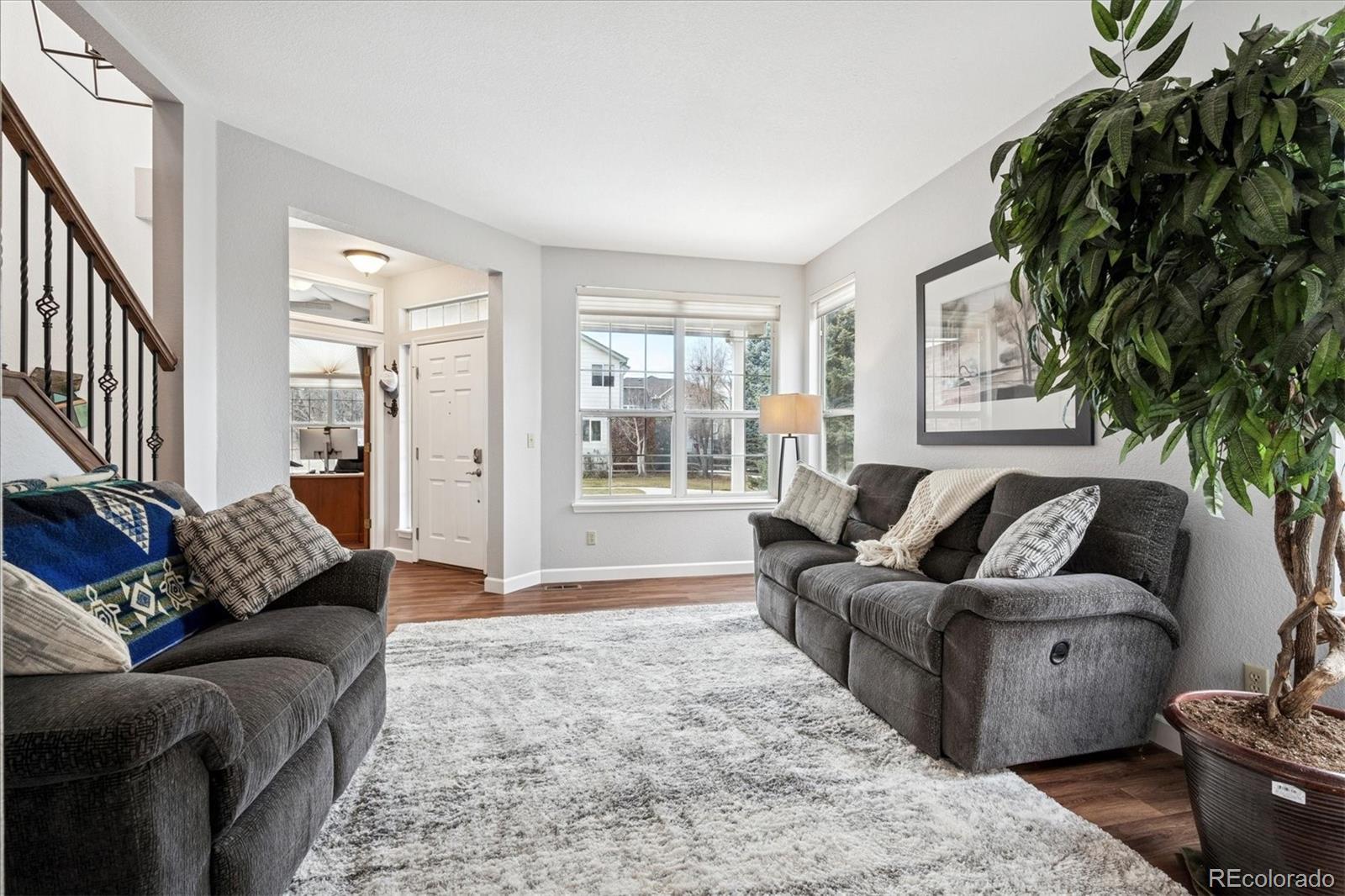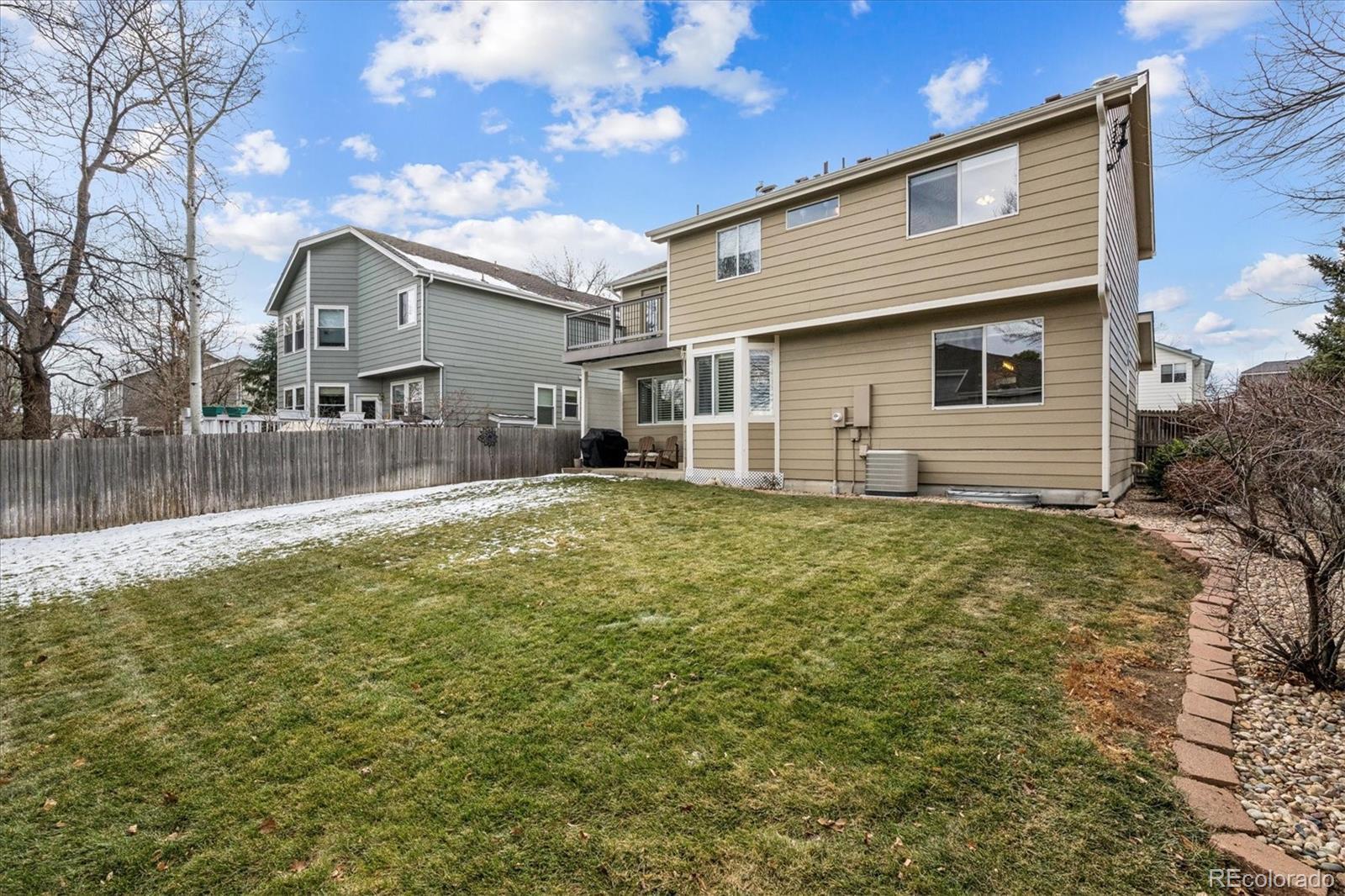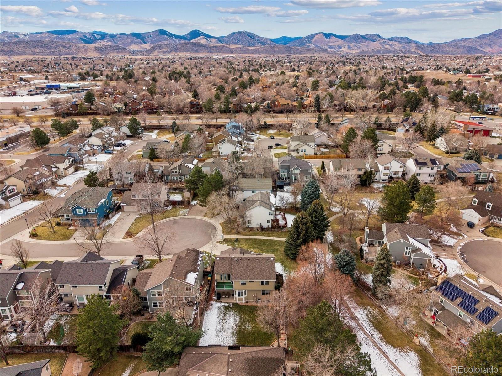 Welcome Home to this beautifully updated 3-bedroom, 3-bath home, tucked away on a quiet cul-de-sac and siding to open space with mature trees. A grand vaulted foyer welcomes you with engineered flooring, neutral designer paint, custom lighting, architectural ledges, and elegant banisters with wrought iron detailing. The main level features a private office with French doors, ideal for working from home, along with formal living and dining rooms perfect for entertaining or everyday living. The gourmet kitchen boasts granite countertops, an island, stainless steel appliances, abundant cabinetry, walk-in pantry, and an oversized undermount sink w/ industrial-grade fixture. A casual dining area with plantation shutters opens to both a covered backyard patio with gas line for grilling, and ample room to relax or entertain and an inviting family room, which features a custom stone-faced gas fireplace with wooden mantle, custom lighting, and large picture windows with plantation shutters overlooking the private, maturely landscaped backyard. An oversized laundry room with cabinetry and utility sink is conveniently located off the garage entry. The garage offers a custom epoxy floor, built-in cabinets and insulated garage doors. Upstairs, French doors lead to the spacious primary suite with vaulted ceiling and fan, two large walk-in closets, private Trex deck, and luxurious five-piece spa-style bath w/ European Glass shower. Two additional bedrooms w/ walk-in closets and an updated full bath complete the upper level. The unfinished basement provides outstanding potential with roughed-in plumbing and crawlspace storage. Custom Hunter Douglas window coverings and thoughtfully designed storage are found throughout this home. NEW Class 4 Impact Resistant Roof with transferable warranty. Ideally located just steps from Governor’s Ranch Elementary and Governor Grant Park, and minutes to shopping, dining, golf courses, Chatfield State Park, and major highways.