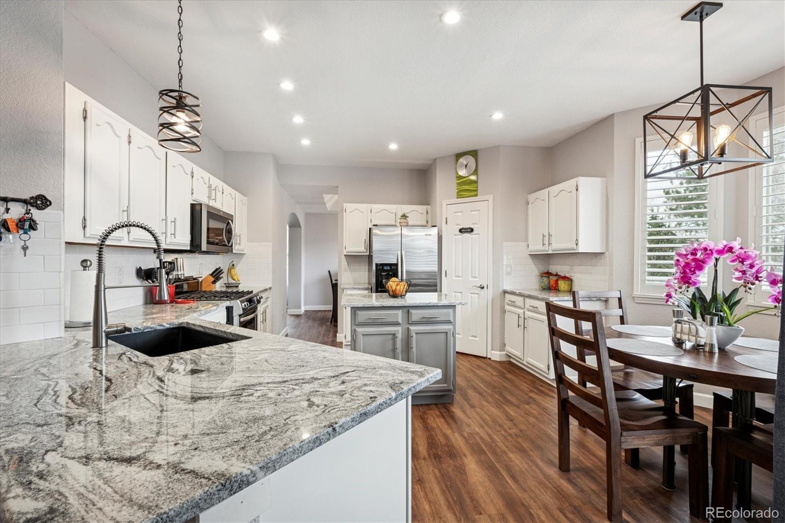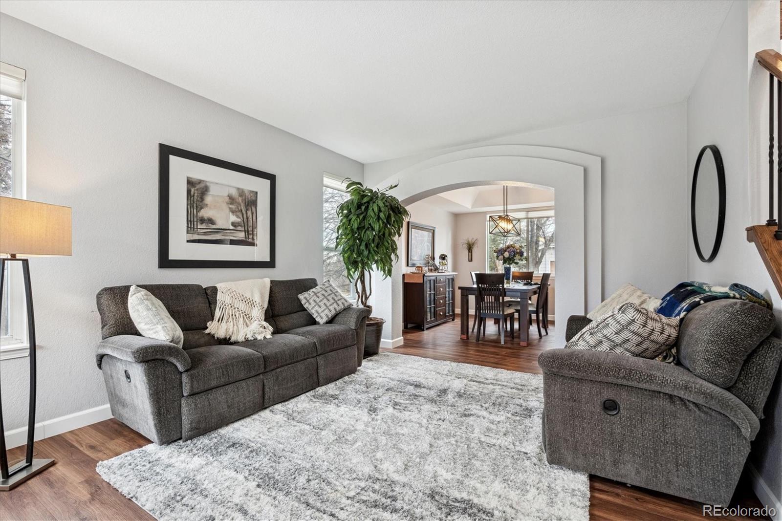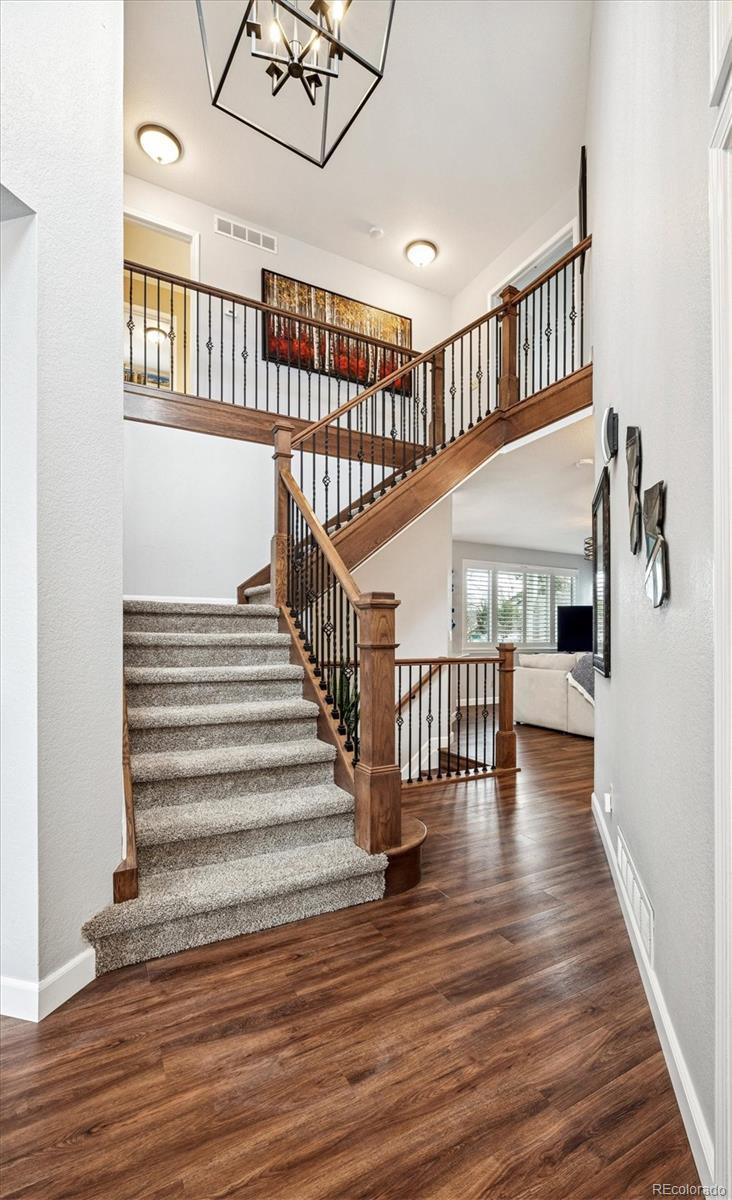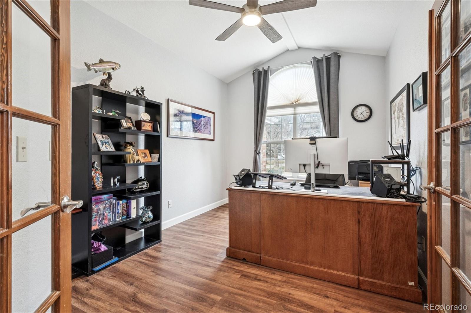Welcome Home to this beautifully updated 3-bedroom, 3-bath home, tucked away on a quiet cul-de-sac and siding to open space with mature trees. A grand vaulted foyer welcomes you with engineered flooring, neutral designer paint, custom lighting, architectural ledges, and elegant banisters with wrought iron detailing. The main level features a private office with French doors, ideal for working from home, along with formal living and dining rooms perfect for entertaining or everyday living. The gourmet kitchen boasts granite countertops, an island, stainless steel appliances, abundant cabinetry, walk-in pantry, and an oversized undermount sink w/ industrial-grade fixture. A casual dining area with plantation shutters opens to both a covered backyard patio with gas line for grilling, and ample room to relax or entertain and an inviting family room, which features a custom stone-faced gas fireplace with wooden mantle, custom lighting, and large picture windows with plantation shutters overlooking the private, maturely landscaped backyard. An oversized laundry room with cabinetry and utility sink is conveniently located off the garage entry. The garage offers a custom epoxy floor, built-in cabinets and insulated garage doors. Upstairs, French doors lead to the spacious primary suite with vaulted ceiling and fan, two large walk-in closets, private Trex deck, and luxurious five-piece spa-style bath w/ European Glass shower. Two additional bedrooms w/ walk-in closets and an updated full bath complete the upper level. The unfinished basement provides outstanding potential with roughed-in plumbing and crawlspace storage. Custom Hunter Douglas window coverings and thoughtfully designed storage are found throughout this home. NEW Class 4 Impact Resistant Roof with transferable warranty. Ideally located just steps from Governor’s Ranch Elementary and Governor Grant Park, and minutes to shopping, dining, golf courses, Chatfield State Park, and major highways.