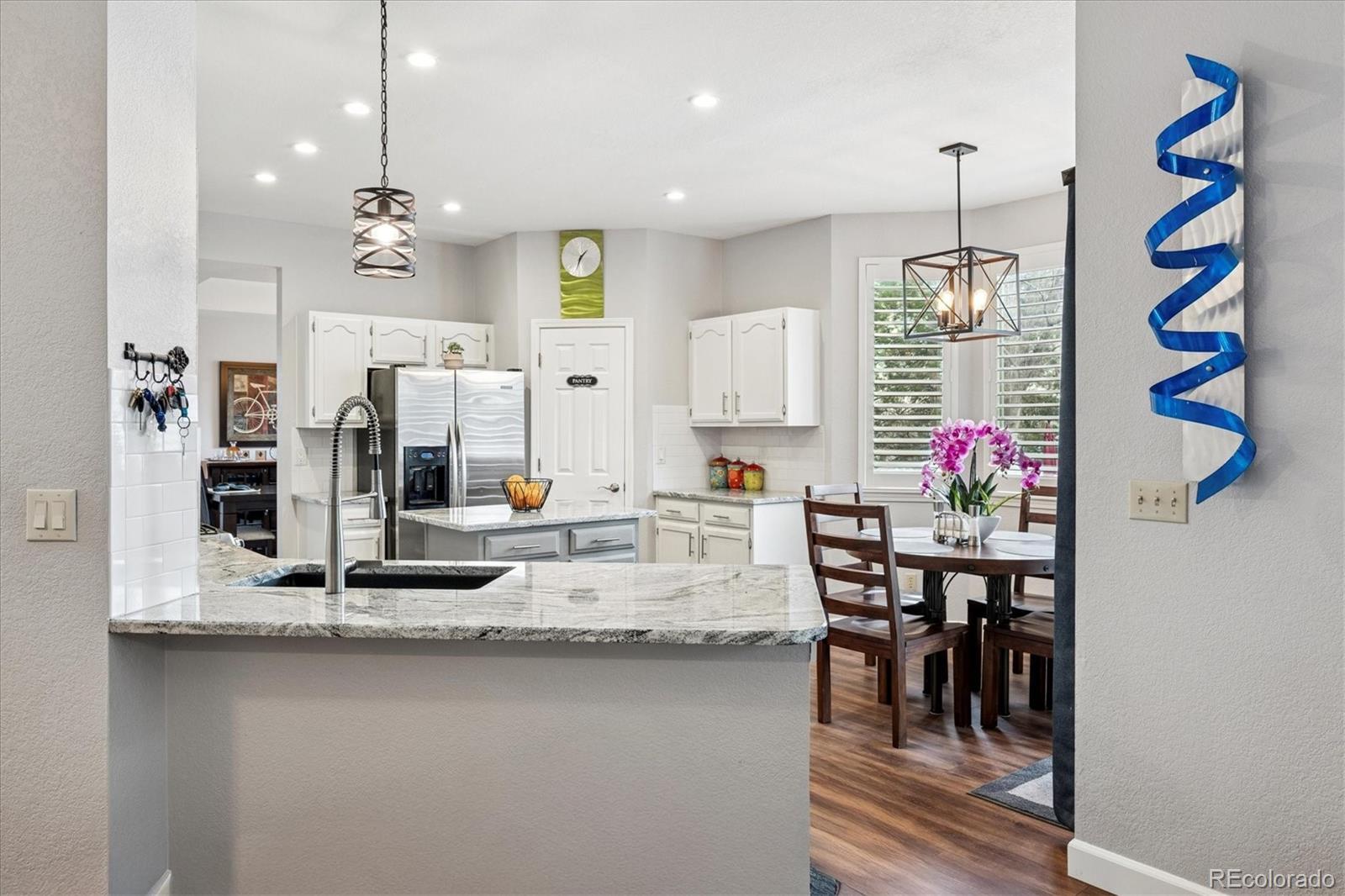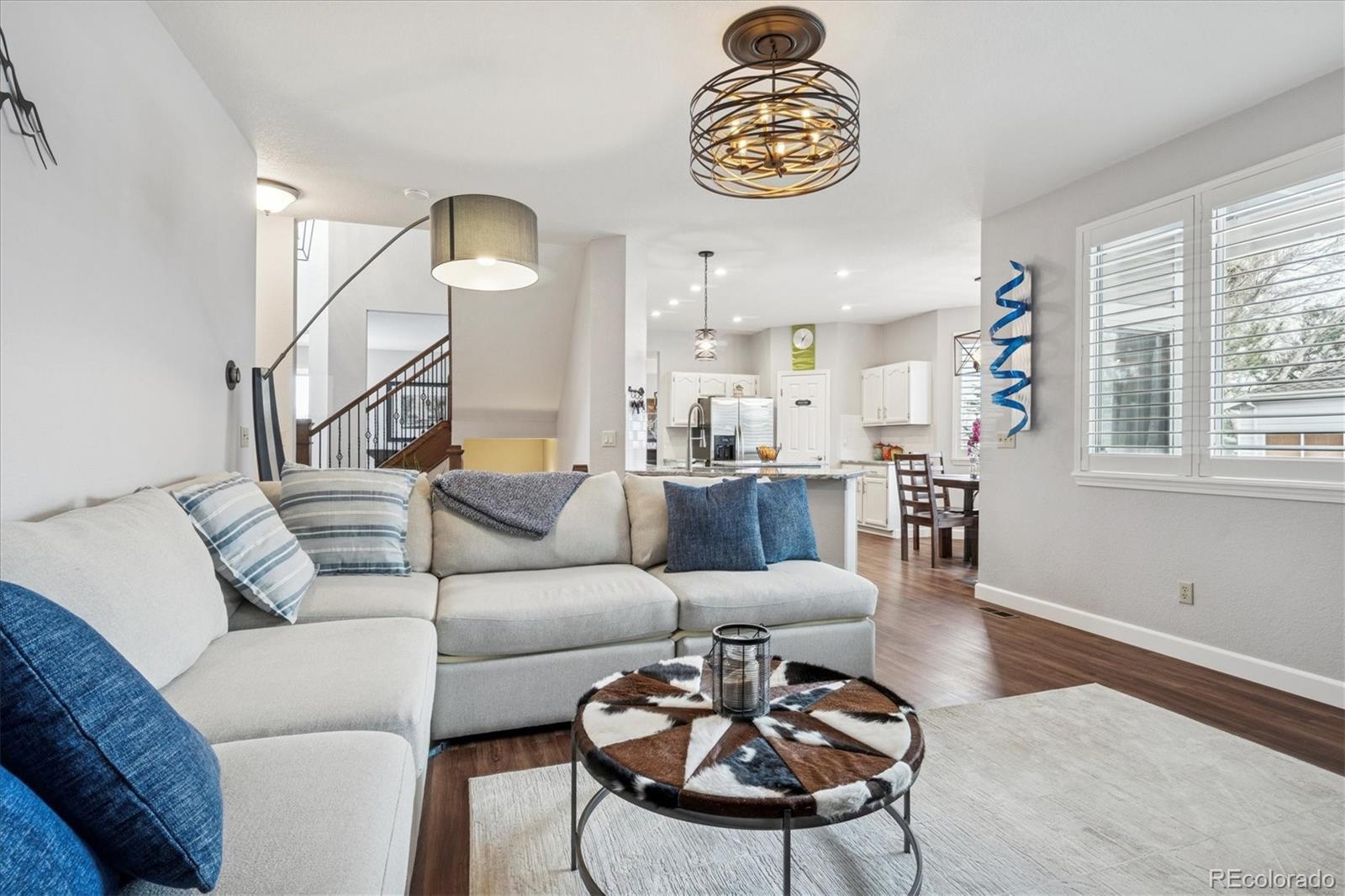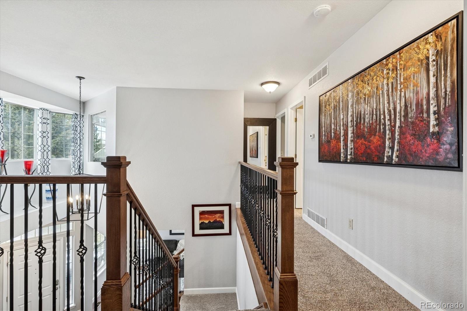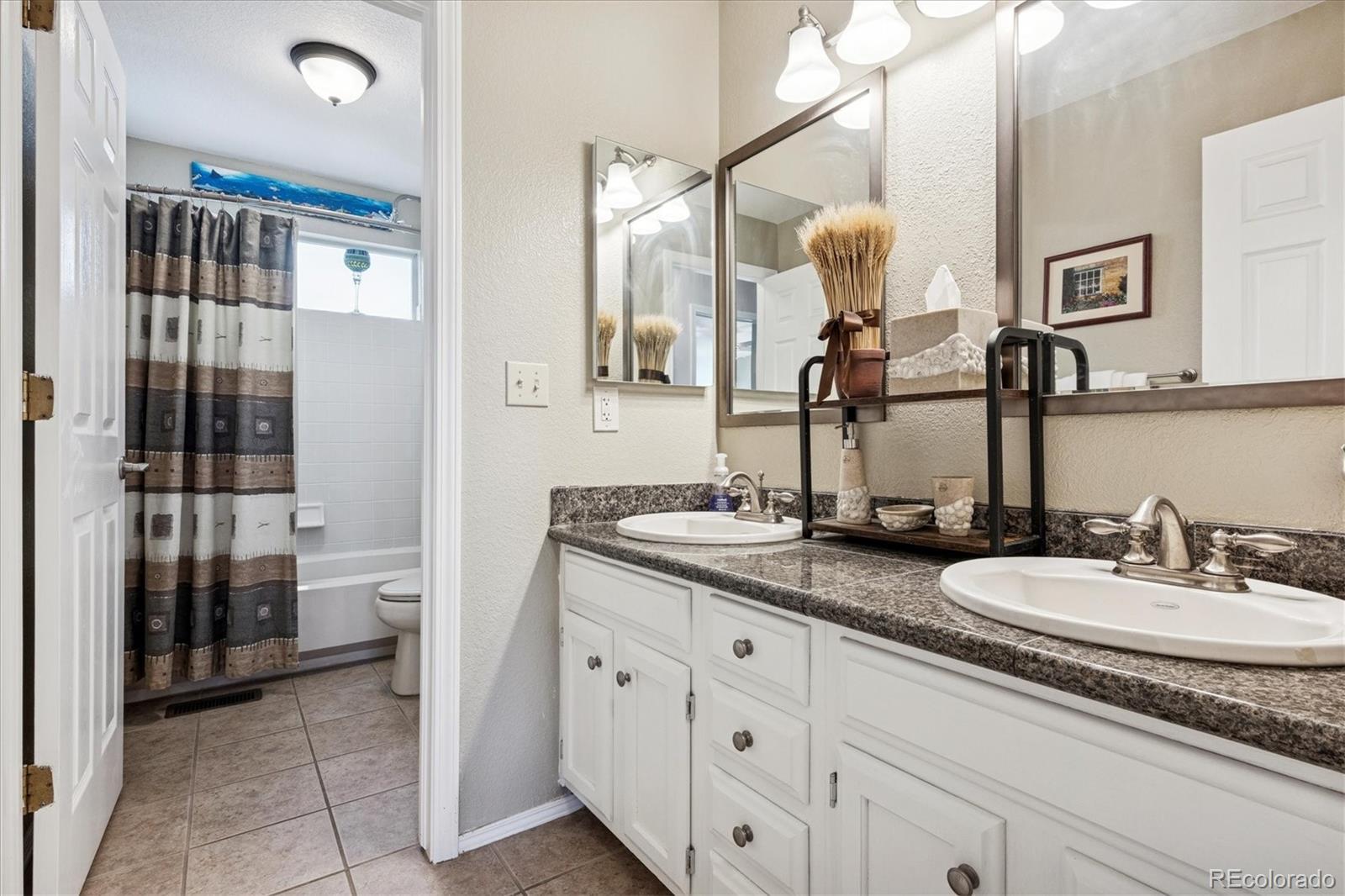 Welcome Home to this beautifully updated 3-bedroom, 3-bath home, tucked away on a quiet cul-de-sac and siding to open space with mature trees. A grand vaulted foyer welcomes you with engineered flooring, neutral designer paint, custom lighting, architectural ledges, and elegant banisters with wrought iron detailing. The main level features a private office with French doors, ideal for working from home, along with formal living and dining rooms perfect for entertaining or everyday living. The gourmet kitchen boasts granite countertops, an island, stainless steel appliances, abundant cabinetry, walk-in pantry, and an oversized undermount sink w/ industrial-grade fixture. A casual dining area with plantation shutters opens to both a covered backyard patio with gas line for grilling, and ample room to relax or entertain and an inviting family room, which features a custom stone-faced gas fireplace with wooden mantle, custom lighting, and large picture windows with plantation shutters overlooking the private, maturely landscaped backyard. An oversized laundry room with cabinetry and utility sink is conveniently located off the garage entry. The garage offers a custom epoxy floor, built-in cabinets and insulated garage doors. Upstairs, French doors lead to the spacious primary suite with vaulted ceiling and fan, two large walk-in closets, private Trex deck, and luxurious five-piece spa-style bath w/ European Glass shower. Two additional bedrooms w/ walk-in closets and an updated full bath complete the upper level. The unfinished basement provides outstanding potential with roughed-in plumbing and crawlspace storage. Custom Hunter Douglas window coverings and thoughtfully designed storage are found throughout this home. NEW Class 4 Impact Resistant Roof with transferable warranty. Ideally located just steps from Governor’s Ranch Elementary and Governor Grant Park, and minutes to shopping, dining, golf courses, Chatfield State Park, and major highways.