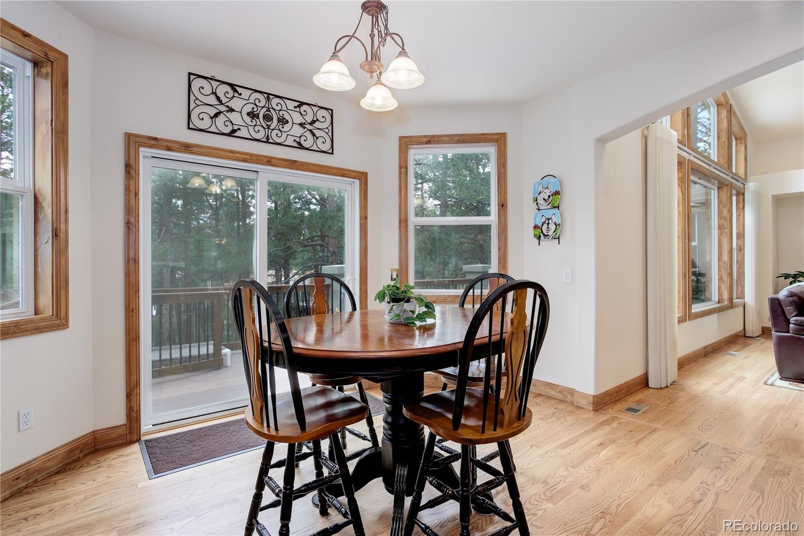 Tucked among towering Ponderosa pines on nearly 3/4 acres, this immaculate walk-out rancher blends open, airy design & warm wood accents, with only one owner since construction. The new asphalt sealant on the driveway, freshly restored & painted stucco exterior, new cement walkway, & roof replaced Aug 2025 create a polished & inviting entry. Step inside to a spacious great room filled with natural light, vaulted ceilings, & picture windows framing forest views. Rich hardwood floors, a stone hearth fireplace, & alcoves add warmth and character. The open kitchen features knotty Alder cabinets, granite countertops, new dual ovens, & a walk-in pantry perfect for everyday ease & entertaining. Enjoying quiet mornings from walk-out dining nook with wildlife views or al fresco dining on the 43-foot-long deck. The main-level primary suite is a serene retreat with deck access, forest views, vaulted ceilings, hardwood floors, & a spacious walk-in closet. The spa-like bath includes a jetted tub, tiled shower, & dual sink vanity with a makeup counter. For those who work remote or prefer simply a dedicated workspace, the main-floor office offers built-in shelving & a large closet. The formal dining room, currently used as a sitting room, features a coffered ceiling & wood trim. Entertain in the vast walk-out family room with its fireplace and bar with wine fridge & barstool seating. 3 sizable bedrooms are also located on this level -one with dual closets, while the others feature walk-in closets. A Jack-and-Jill bath joins two of the rooms. The lower level boasts 9' ceilings, plush carpet, & plenty of storage. The fully landscaped front, side, & back yards feature raised garden beds, while the attached 3-car garage & circular driveway provide practical convenience. Located in a tranquil community with hiking trails, 2 ponds with fountains, a pickleball court, & frequent wildlife visitors, this home is a nature lover's dream with the comfort of quality craftsmanship.