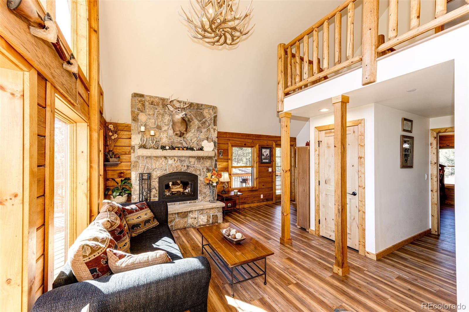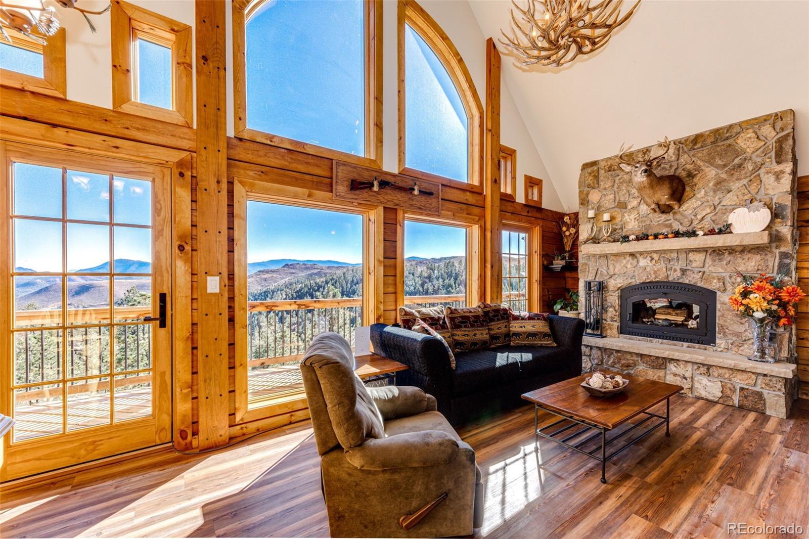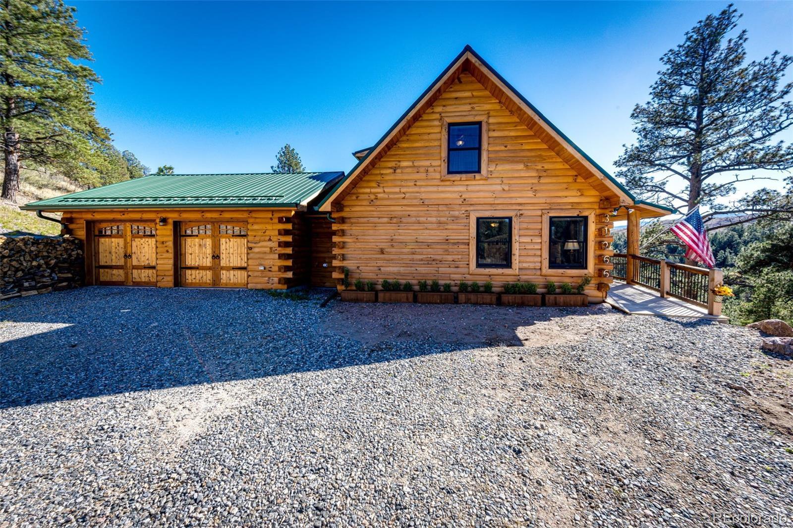 Ask about short-term rental potential! Enjoy AND earn passive income! See the last photo! Nestled in the mountains, this luxury log home offers a wonderful alpine living experience. Situated on 35 acres, this 2 bed, 2 bath haven combines rustic charm with modern luxury and sunrise to sunset views including Pike’s Peak. Efficient use of space with an open-concept living and dining area features vaulted ceilings and a wood-burning fireplace offers the perfect setting to gather with friends and family. Heated floors throughout the home (even the primary shower) will keep you warm all winter long. The kitchen has stainless steel appliances, granite countertops, custom cabinetry and pantry. The primary bedroom includes an en-suite bathroom. The upstairs bedroom and full bathroom are perfect for guests. The unfinished walkout basement provides potential to create more living space, a game room, home theater, additional bedrooms, or whatever you can imagine. The basement has 12-foot ceilings and a reinforced safe room, offering you peace of mind and a secure retreat. The wraparound deck invites you to bask in the fresh mountain air all day, where you can experience the beauty of Colorado's four seasons in your own backyard. Whether you're seeking a peaceful mountain retreat or a base for your outdoor adventures, this property offers the perfect blend of comfort and natural beauty. Nearby fly fishing on the North Fork of the S Platte River. Other features include a whole house Generac generator for backup power. A whole house fire sprinkler system (this is what the discreet, round fixtures are on the ceiling). Full RV hookups with 30 amp service. A 1000-gallon buried propane tank. Metal roof with snow dams. Domestic well. The Sellers’ original idea was to build another home nearby and keep this as an ADU for potential short-term rental income or space for family. That’s why the septic is adequate for 6-7 bedrooms. The road maintenance agreement plans to pave the road.