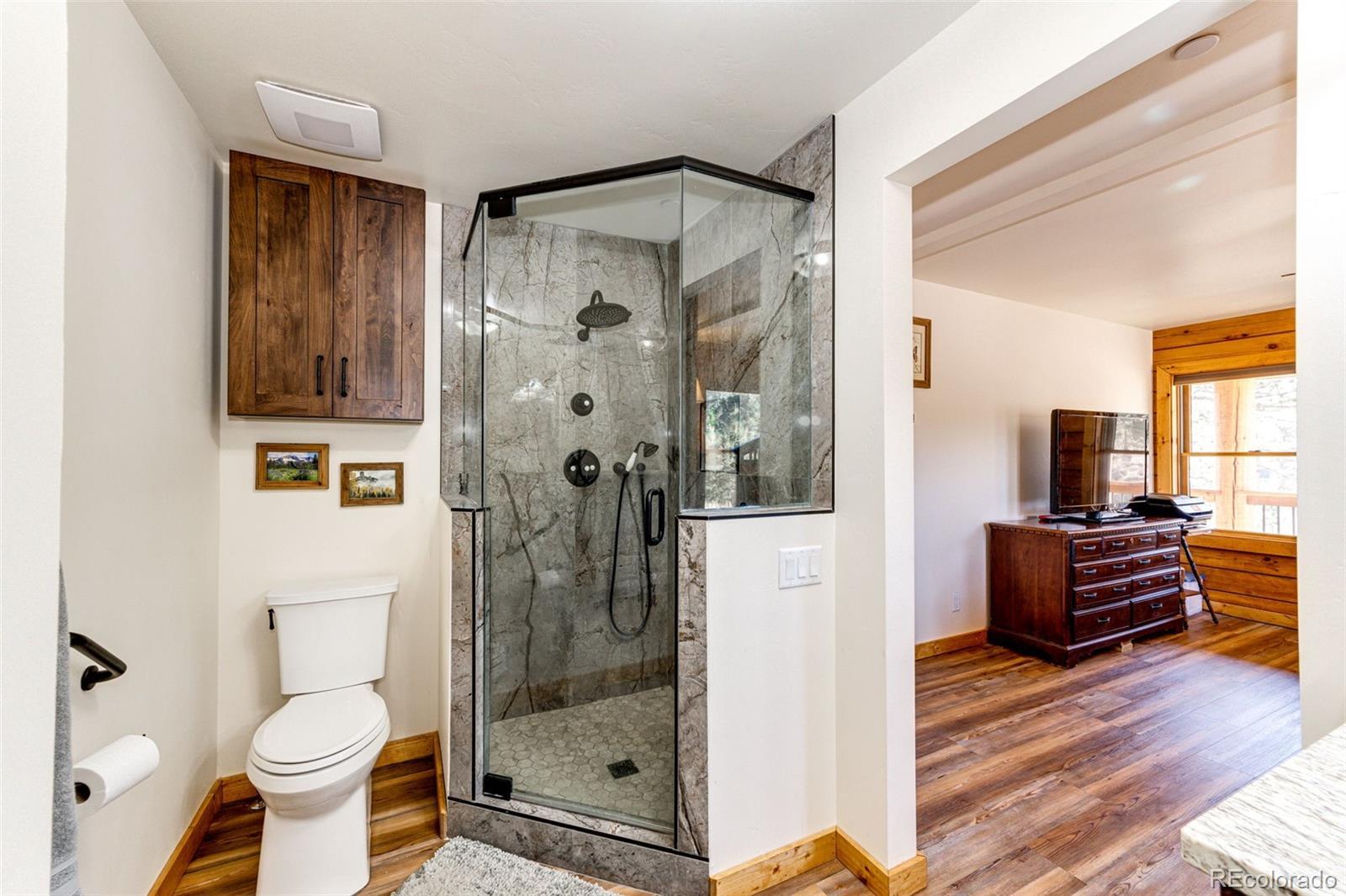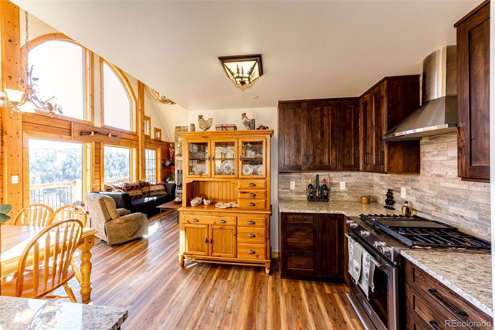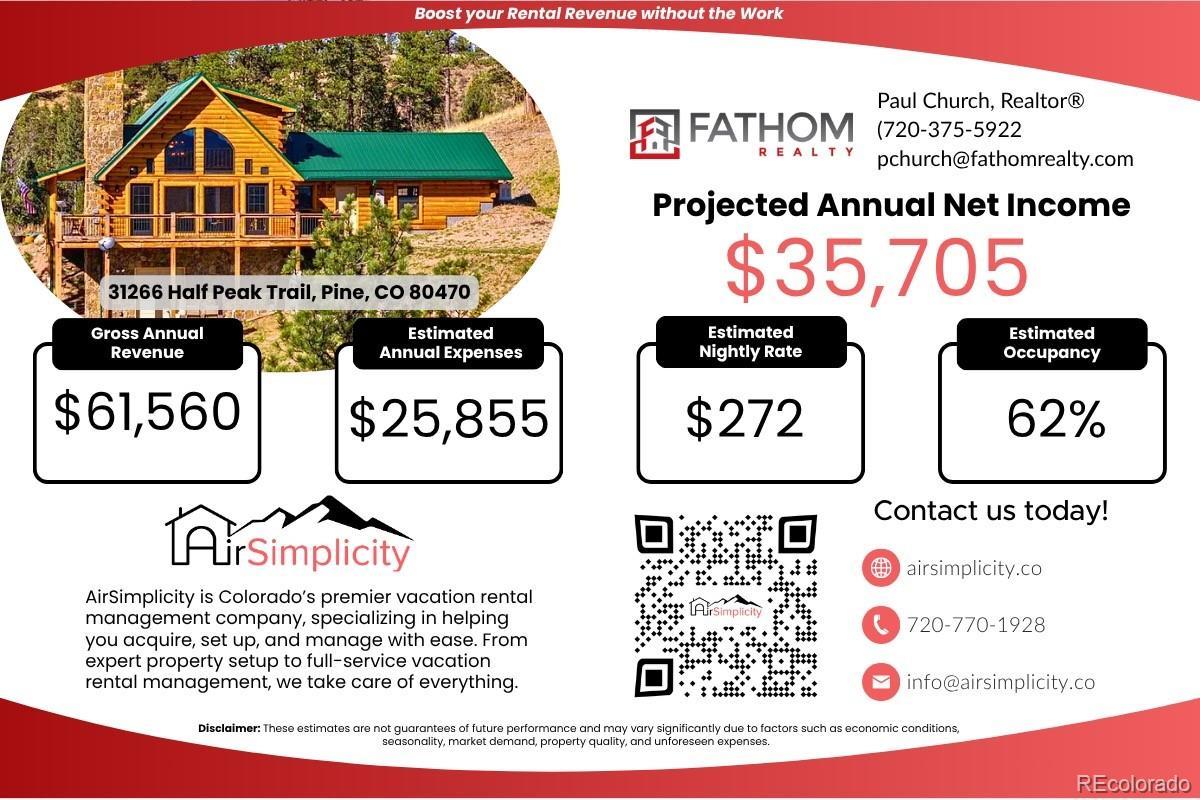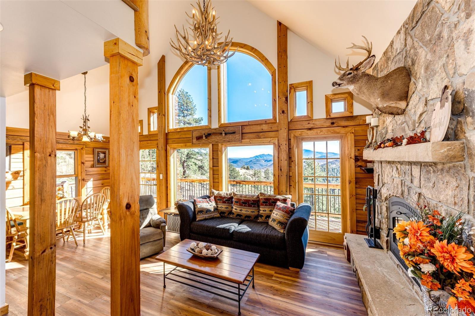 Ask about short-term rental potential! Enjoy AND earn passive income! See the last photo! Nestled in the mountains, this luxury log home offers a wonderful alpine living experience. Situated on 35 acres, this 2 bed, 2 bath haven combines rustic charm with modern luxury and sunrise to sunset views including Pike’s Peak. Efficient use of space with an open-concept living and dining area features vaulted ceilings and a wood-burning fireplace offers the perfect setting to gather with friends and family. Heated floors throughout the home (even the primary shower) will keep you warm all winter long. The kitchen has stainless steel appliances, granite countertops, custom cabinetry and pantry. The primary bedroom includes an en-suite bathroom. The upstairs bedroom and full bathroom are perfect for guests. The unfinished walkout basement provides potential to create more living space, a game room, home theater, additional bedrooms, or whatever you can imagine. The basement has 12-foot ceilings and a reinforced safe room, offering you peace of mind and a secure retreat. The wraparound deck invites you to bask in the fresh mountain air all day, where you can experience the beauty of Colorado's four seasons in your own backyard. Whether you're seeking a peaceful mountain retreat or a base for your outdoor adventures, this property offers the perfect blend of comfort and natural beauty. Nearby fly fishing on the North Fork of the S Platte River. Other features include a whole house Generac generator for backup power. A whole house fire sprinkler system (this is what the discreet, round fixtures are on the ceiling). Full RV hookups with 30 amp service. A 1000-gallon buried propane tank. Metal roof with snow dams. Domestic well. The Sellers’ original idea was to build another home nearby and keep this as an ADU for potential short-term rental income or space for family. That’s why the septic is adequate for 6-7 bedrooms. The road maintenance agreement plans to pave the road.