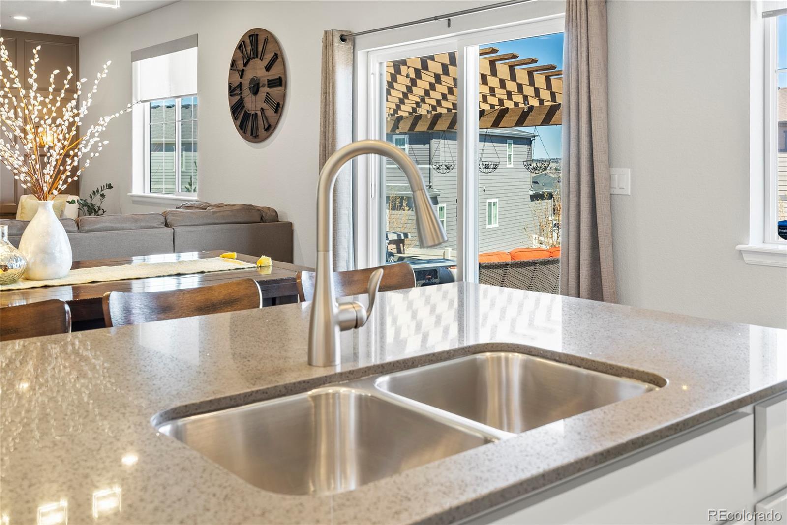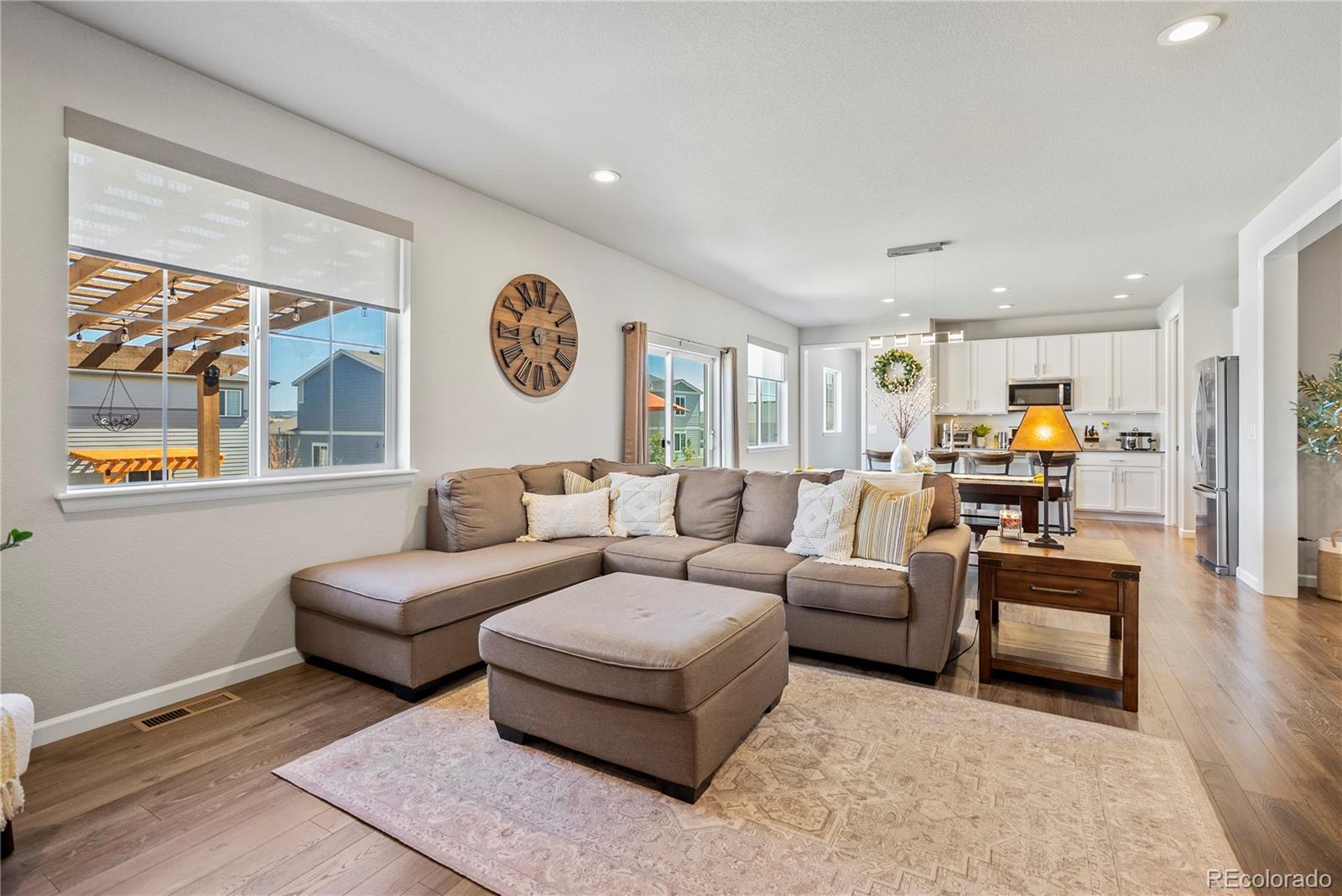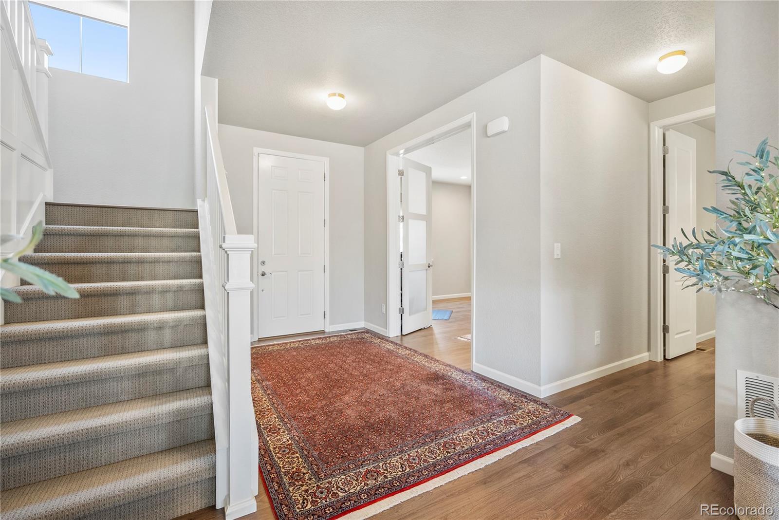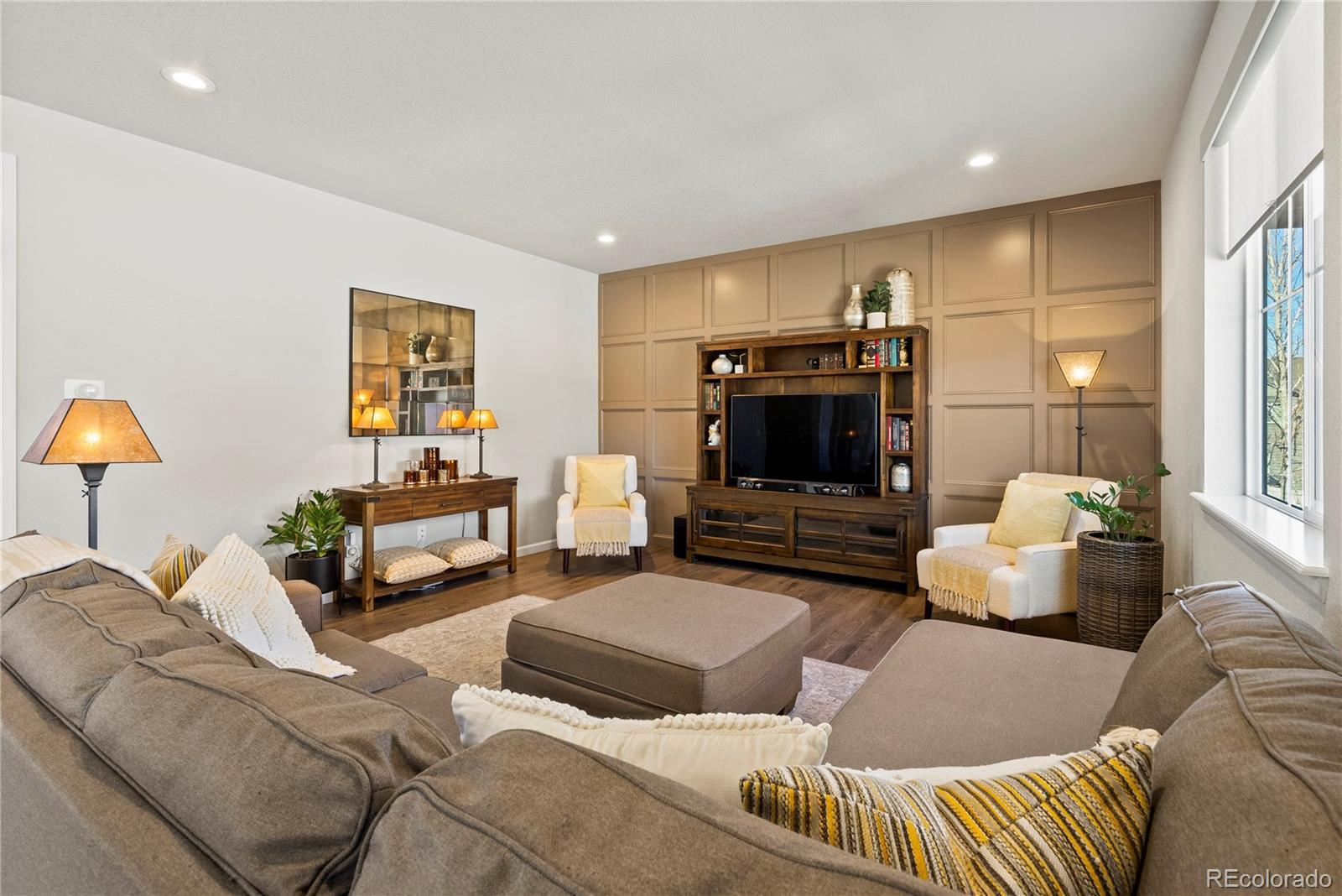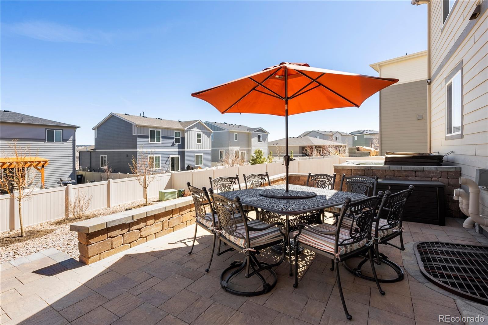 Video Tour: https://shorturl.at/PBvwt This beautifully upgraded 4-bedroom plus main-level office home is ready for its next chapter, ideally set across from a charming pocket park and just minutes from top-rated Legacy Elementary. From the moment you arrive, you’ll appreciate the inviting curb appeal—lush landscaping, mature trees, permanent Jellyfish lighting, and fully paid-off solar panels that combine beauty with smart savings. Step inside to a sun-filled, open layout designed for both everyday living and entertaining. The heart of the home is a designer kitchen with quartz countertops, crisp white cabinetry, stainless steel appliances, a spacious walk-in pantry, and a generous eat-in island. The main-level office with French doors is perfect for work, creativity, or study. Upstairs, you’ll find four roomy bedrooms, each with walk-in closets and brand-new carpet. The primary suite is your personal retreat, complete with dual closets—including a massive dressing room—and a spa-inspired bath featuring a soaking tub, frameless glass shower, and dual vanities. Laundry is conveniently located on the upper level. The rare 3-car tandem garage offers tons of storage, an attic space, and dual EV charging stations. The fully insulated, unfinished basement is a blank slate for your vision—home gym, media room, or future guest suite. Outside, unwind in your private, xeriscaped backyard designed for low maintenance and easy Colorado outdoor living. Entertain under the built-in pergola with dimmable lighting, or soak in the low-maintenance 8-person hot tub—all on a custom stone patio complete with lighting and a transferable 20-year warranty. This is more than just a house—it’s the lifestyle you’ve been searching for, blending luxury, smart features, and true community in the heart of Anthology West.