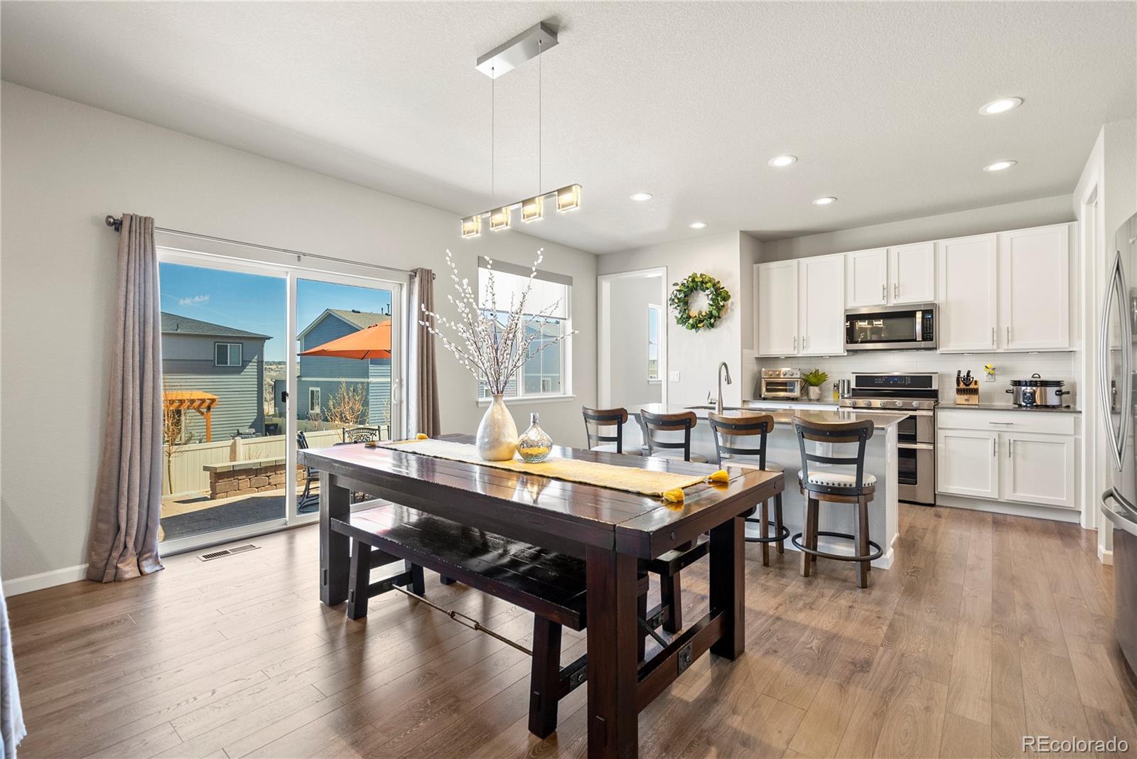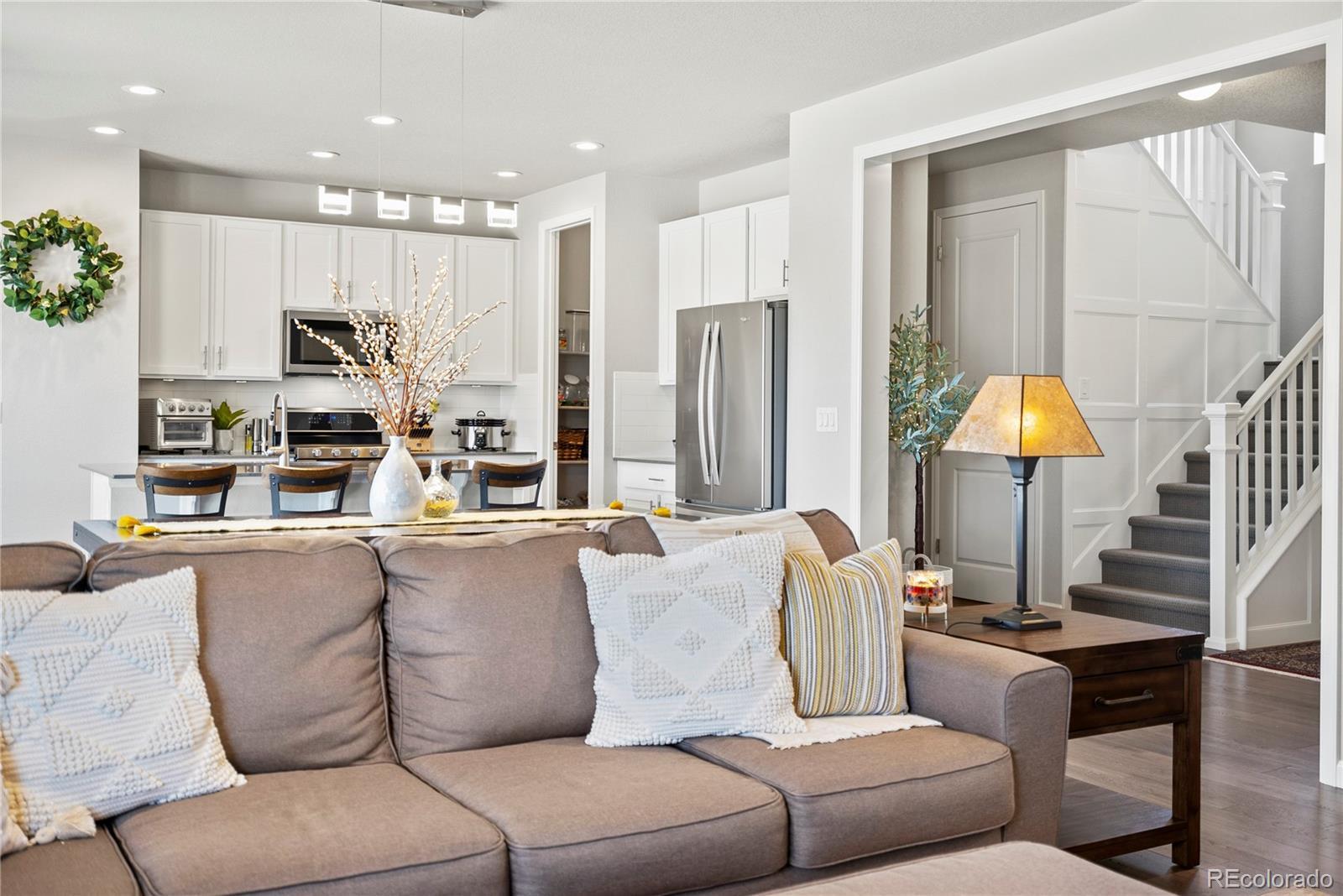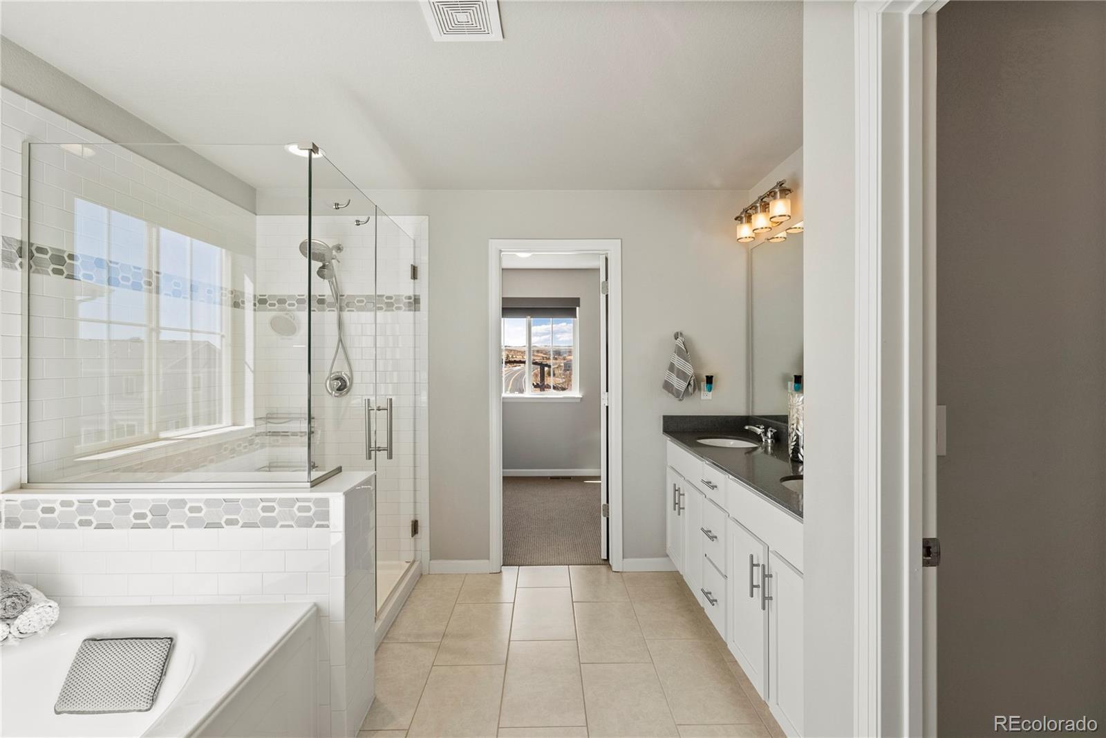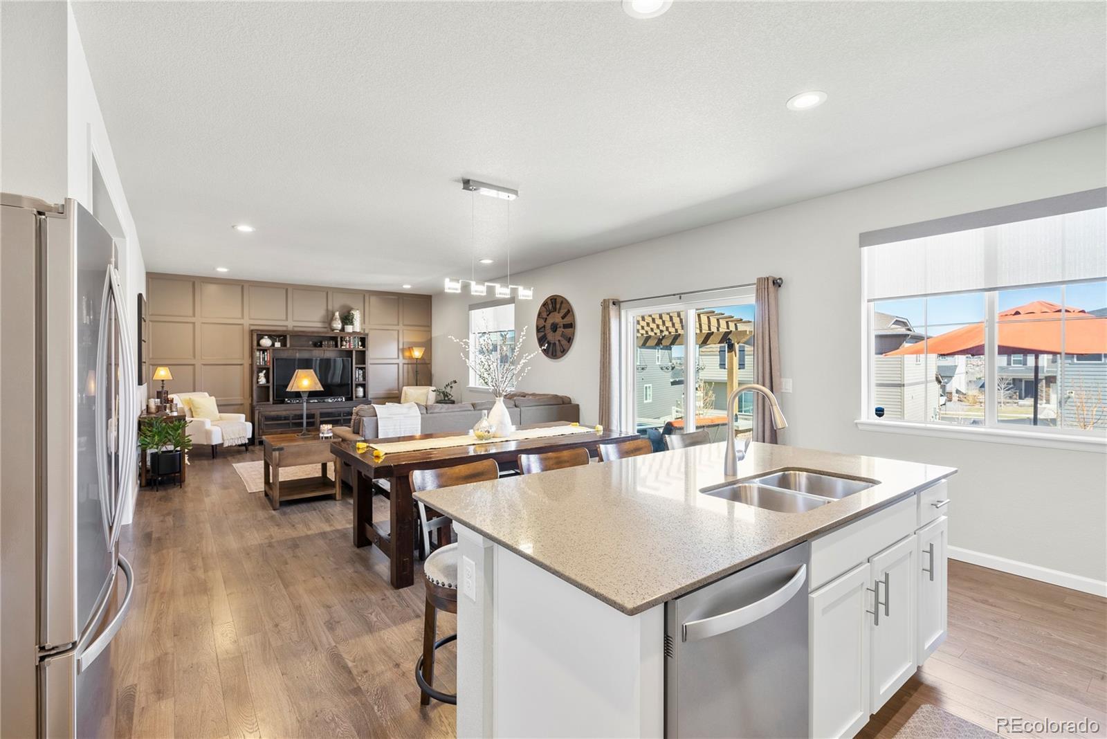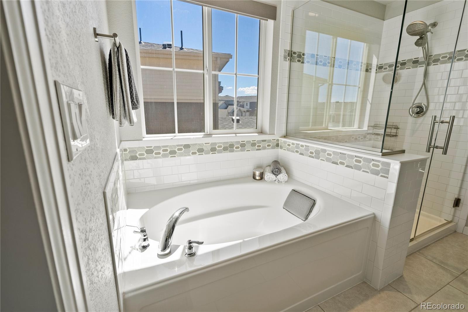 Video Tour: https://shorturl.at/PBvwt This beautifully upgraded 4-bedroom plus main-level office home is ready for its next chapter, ideally set across from a charming pocket park and just minutes from top-rated Legacy Elementary. From the moment you arrive, you’ll appreciate the inviting curb appeal—lush landscaping, mature trees, permanent Jellyfish lighting, and fully paid-off solar panels that combine beauty with smart savings. Step inside to a sun-filled, open layout designed for both everyday living and entertaining. The heart of the home is a designer kitchen with quartz countertops, crisp white cabinetry, stainless steel appliances, a spacious walk-in pantry, and a generous eat-in island. The main-level office with French doors is perfect for work, creativity, or study. Upstairs, you’ll find four roomy bedrooms, each with walk-in closets and brand-new carpet. The primary suite is your personal retreat, complete with dual closets—including a massive dressing room—and a spa-inspired bath featuring a soaking tub, frameless glass shower, and dual vanities. Laundry is conveniently located on the upper level. The rare 3-car tandem garage offers tons of storage, an attic space, and dual EV charging stations. The fully insulated, unfinished basement is a blank slate for your vision—home gym, media room, or future guest suite. Outside, unwind in your private, xeriscaped backyard designed for low maintenance and easy Colorado outdoor living. Entertain under the built-in pergola with dimmable lighting, or soak in the low-maintenance 8-person hot tub—all on a custom stone patio complete with lighting and a transferable 20-year warranty. This is more than just a house—it’s the lifestyle you’ve been searching for, blending luxury, smart features, and true community in the heart of Anthology West.