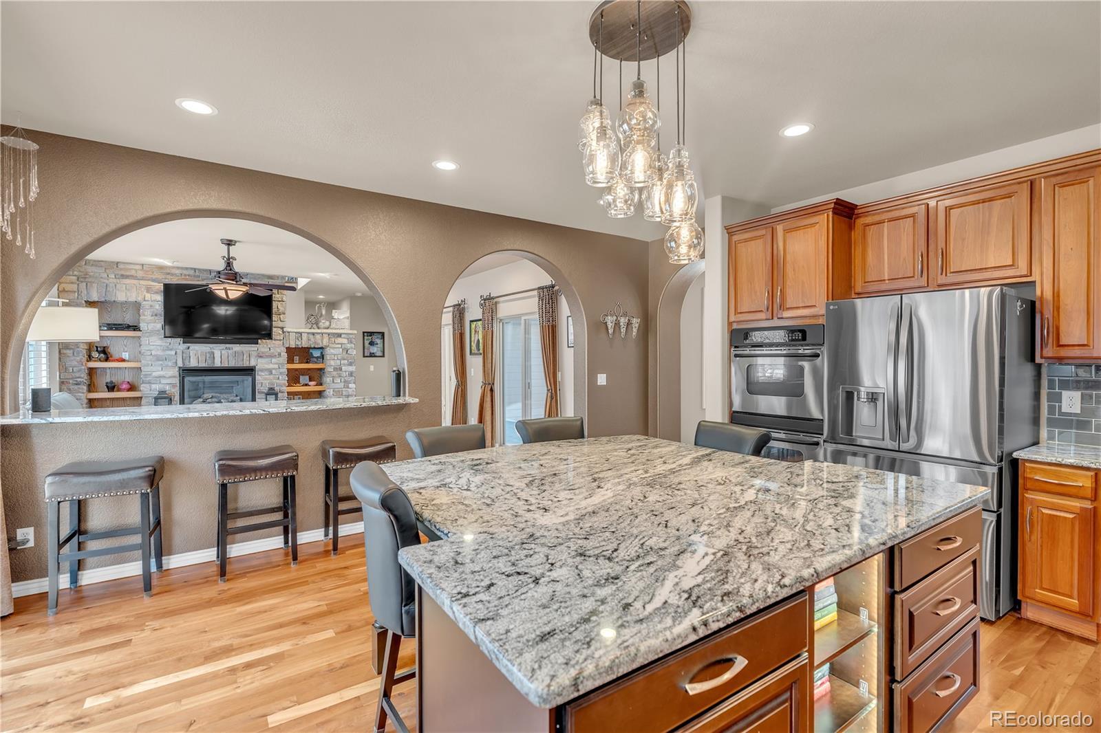 Welcome to this exceptional Joyce home in the highly sought-after Firelight neighborhood, where timeless elegance meets thoughtful design. A dramatic entry with soaring ceilings and a sweeping curved staircase creates a stunning first impression. Over 6,000 finished square feet featuring 6 bedrooms and 5 bathrooms plus a partially finished bathroom in the basement. The main level is filled with natural light from abundant windows and showcases extended hardwood floors, arched doorways, and upgrades throughout. At the heart of the home is a beautifully updated gourmet kitchen featuring a massive island, granite countertops, subway tile backsplash, raised-panel cabinets, a breakfast bar, and butler’s pantry. The inviting family room offers a gas fireplace and sliding glass doors that open to the courtyard, blending indoor and outdoor living. A dining room with built-in cabinets and in-wall speakers enhances entertaining options. The main level also includes a study, powder bath, laundry/mudroom, and a bedroom with a retreat and en-suite 3/4 bath. Upstairs, you’ll find 4 additional bedrooms, 3 bathrooms, and a spacious bonus room with balcony access overlooking the courtyard. The spacious primary suite features a retreat, a large walk-in closet, and spa-inspired 5-piece bath. A convenient second staircase adds functionality and charm. The finished basement is designed for versatility, offering a large great room, a bedroom, a flex space ideal for an office, gym, or hobbies, and a partially finished 3/4 bath. Outdoors, enjoy professional landscaping with mature trees, a large stamped concrete patio, and additional courtyard space. A 2-car garage plus a 1-car garage provide abundant parking & storage. Benefit from the solar system energy savings (lease transfer). Ideally located near schools, the rec center, shopping, dining, parks, the Backcountry Wilderness trails, 470, I-25, & the DTC, this remarkable home combines luxury and convenience in one extraordinary offering.