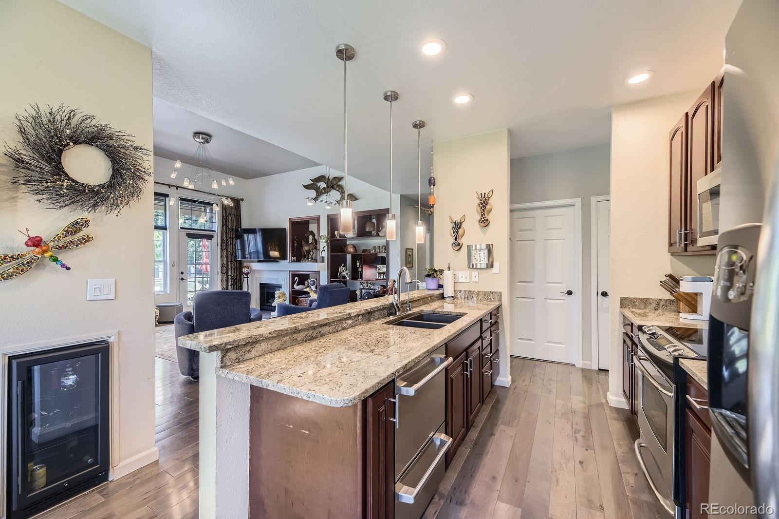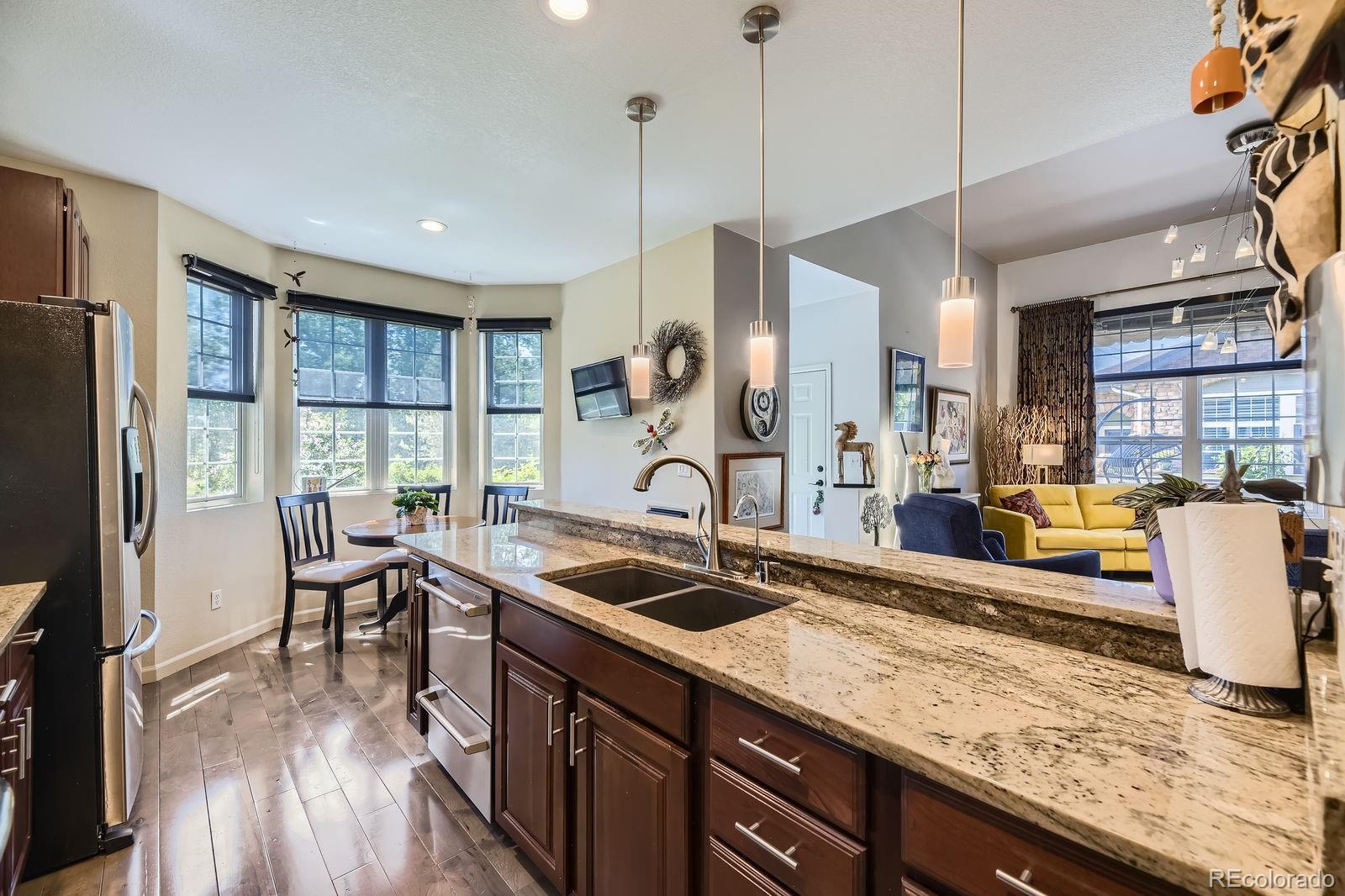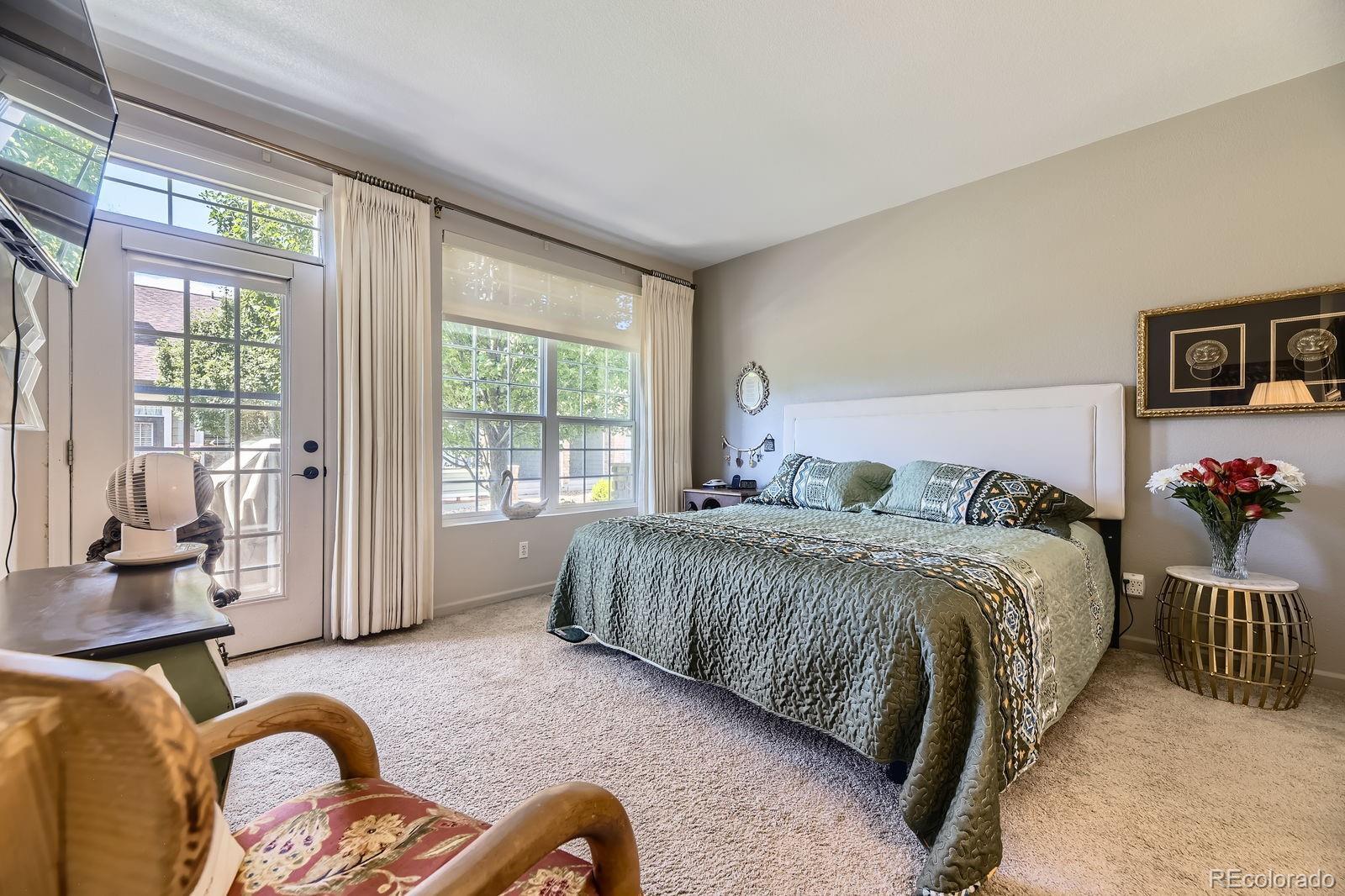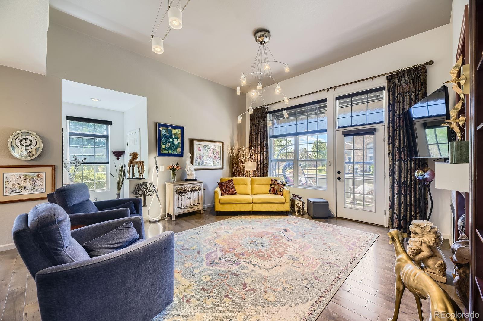 Ask about the $10,000.00 incentive. Views of the Platte River and trails. LOW MAINTENANCE LIVING. This is absolutely the best ranch-style property in Riverwalk/Greens. One-level-end-unit townhome in Riverwalk. Special features of this open floor plan on the main level include a laundry room, two bedrooms, two bathrooms, a kitchen, and a living room, making living easy. Special features include hardwood hickory floors, an upgraded kitchen and bathrooms, newer light fixtures throughout, and nice window treatments. The kitchen features stainless steel appliances, cherry wood cabinets, a newer, high-end double-drawer dishwasher, and a bay window with seating. The living room features a custom-built-in entertainment center with shelves, many south-facing windows, a patio door with an awning, hickory floors, and a gas fireplace. The primary bedroom features dual closets, carpet, a door to the patio, an en-suite five-piece bathroom with a jetted tub, heated floors, and a walk-in shower. The secondary main-floor bedroom is situated in a secluded area and is adjacent to a fully upgraded bathroom. The main level has newer Pella fiberglass windows. The basement features two additional bedrooms with egress windows, a spacious family room that may be used as a media/game area with recessed lights, an office, and a full bathroom with a steam shower. A turnkey property. This community offers a 12,000 sq. ft. clubhouse, a community facility featuring a spa, billiards room, outdoor pool, sauna, and hot tub, as well as banquet rooms, a fully equipped fitness center, a charming lounge, and a variety of monthly activities. A distinctive lifestyle community that's maintenance-free. Walking distance to restaurants, the Platte River, stores, old town Littleton, light rail, and centrally located to other areas. Just a short walk to the Platte River and historic downtown Littleton.