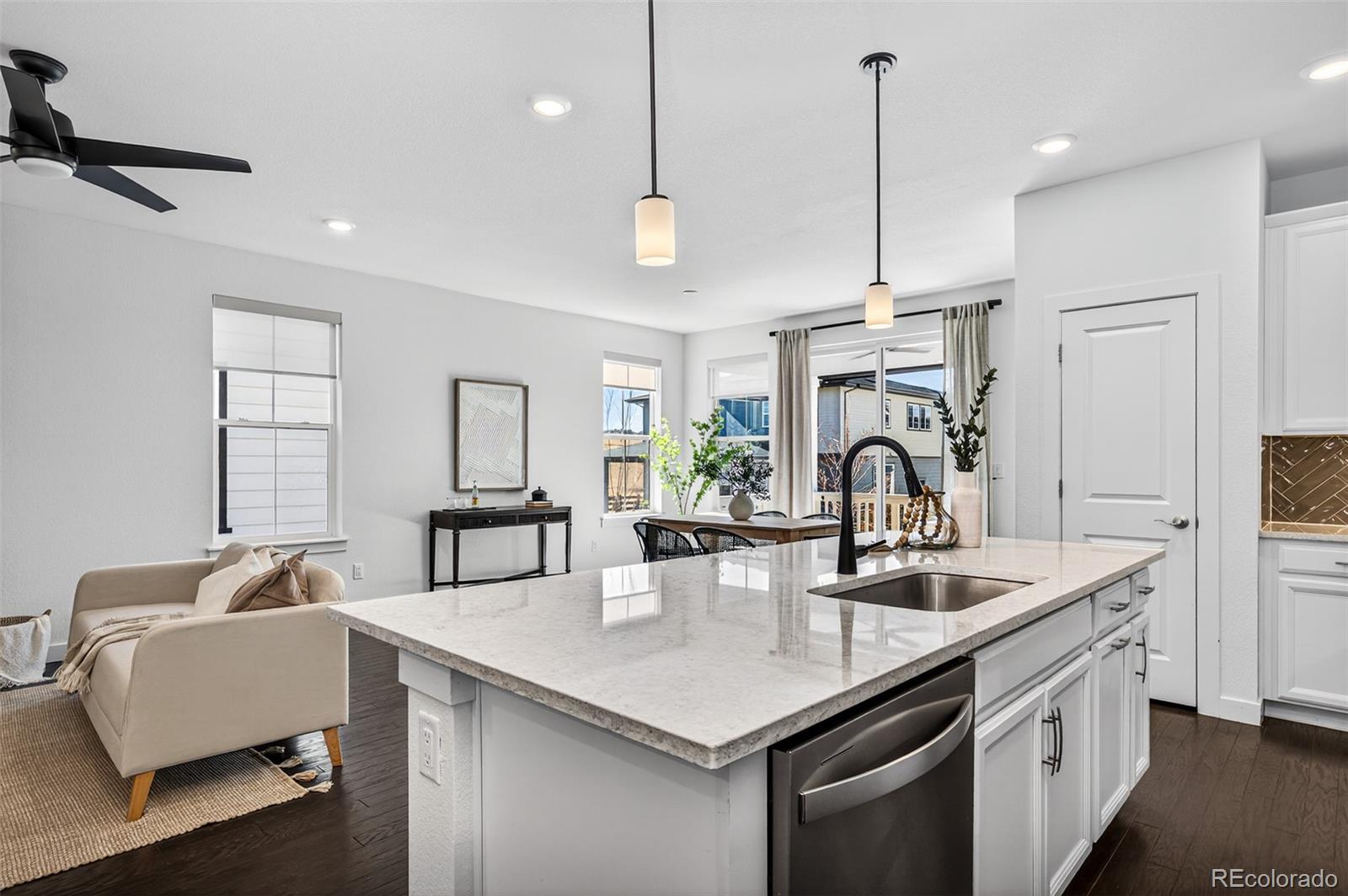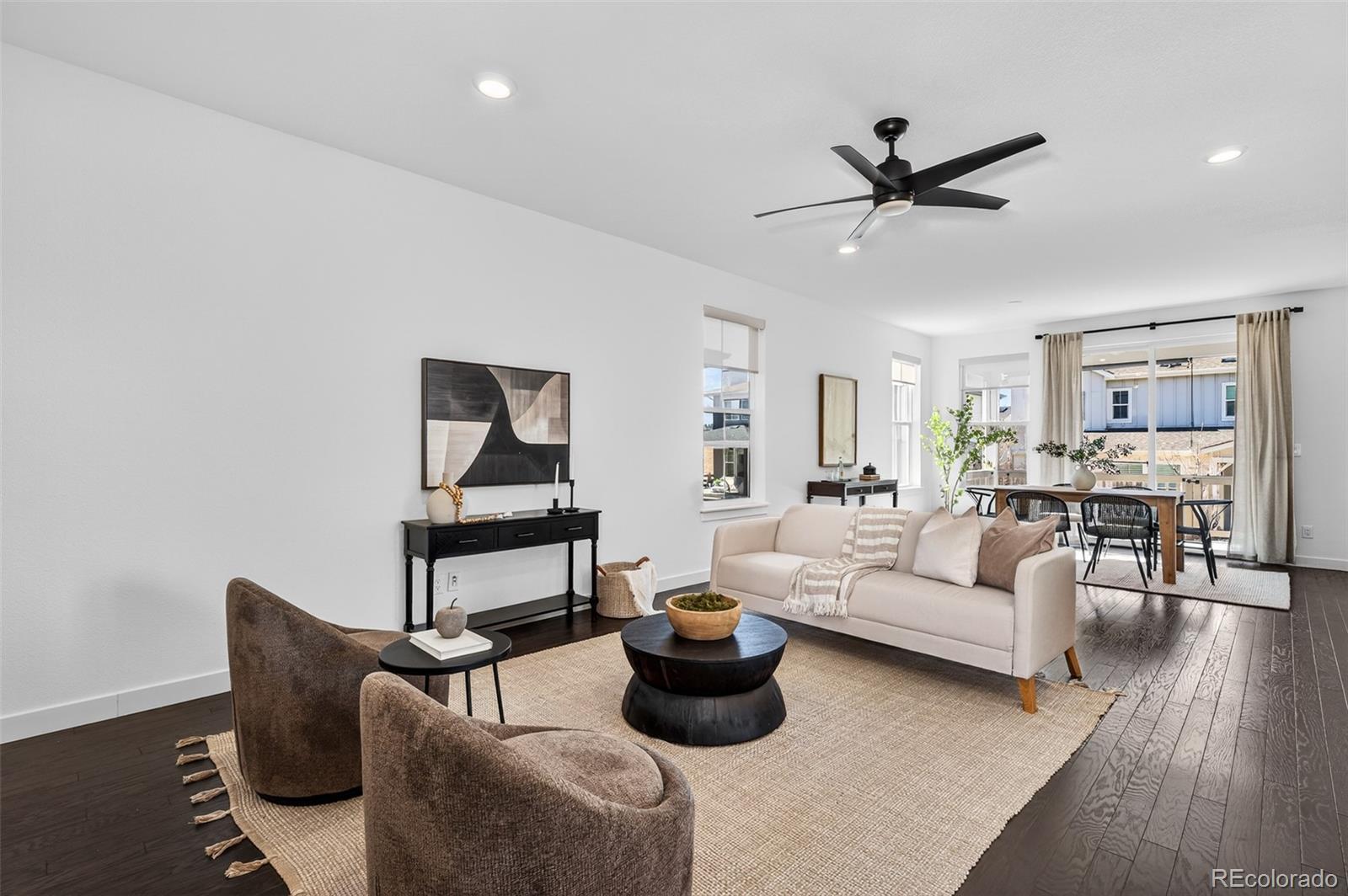 Welcome to this stunning three-year-old single-story ranch home in the highly sought-after Canyons community of Castle Pines. Designed with modern living in mind, this open floor plan offers 4 bedrooms, 3 bathrooms, and a spacious finished basement that provides endless possibilities. Main Level Highlights - Bright, open kitchen with white cabinetry, quartz countertops, and a large island with seating for four. - Adjacent dining area and expansive family room with wood floors throughout the common spaces. - Three bedrooms plus a dedicated office, perfect for work-from-home flexibility. Lower Level Retreat - Finished basement featuring an additional bedroom and bathroom. - Oversized great room ready to be reimagined as a media space, fitness area, or playroom. Outdoor & Garage Features - Covered back porch with outdoor heater and television mount, extending your living space year-round. - Two-car garage equipped with an EV charger for electric vehicles. Community & Location Nestled in the vibrant Canyons neighborhood, residents enjoy access to a community center, pool, fitness area, trails, and coffee shop. With easy access to I-25, commuting to Denver employment centers and retail destinations is a breeze. This home combines modern finishes, thoughtful design, and unbeatable community amenities—making it the perfect place to call home.