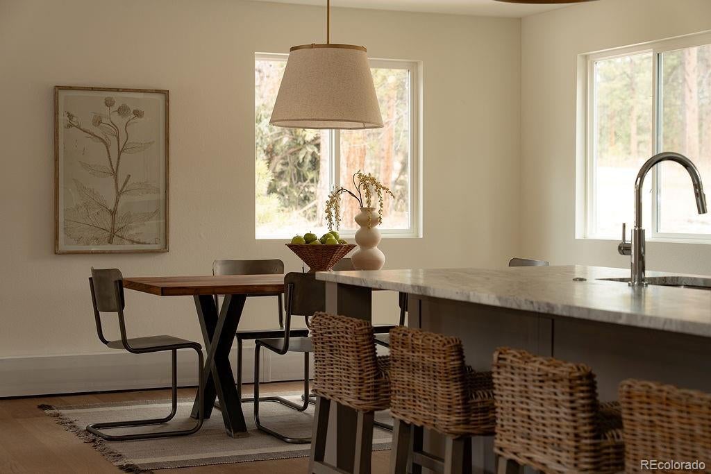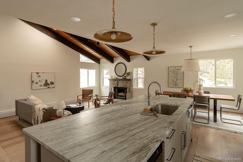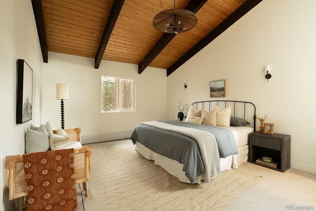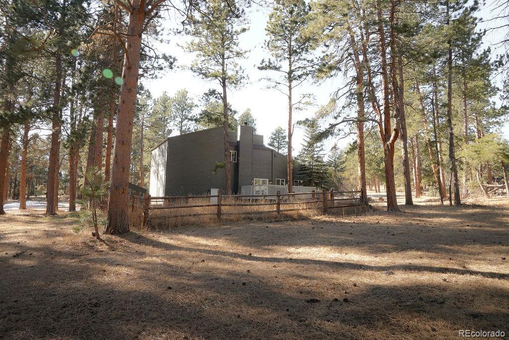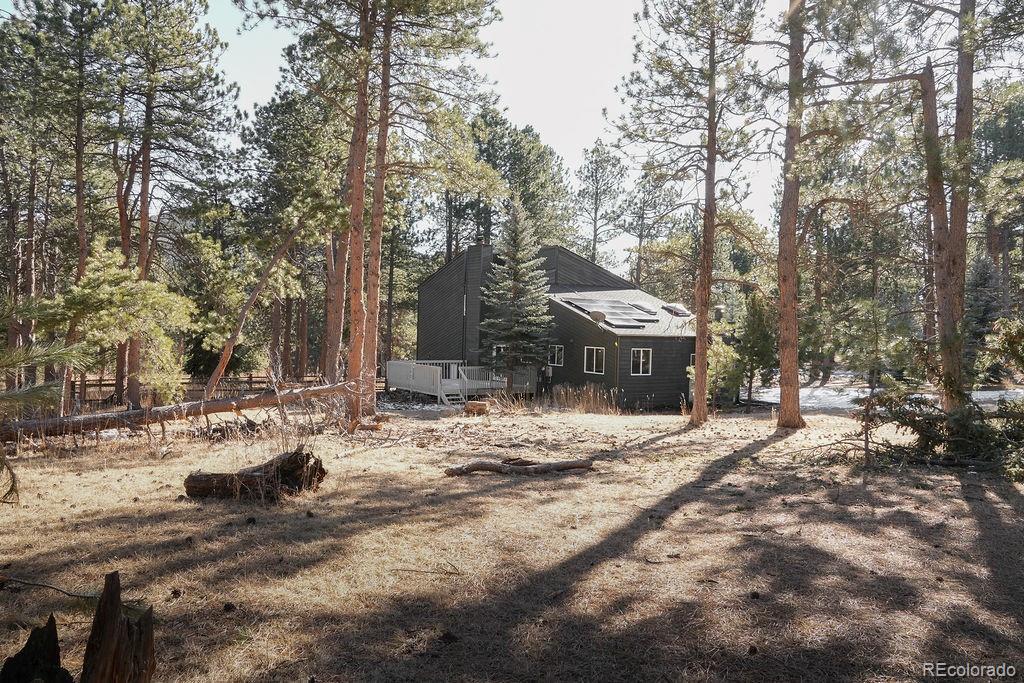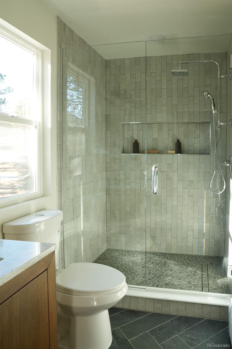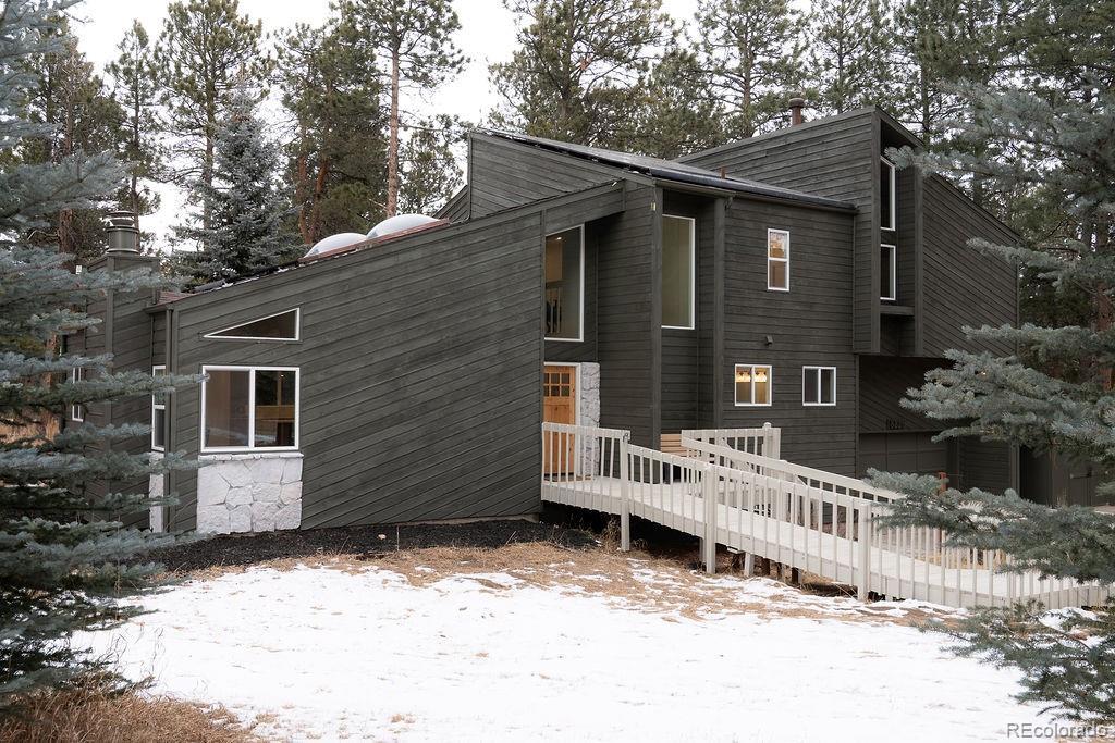 A thoughtfully curated mountain estate, this fully updated residence sits on two private, wooded acres with a south-facing driveway—blending designer luxury with peaceful seclusion just minutes from downtown Evergreen, schools and trails. Significant high-value upgrades provide sustainable luxury and long-term peace of mind, including fully paid solar panels, a new architectural-grade Class 4 hail resistant roof, and new high-efficiency windows. Inside, the open-concept heart of the home is framed by soaring vaulted wood ceilings and two majestic stone fireplaces. The chef-caliber kitchen is a true showstopper, featuring exotic leathered quartzite countertops, bespoke cabinetry with an artisan-crafted range hood, and pro-style stainless steel appliances. An oversized island and built-in pantry with roll-outs ensure effortless entertaining. The primary sanctuary offers vaulted wood ceilings, a spa-like en-suite bathroom with custom glass, a dedicated coffee bar, and a generous walk-in closet. A versatile loft space upstairs provides the ideal setting for a home office, while the lower level features a flexible suite space well-suited for a bedroom, a theatre room, or a home gym. Every square inch is revitalized with new flooring, solid-core doors, modern baseboard heating covers and designer finishes throughout. Step outside off the back deck to a sprawling 2-acre estate with a partially fenced yard and a premium TuffShed. The attached, oversized two-car garage with tall ceilings features extra loft storage for seasonal gear. Backed by a one-year craftsmanship warranty on all work completed, this is a rare turn-key opportunity to own a flawlessly updated mountain retreat. HOA payment is voluntary.
