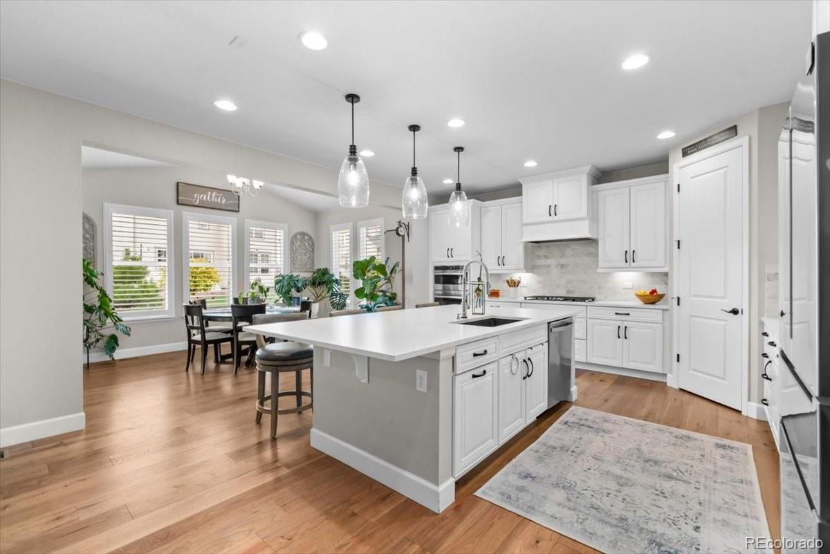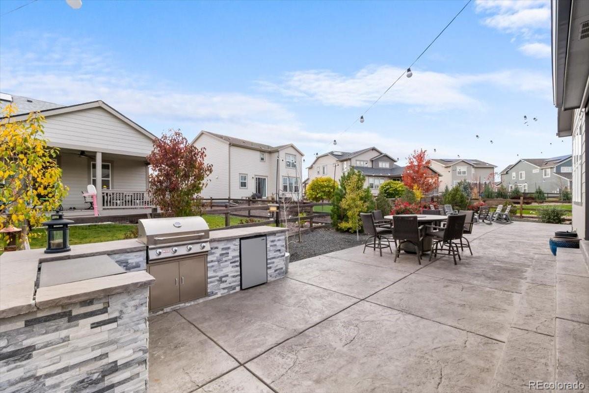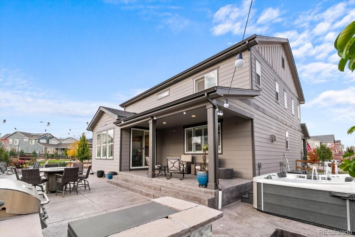 Welcome to one of the premier homes in Barefoot Lakes—perfectly positioned on a quiet cul-de-sac and loaded with luxury upgrades. This 5-bedroom, 5-bath beauty showcases more than $160,000 in design-center finishes plus an additional $80,000+ outdoor retreat crafted for entertaining in style. Step inside to find real pecan hardwood floors, 10-foot ceilings, 9-foot solid wood doors, plantation shutters, and a warm, open great room centered around a gas fireplace. The gourmet kitchen impresses with a massive brushed marble island, double ovens, gas cooktop, soft-close cabinets with built-in organizers, a walk-in pantry, and a secondary pantry for appliances or fine dishware. A dedicated office with French glass doors completes the main level. Upstairs, the serene primary suite features a coffered ceiling and spa-inspired bath with an oversized glass walk-in shower, dual rainfall showerheads, and a generous walk-in closet. Three additional bedrooms, two full baths, and a versatile loft provide plenty of flexible living space. The finished basement offers a large recreation area, a fifth bedroom with egress windows, a full bath, and even room to add a sixth bedroom. Dual furnaces and A/C units deliver year-round comfort. Outside, the backyard oasis invites you to relax or entertain with a covered patio, stamped concrete, a full outdoor kitchen, raw stone gas fire pit, hot tub (included), lush lawn, and multiple seating areas. Enjoy all that Barefoot Lakes has to offer—miles of scenic trails, two sparkling lakes, a fitness center, pool, parks, and easy access to I 25, Denver, Boulder, and Fort Collins. Experience Colorado living at its finest.