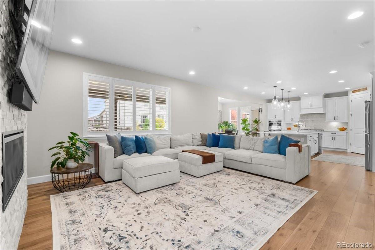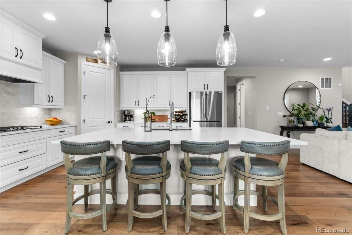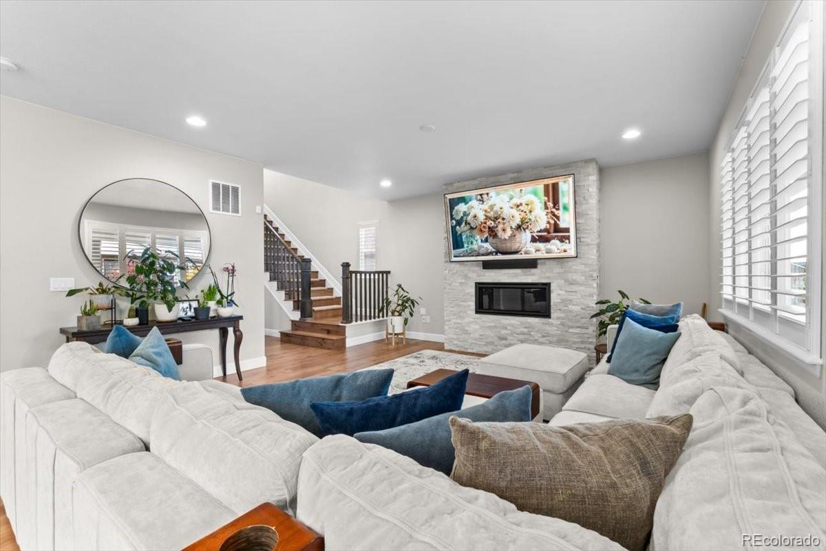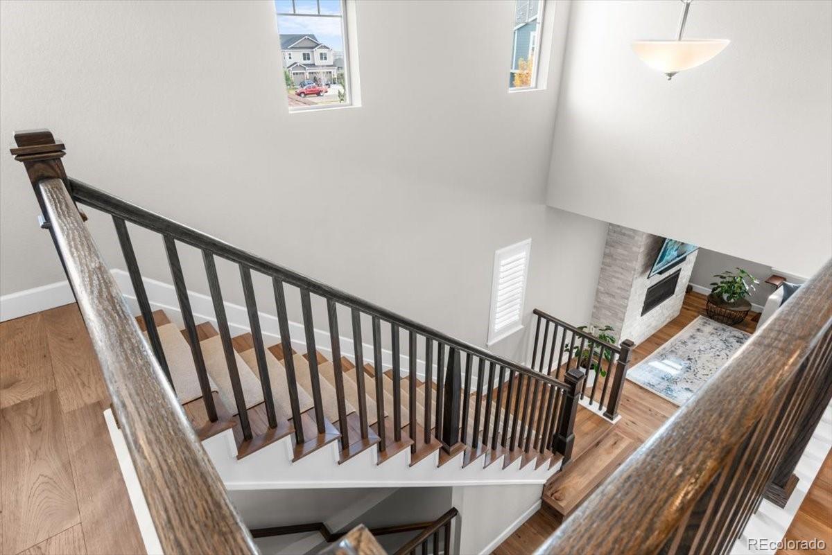 Welcome to one of the premier homes in Barefoot Lakes—perfectly positioned on a quiet cul-de-sac and loaded with luxury upgrades. This 5-bedroom, 5-bath beauty showcases more than $160,000 in design-center finishes plus an additional $80,000+ outdoor retreat crafted for entertaining in style. Step inside to find real pecan hardwood floors, 10-foot ceilings, 9-foot solid wood doors, plantation shutters, and a warm, open great room centered around a gas fireplace. The gourmet kitchen impresses with a massive brushed marble island, double ovens, gas cooktop, soft-close cabinets with built-in organizers, a walk-in pantry, and a secondary pantry for appliances or fine dishware. A dedicated office with French glass doors completes the main level. Upstairs, the serene primary suite features a coffered ceiling and spa-inspired bath with an oversized glass walk-in shower, dual rainfall showerheads, and a generous walk-in closet. Three additional bedrooms, two full baths, and a versatile loft provide plenty of flexible living space. The finished basement offers a large recreation area, a fifth bedroom with egress windows, a full bath, and even room to add a sixth bedroom. Dual furnaces and A/C units deliver year-round comfort. Outside, the backyard oasis invites you to relax or entertain with a covered patio, stamped concrete, a full outdoor kitchen, raw stone gas fire pit, hot tub (included), lush lawn, and multiple seating areas. Enjoy all that Barefoot Lakes has to offer—miles of scenic trails, two sparkling lakes, a fitness center, pool, parks, and easy access to I 25, Denver, Boulder, and Fort Collins. Experience Colorado living at its finest.