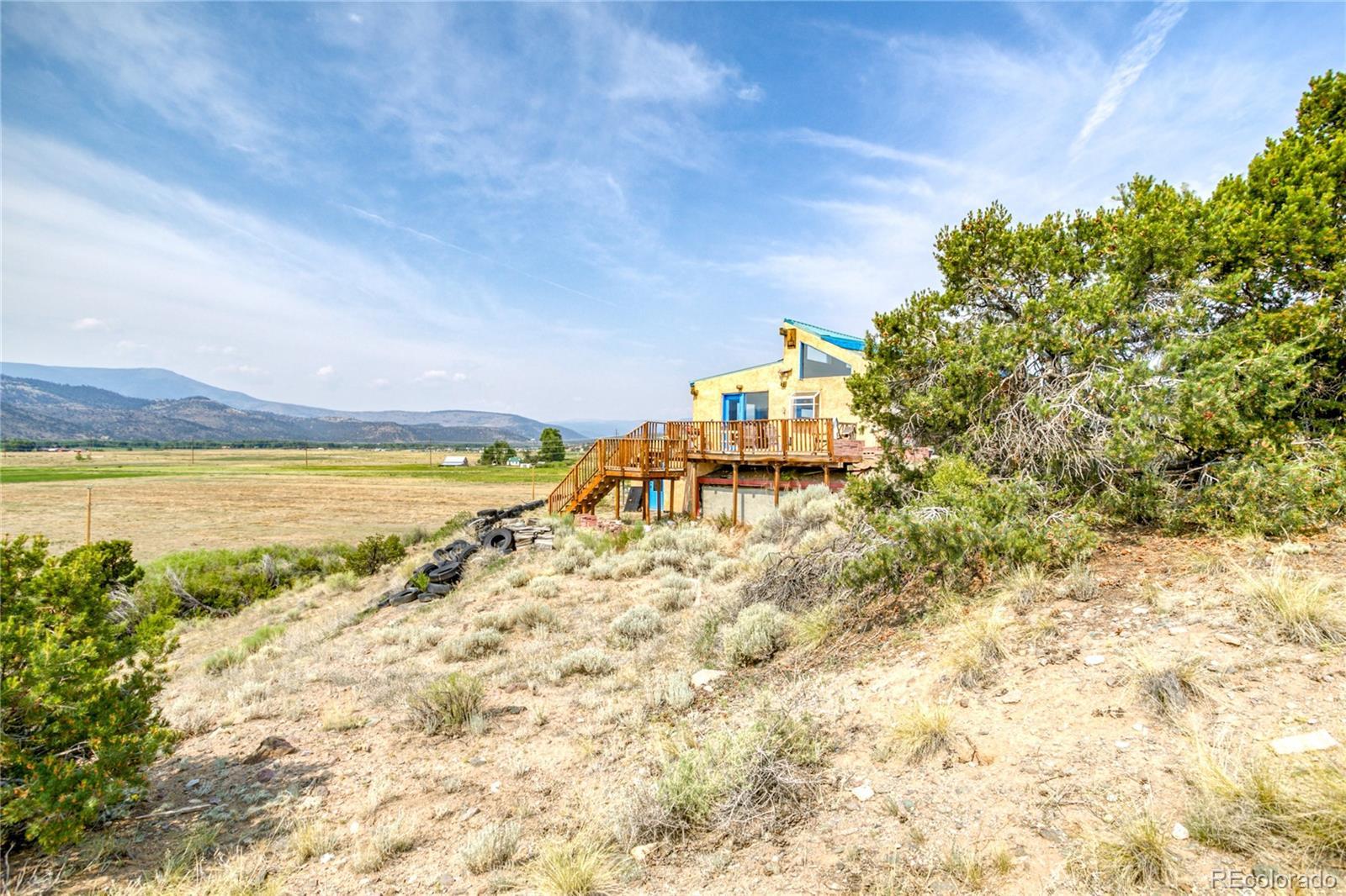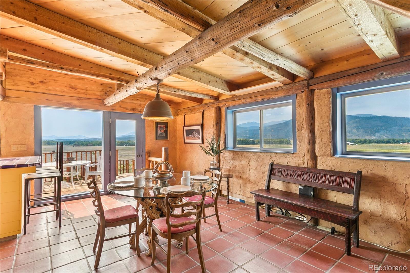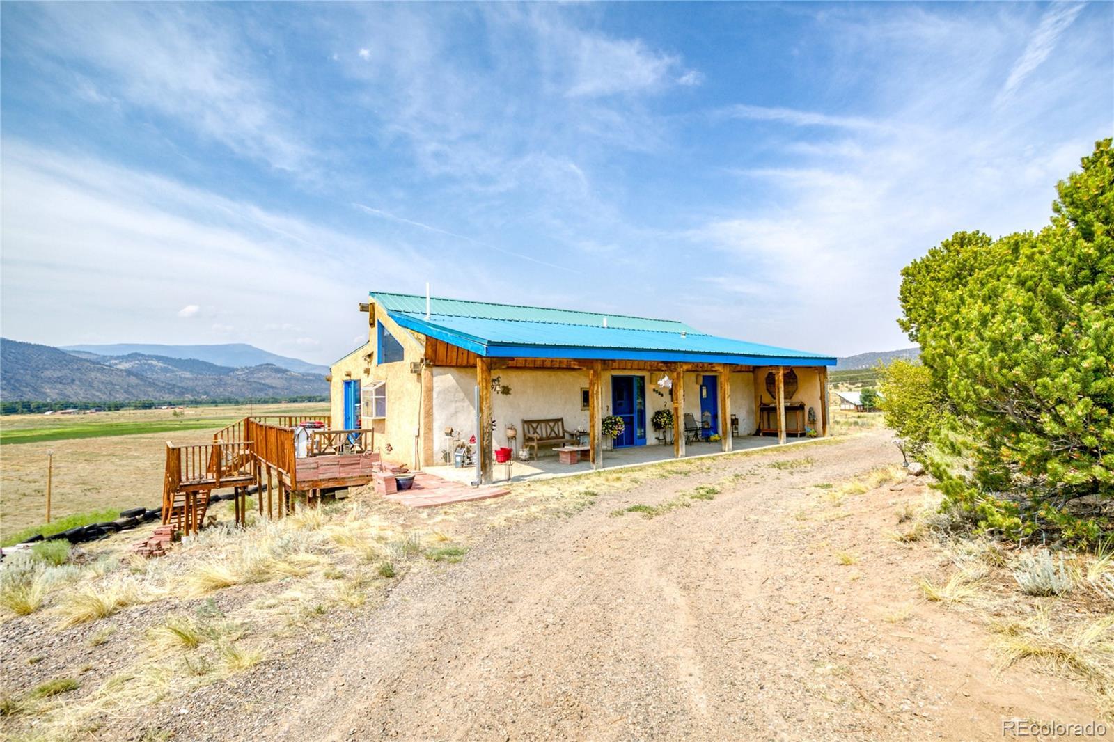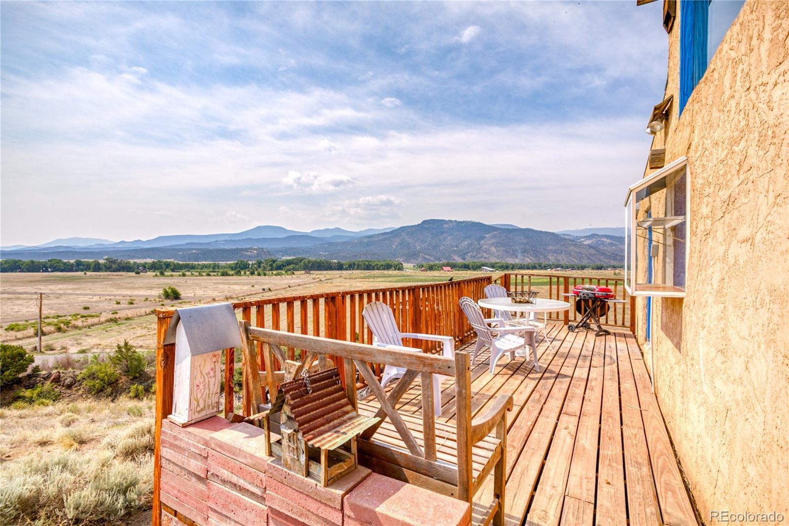 This Southwest-Style Hacienda sits on 5+ Scenic Acres with Horse Facilities and Mountain Views Discover your own slice of Southern Colorado paradise in this charming Southwest-style hacienda, perfectly situated on 5.11 acres with awe-inspiring views of the San Juan Mountains, the expansive San Luis Valley, and even a distant glimpse of the Rio Grande River. Located between South Fork and Del Norte - a short 10 minute drive to either town. This property offers both the serenity of country living and the convenience of nearby amenities. Step inside to find a thoughtfully designed home that celebrates the spirit of the region. From the custom tile floors—complete with stamped buffalo prints—to the rich wood beams reclaimed from an historic mine in Creede, every corner of this home tells a story. The open-concept living and dining areas are bathed in southern light, providing both passive solar warmth and an ever-changing mountain view that serves as the perfect backdrop for daily life. Whether you’re an outdoor enthusiast or simply love to relax in nature, you’ll appreciate the variety of outdoor living spaces—an east-facing deck for morning coffee, a covered back porch to unwind, or a sunny southern or western patio to watch the evening light fade across the valley. Bring your horses! The property features a corral and barn, ideal for equestrian use. Or dream a little differently and consider converting the barn into a guest house or short-term rental. Inside, you’ll find practical touches like a mudroom just off the foyer. Te office even has its own ¾ bathroom and could easily serve as a third bedroom or guest suite. A custom spiral staircase leads to the walk-out basement, where you’ll find a spacious fireside sunroom/living room, two private bedroom suites—each with large walk-in closets—and a laundry room. Whether you're looking for a quiet retreat, a horse property, or a base for your mountain adventures.