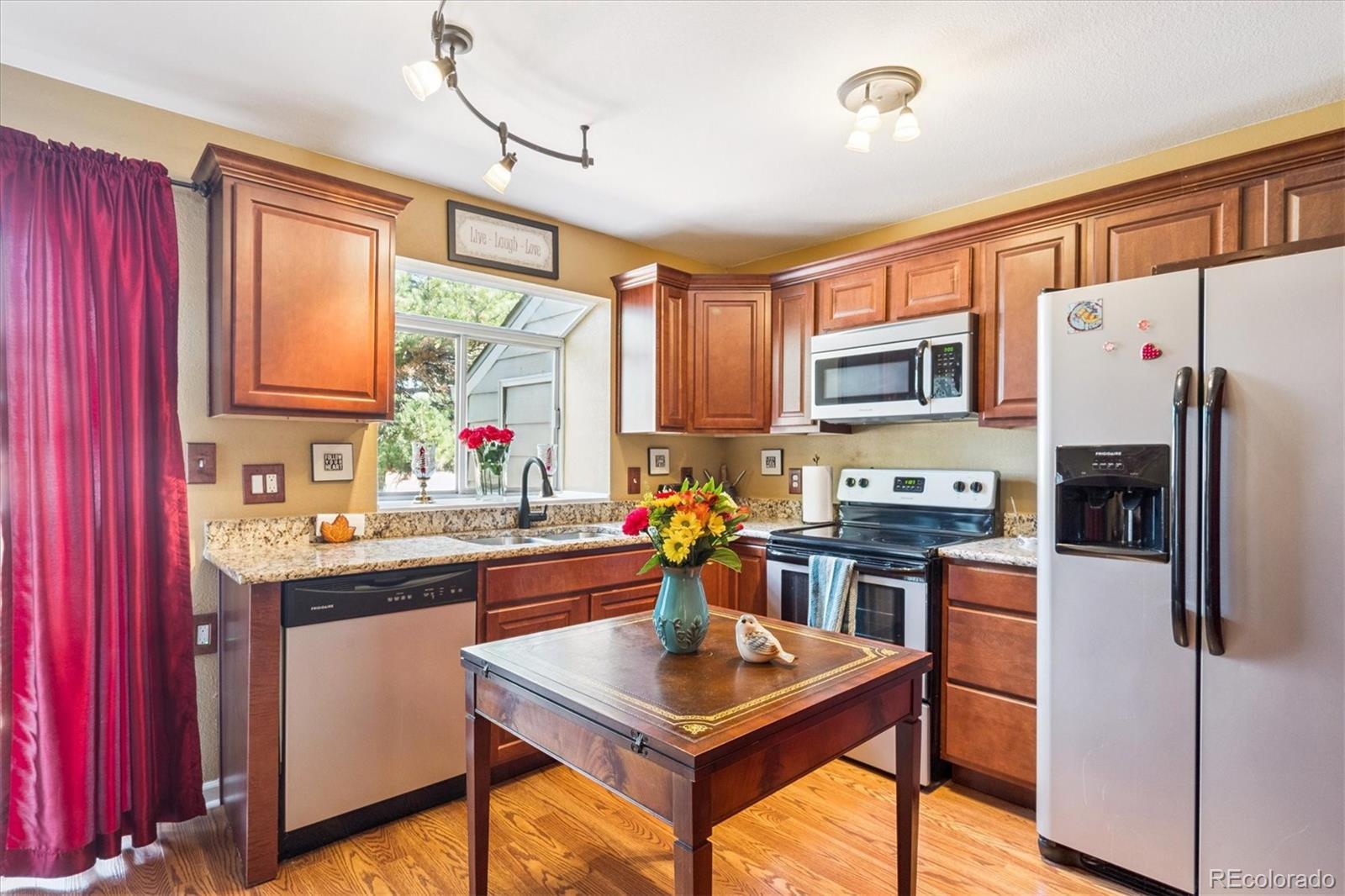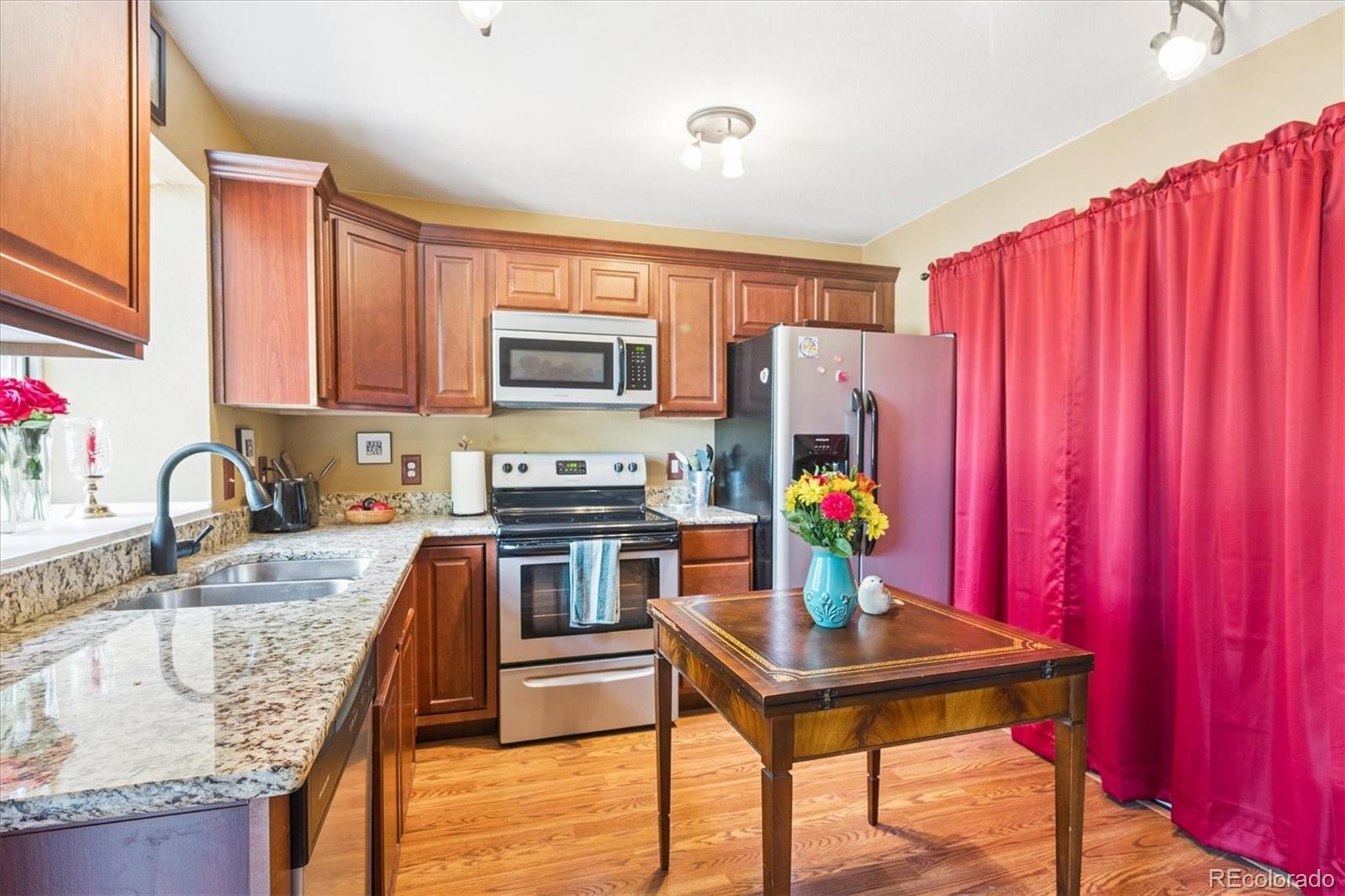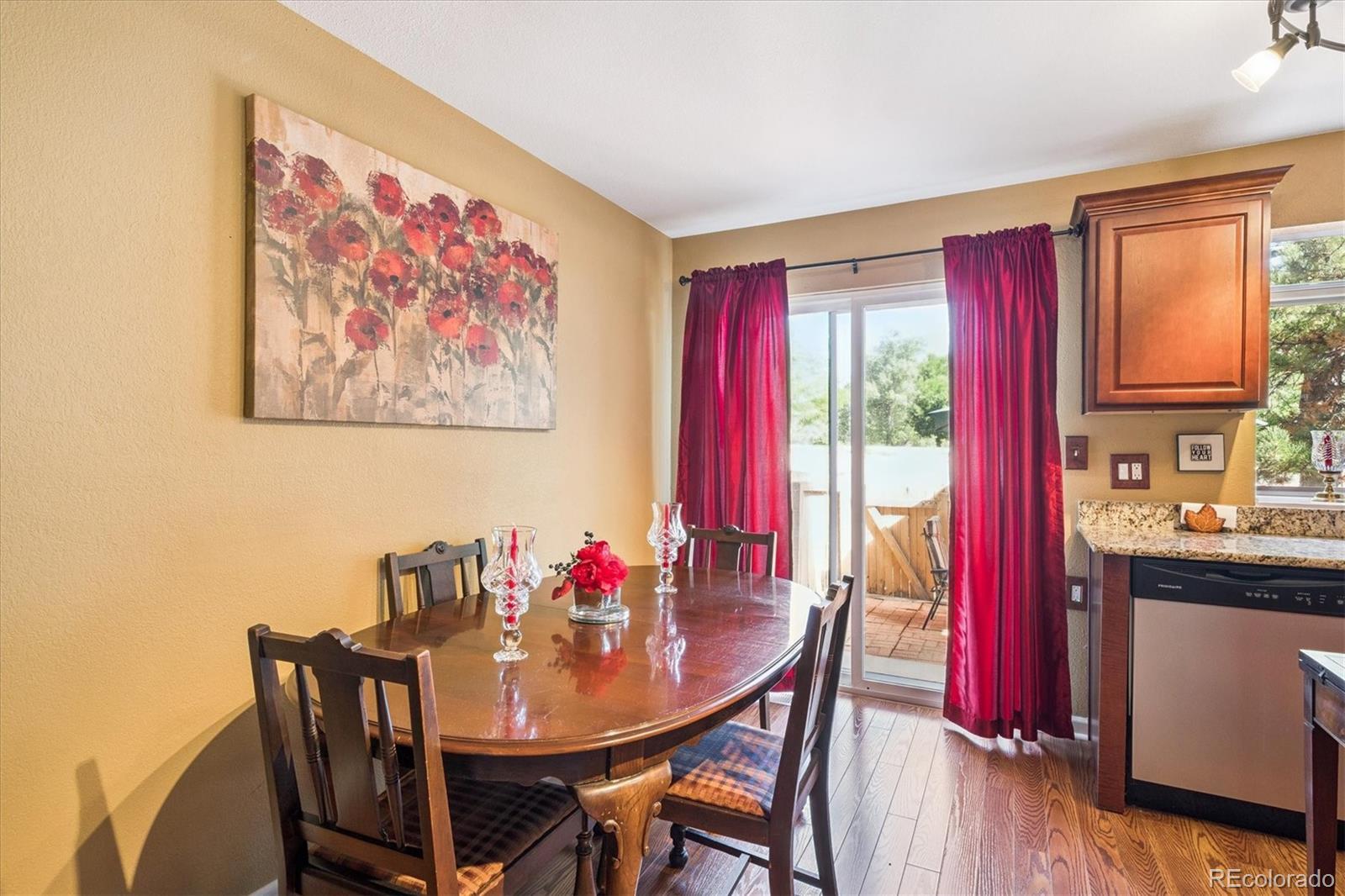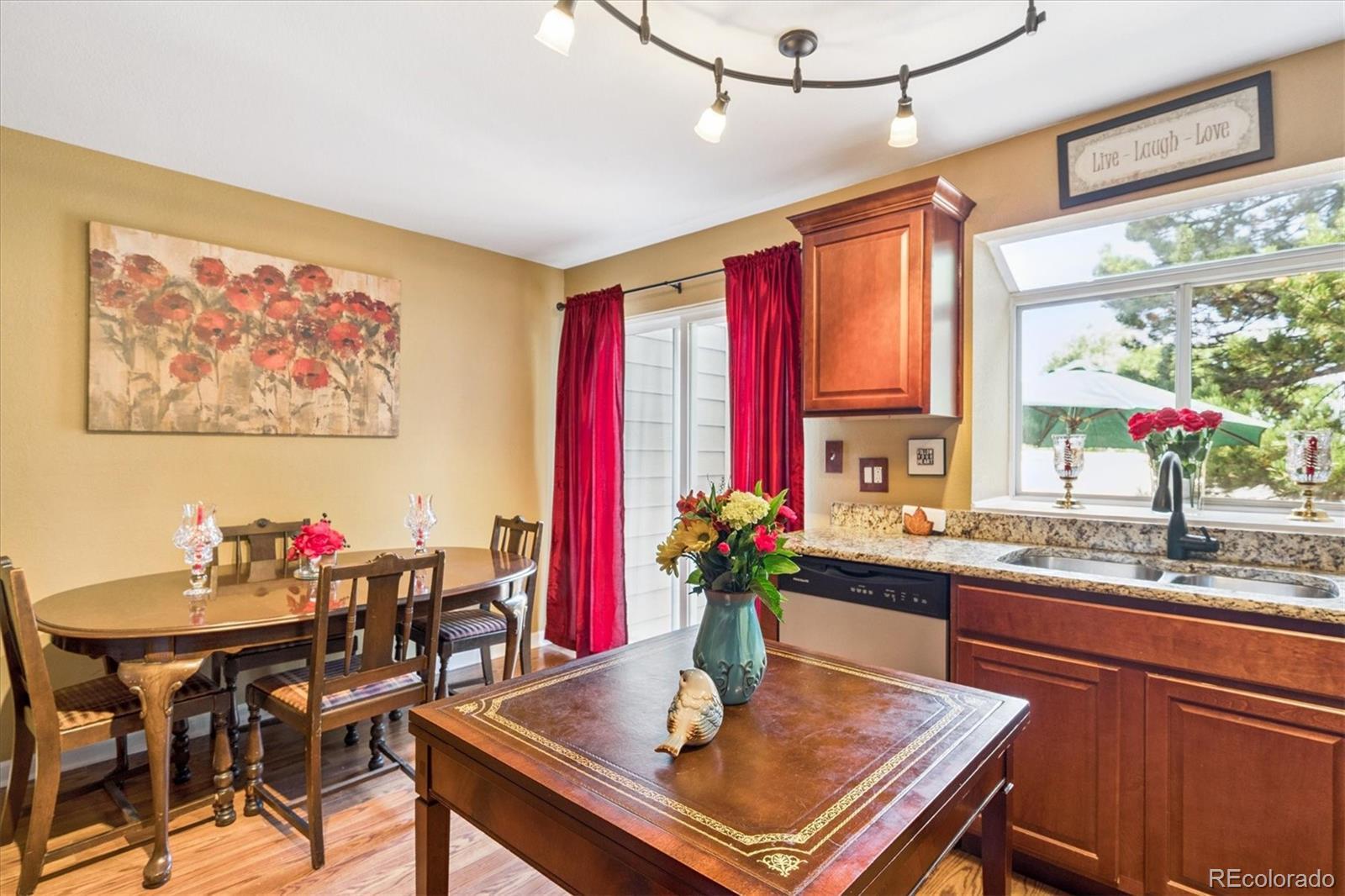 Welcome home to this beautifully refreshed 2-story, 2-bedroom, 3-bath townhome-style condo tucked away in the sought-after Dakota Station community—where modern updates meet timeless charm. Thoughtfully designed and full of cheer, this home blends modern updates with classic details to create a warm, inviting space you’ll love coming home to. The main level showcases beautiful flooring and a bright, open layout that flows effortlessly from the cozy living room—complete with a fireplace and plenty of sunshine—right into the dining area and kitchen, making it perfect for everyday living and effortless entertaining. The kitchen is a true standout, showcasing sleek granite countertops, rich cherry wood cabinetry, stainless steel appliances, and a sunny bay window that overlooks your private patio. Just outside the sliding glass door is your own outdoor escape—a peaceful patio perfect for dining under the stars, weekend gardening, or simply relaxing after a long day. Upstairs, the primary suite feels bright and breezy with its vaulted ceilings, charming bay window, and an updated ¾ bath that adds a touch of style to your daily routine.The second bedroom brings the same airy vibe with vaulted ceilings and tons of natural light—plus it’s perfectly positioned right next to a full bath, making it an ideal setup for guests, roommates, or your dream home office. Bonus perks: In-unit laundry with washer and dryer, a reserved parking space right out front, and ample guest parking nearby. The Dakota Station community offers a sparkling pool, clubhouse, and tennis courts, all maintained by a low HOA that covers water, trash, and snow removal—making life here refreshingly low-maintenance. Tucked away in a quiet, well-kept neighborhood near parks, trails, top-rated Jeffco schools, and local dining, with quick access to C-470 for easy commuting or weekend getaways, this home is the perfect mix of comfort, convenience, & style. Come see it for yourself—homes like this don’t last long!