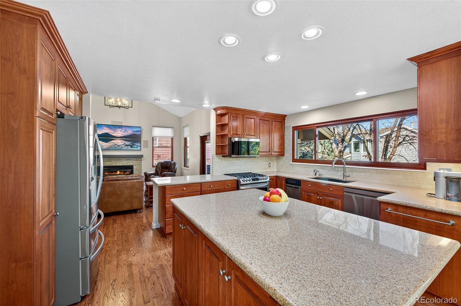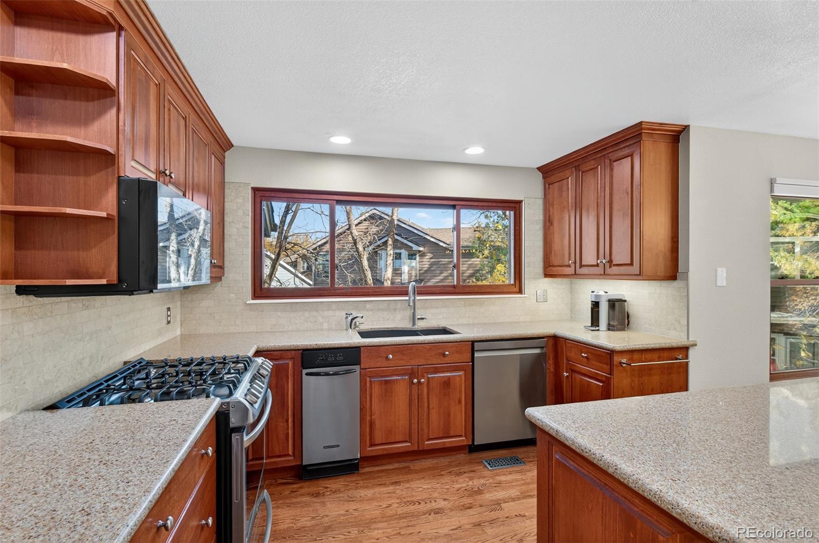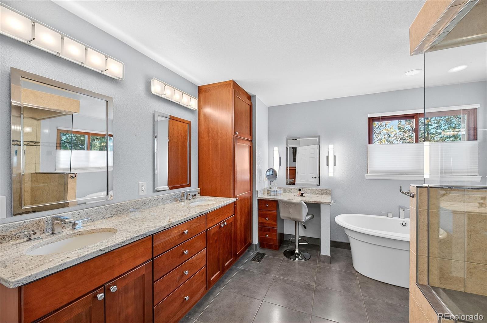 Welcome to the highly sought-after Ken Caryl Valley. This updated four-bedroom, four-bath residence has been meticulously renovated from top to bottom, providing both comfort and functionality. The main level features formal living and dining areas, a spacious laundry room, an eat-in kitchen equipped with premium stainless steel appliances, a gas range, a family room enhanced by an upgraded gas fireplace, a versatile bedroom/study, and a ¾ bath. On the upper level, you will find two generously proportioned bedrooms that share a Jack and Jill bath with dual sinks. There is also a large primary suite complete with a sitting area and an exquisite ensuite bath featuring a steam shower, built-in vanity, walk-in closet, and scenic views. The lower level boasts a bright great room, a utility sink that can be easily transformed into a wet bar, a substantial study, and ample storage space. Step outside into the enchanting backyard, which resembles a park. It features a covered deck, a paver patio equipped with a television and a hot tub, as well as a spacious side yard ideal for a swing set or playing ball. The most outstanding feature of Ken Caryl is its exceptional amenities, which include three swimming pools, numerous parks and playgrounds, extensive interior and exterior trails, and facilities for tennis, pickleball, and an equestrian center. 3 Car Garage~Newer Windows~Hot Tub~Newer Furnace, Hot Water Heater, and A/C~Whole House Humidifier and Air Scrubber~Steam Shower~Composite Covered Deck.