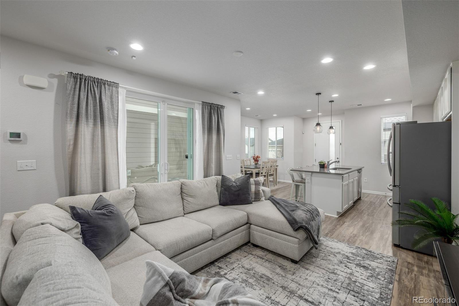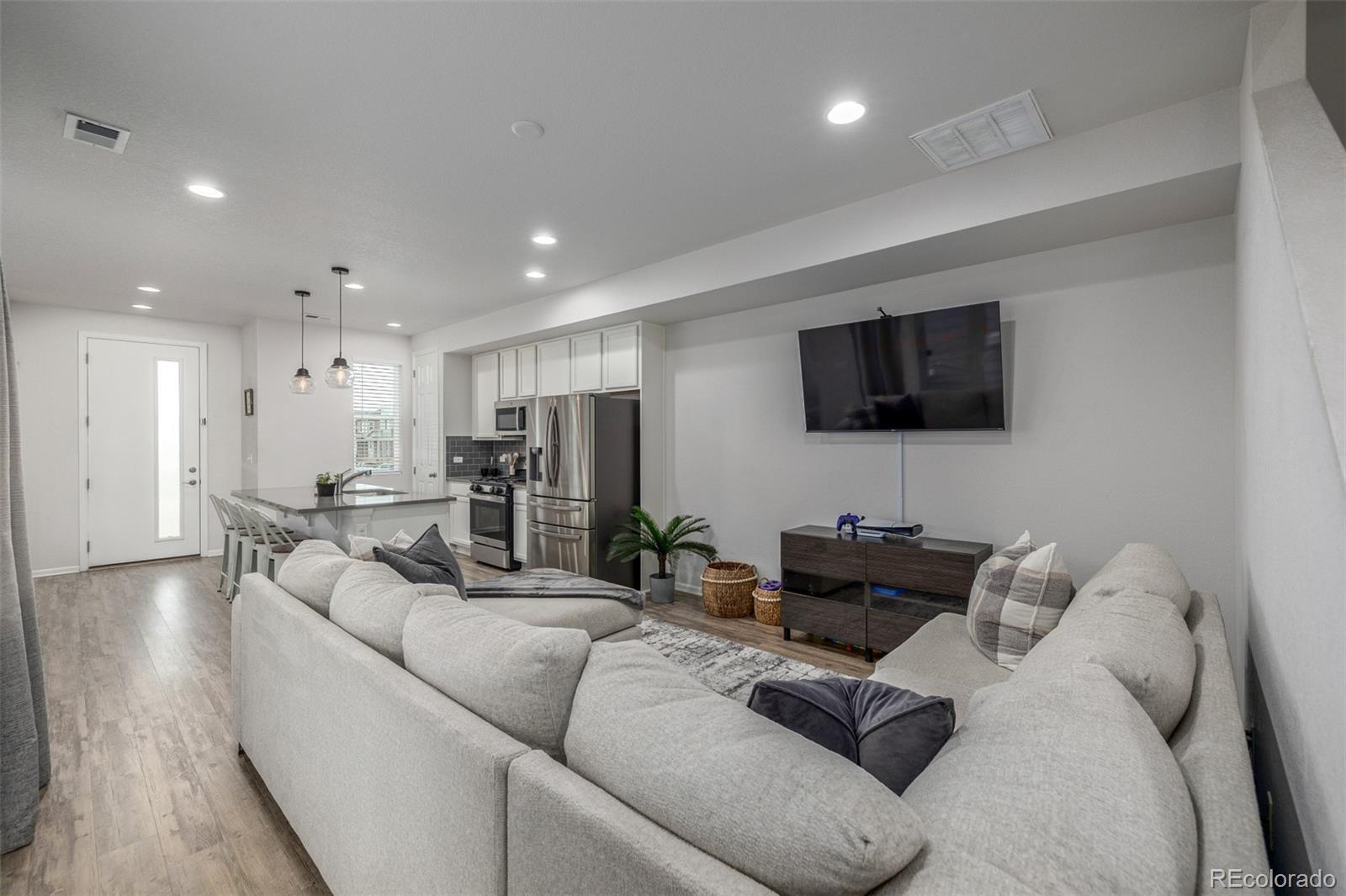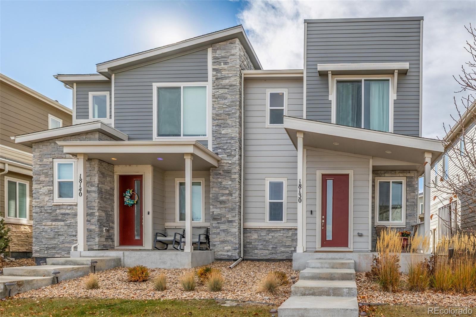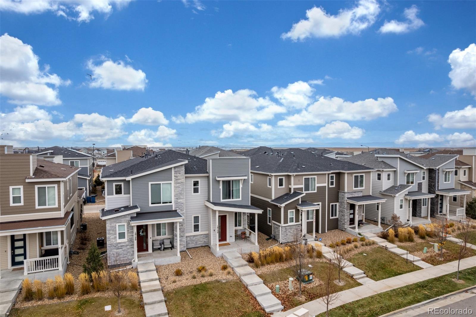 A chic modern face and striking red front door set a welcoming tone for this two story townhome. A covered front patio and a generous setback create a calming vantage point to watch the world flow by. The entry opens into a bright main level with an intuitive open plan, where dining and living areas connect effortlessly. Plank floors, recessed lights, and a neutral palette shape a warm contemporary space. The kitchen stands as a central gathering place with a large center island offering abundant prep space and seating at the breakfast bar. Pendant lights adds a refined touch, while grey counters, white cabinetry, and a cool tone tile backsplash bring visual interest and modern appeal. Stainless appliances, a pantry, and thoughtful storage support the ease of daily living. On the upper level, the private quarters are serene and well proportioned. The primary bedroom offers a calming retreat with spacious walk-in closet and ensuite with dual sinks. Two additional bedrooms provide flexibility for work, rest, or creative use. A conveniently located laundry area completes this level with practical efficiency. Outdoor living is enhanced by the covered side patio, an inviting spot for morning coffee or an evening pause. The attached two car garage is fully drywalled and offers valuable convenience along with the ease of low maintenance living throughout. This property also presents a rare financial advantage with the potential for a 2.625% assumable loan, offering a pathway to an exceptionally affordable monthly payment for the next owner and elevating the long term value of this home. The surrounding neighborhood adds meaningful appeal with several parks within a short walk, nearby shopping and restaurants, and quick access to DIA for effortless travel. From the front steps, sunsets paint the sky in vivid color, a daily moment cherished for its calm and beauty. This residence pairs style, comfort, and connection with a location that places every convenience within reach.