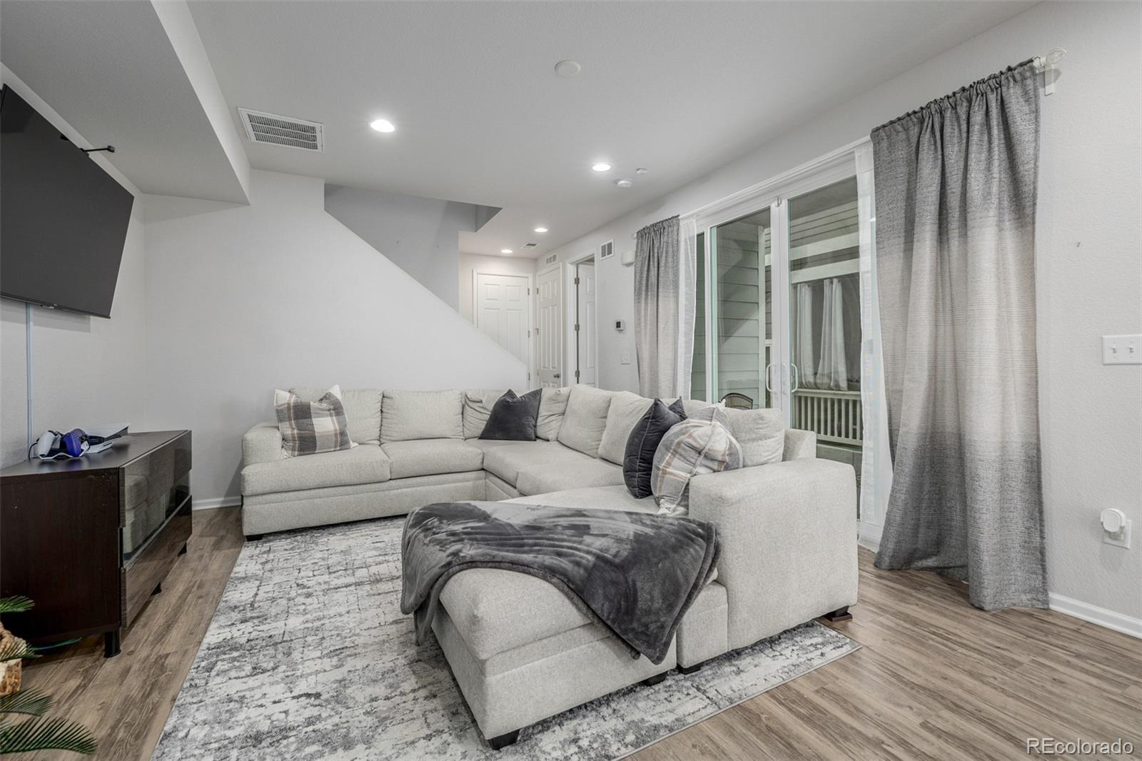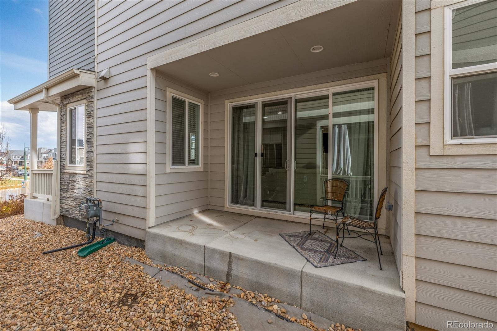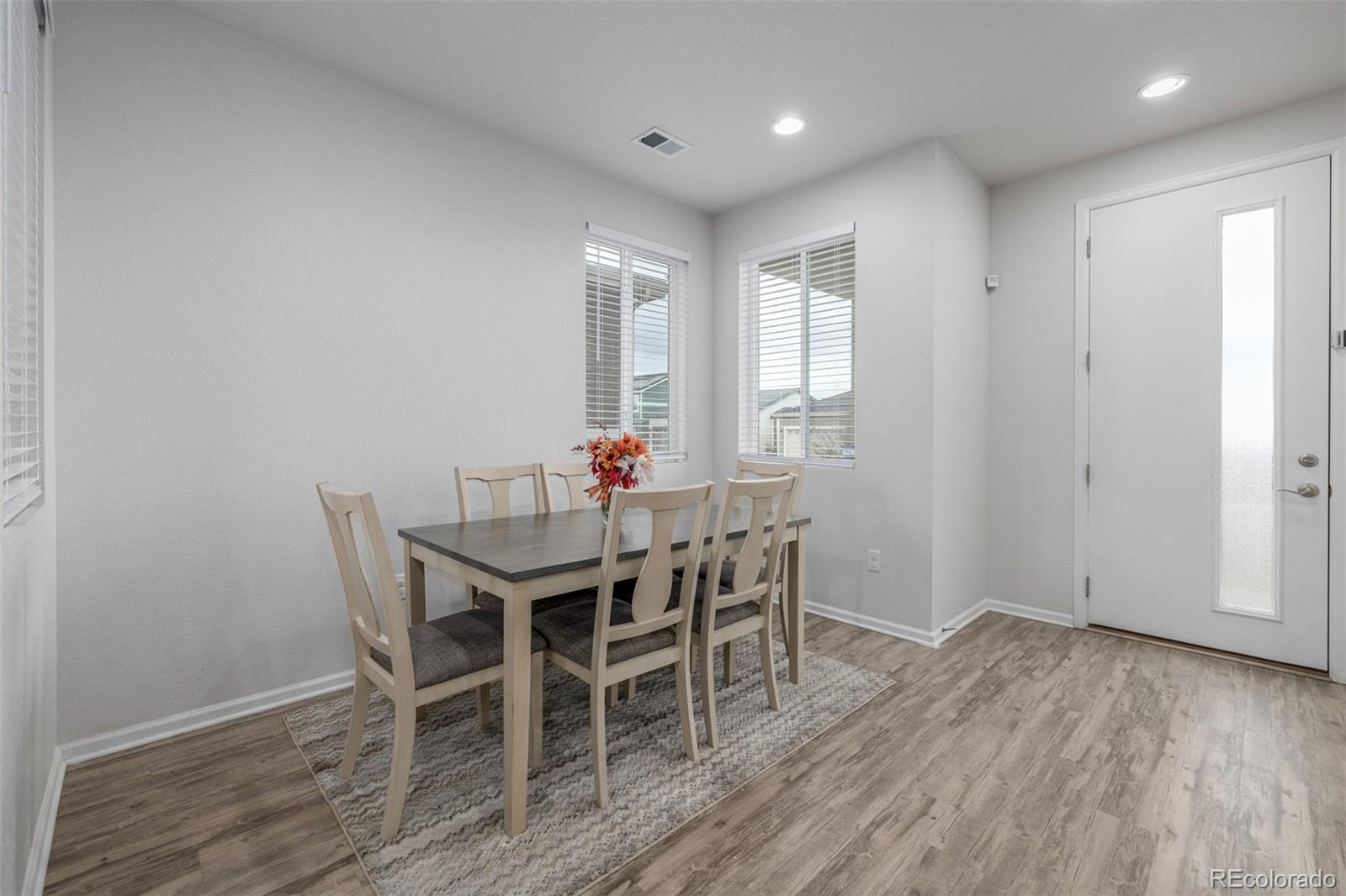 A chic modern face and striking red front door set a welcoming tone for this two story townhome. A covered front patio and a generous setback create a calming vantage point to watch the world flow by. The entry opens into a bright main level with an intuitive open plan, where dining and living areas connect effortlessly. Plank floors, recessed lights, and a neutral palette shape a warm contemporary space. The kitchen stands as a central gathering place with a large center island offering abundant prep space and seating at the breakfast bar. Pendant lights adds a refined touch, while grey counters, white cabinetry, and a cool tone tile backsplash bring visual interest and modern appeal. Stainless appliances, a pantry, and thoughtful storage support the ease of daily living. On the upper level, the private quarters are serene and well proportioned. The primary bedroom offers a calming retreat with spacious walk-in closet and ensuite with dual sinks. Two additional bedrooms provide flexibility for work, rest, or creative use. A conveniently located laundry area completes this level with practical efficiency. Outdoor living is enhanced by the covered side patio, an inviting spot for morning coffee or an evening pause. The attached two car garage is fully drywalled and offers valuable convenience along with the ease of low maintenance living throughout. This property also presents a rare financial advantage with the potential for a 2.625% assumable loan, offering a pathway to an exceptionally affordable monthly payment for the next owner and elevating the long term value of this home. The surrounding neighborhood adds meaningful appeal with several parks within a short walk, nearby shopping and restaurants, and quick access to DIA for effortless travel. From the front steps, sunsets paint the sky in vivid color, a daily moment cherished for its calm and beauty. This residence pairs style, comfort, and connection with a location that places every convenience within reach.