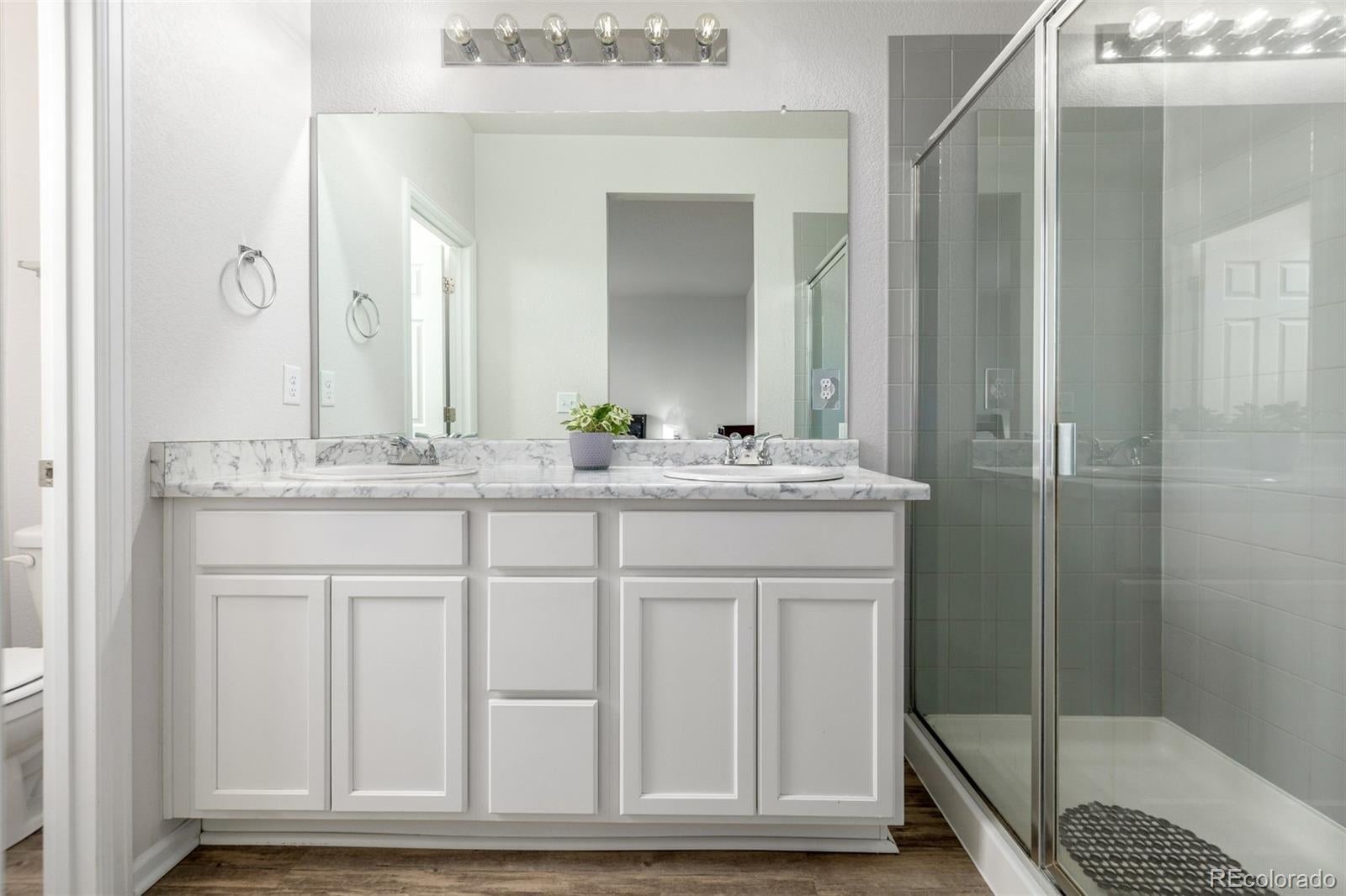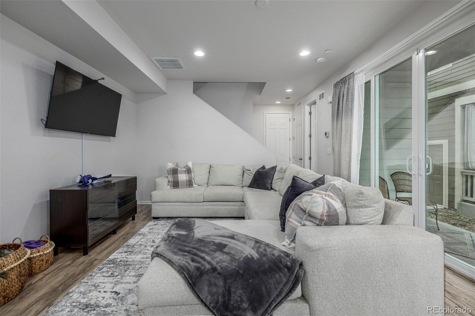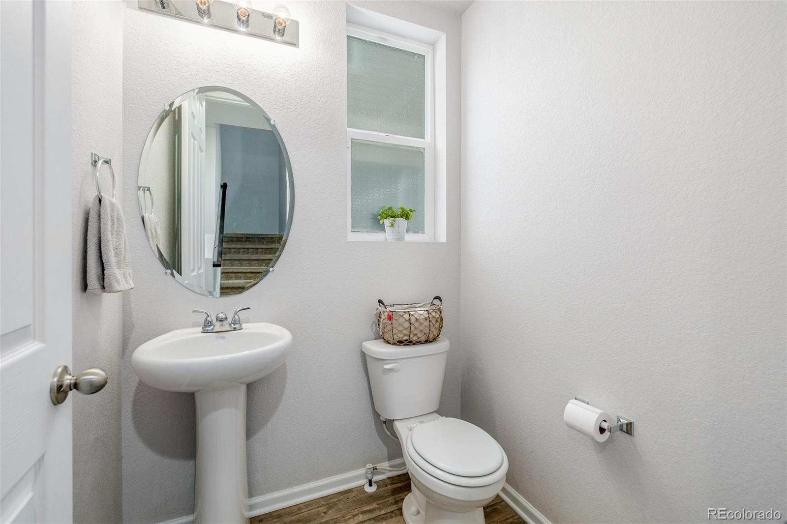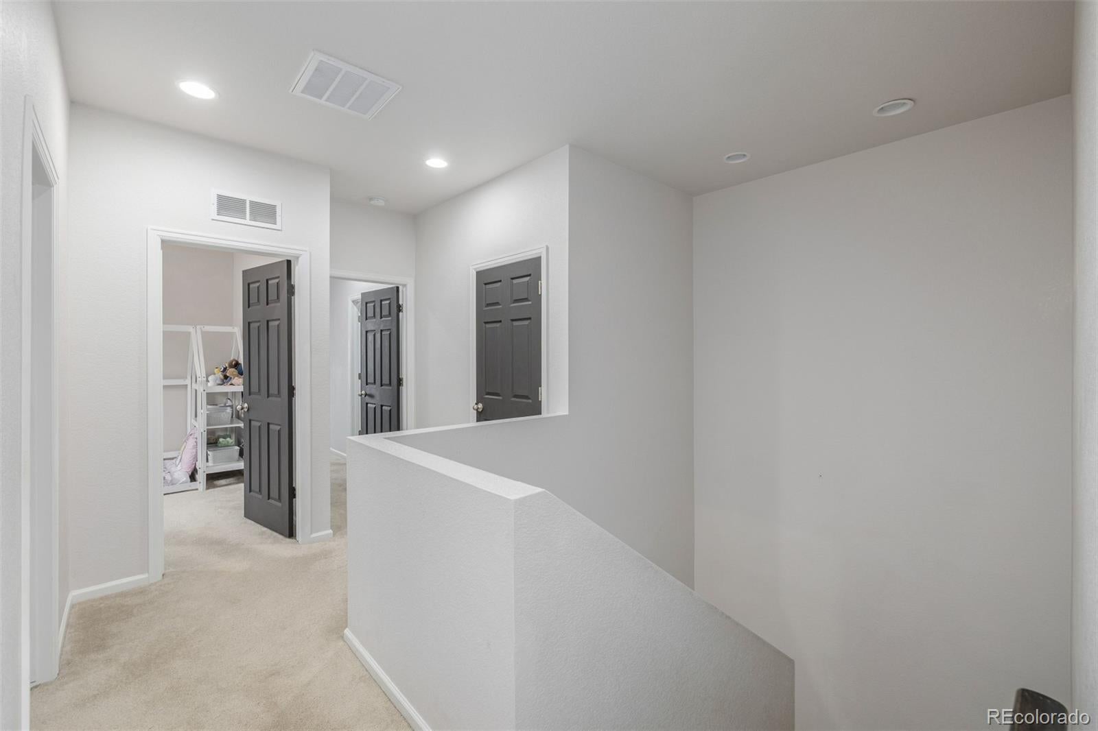 A chic modern face and striking red front door set a welcoming tone for this two story townhome. A covered front patio and a generous setback create a calming vantage point to watch the world flow by. The entry opens into a bright main level with an intuitive open plan, where dining and living areas connect effortlessly. Plank floors, recessed lights, and a neutral palette shape a warm contemporary space. The kitchen stands as a central gathering place with a large center island offering abundant prep space and seating at the breakfast bar. Pendant lights adds a refined touch, while grey counters, white cabinetry, and a cool tone tile backsplash bring visual interest and modern appeal. Stainless appliances, a pantry, and thoughtful storage support the ease of daily living. On the upper level, the private quarters are serene and well proportioned. The primary bedroom offers a calming retreat with spacious walk-in closet and ensuite with dual sinks. Two additional bedrooms provide flexibility for work, rest, or creative use. A conveniently located laundry area completes this level with practical efficiency. Outdoor living is enhanced by the covered side patio, an inviting spot for morning coffee or an evening pause. The attached two car garage is fully drywalled and offers valuable convenience along with the ease of low maintenance living throughout. This property also presents a rare financial advantage with the potential for a 2.625% assumable loan, offering a pathway to an exceptionally affordable monthly payment for the next owner and elevating the long term value of this home. The surrounding neighborhood adds meaningful appeal with several parks within a short walk, nearby shopping and restaurants, and quick access to DIA for effortless travel. From the front steps, sunsets paint the sky in vivid color, a daily moment cherished for its calm and beauty. This residence pairs style, comfort, and connection with a location that places every convenience within reach.