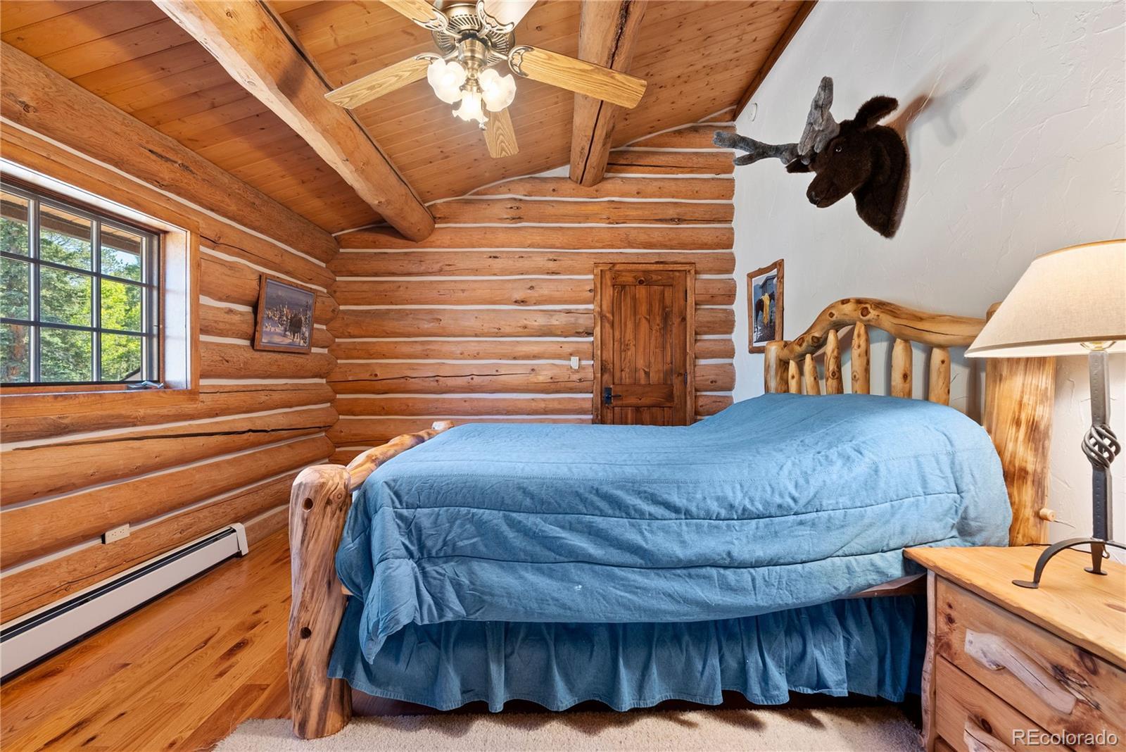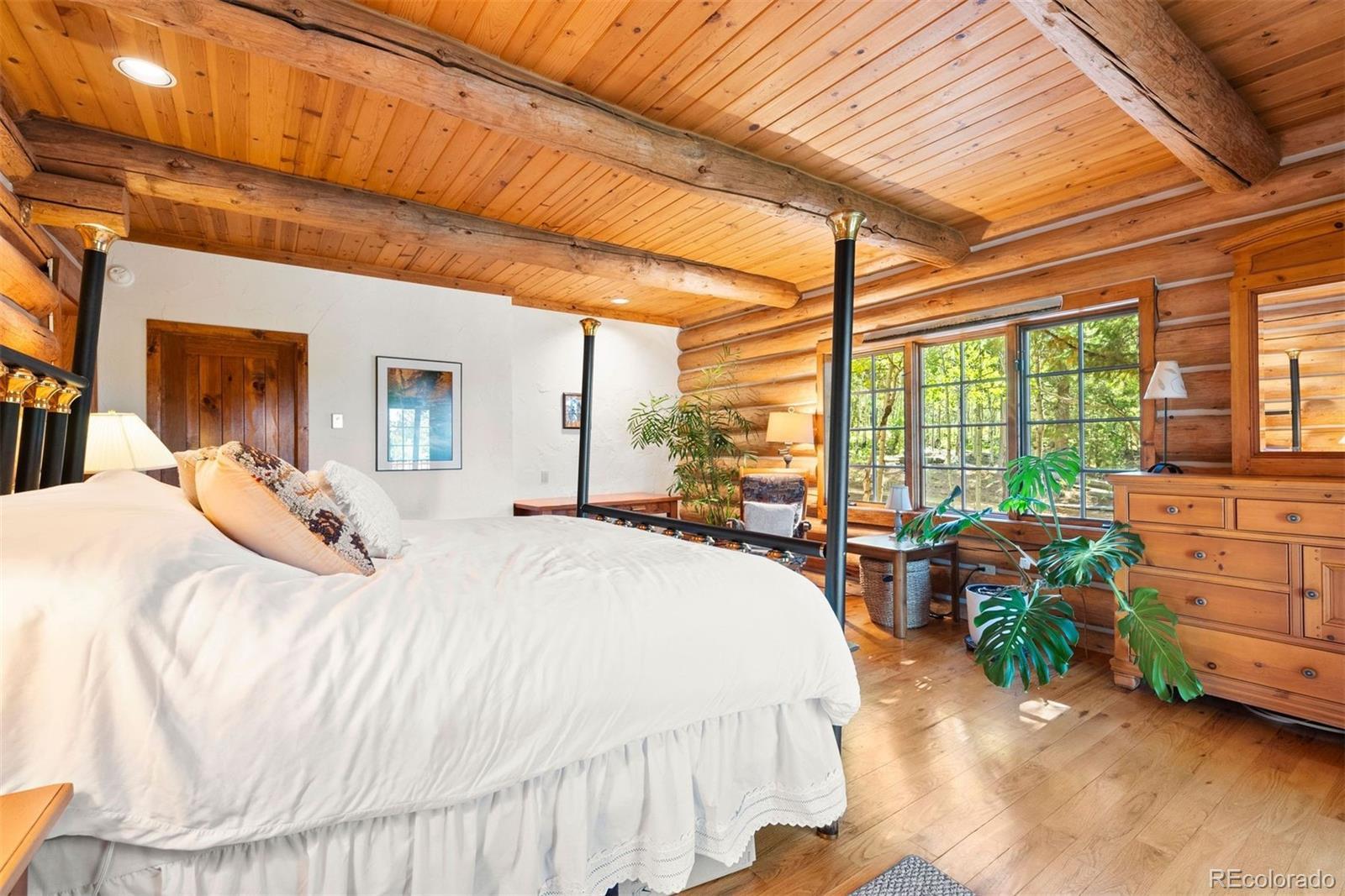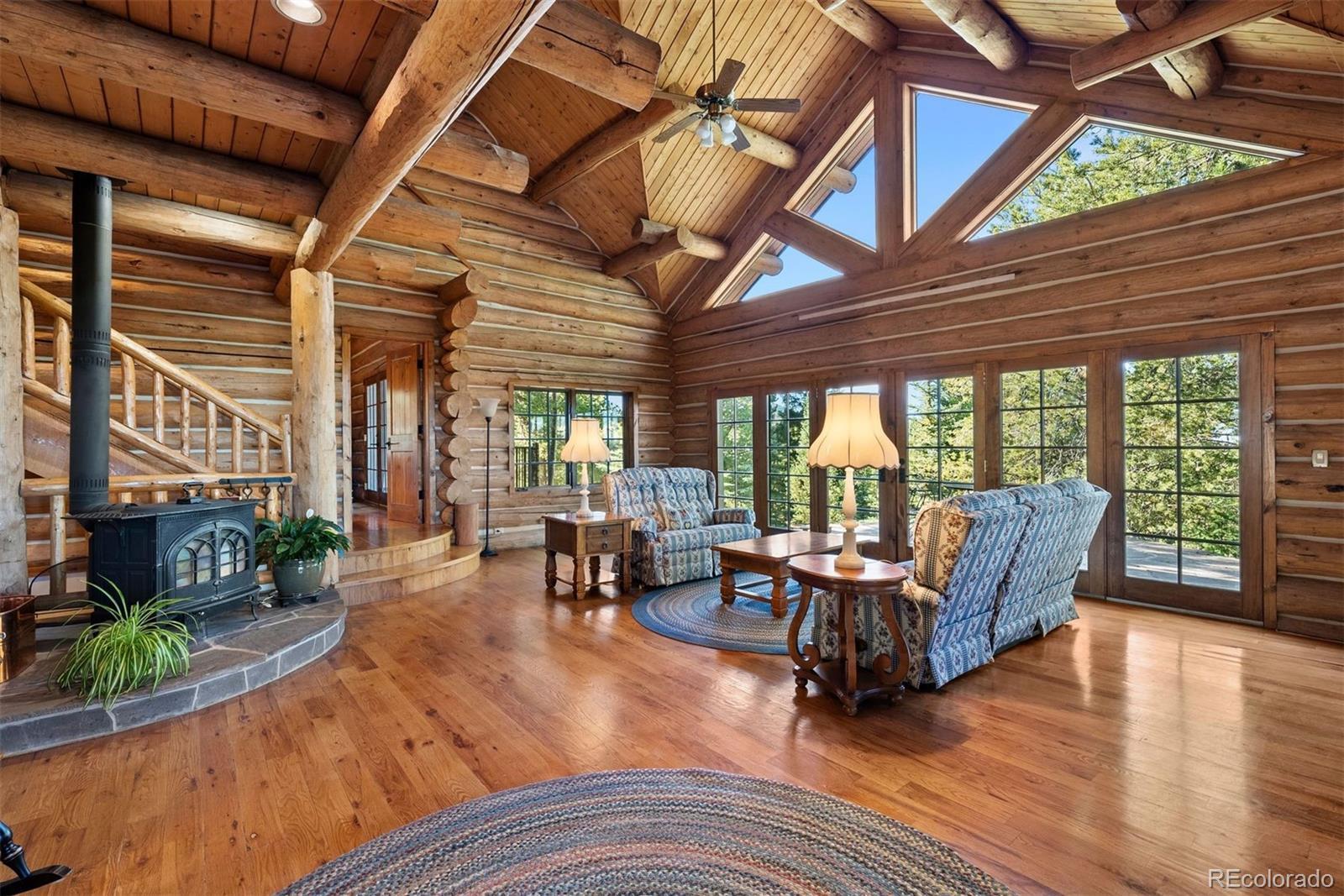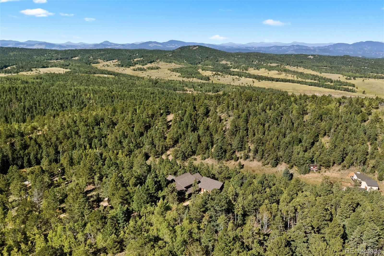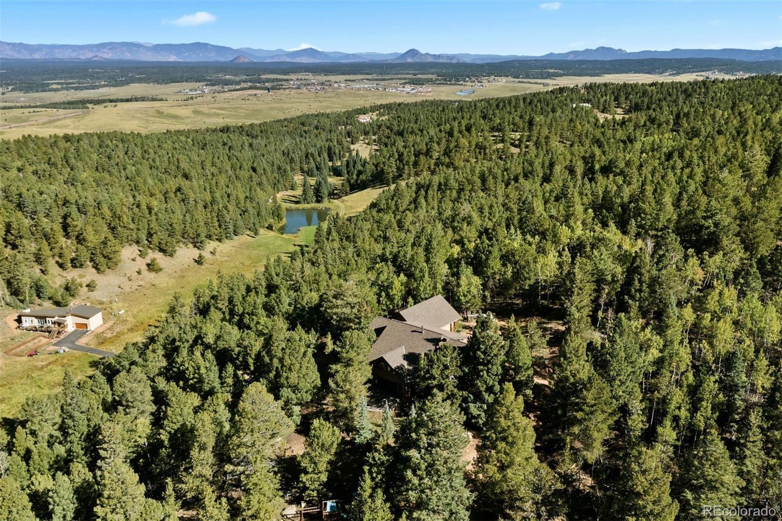 Perched near picturesque Raspberry Mountain, this stunning log cabin offers the ultimate mountain retreat amidst inspiring rock formations, whispering pines, and wildlife. Enjoy direct access to hiking trails and unparalleled opportunities to connect with nature. With sweeping mountain and forest views in every direction, the property seamlessly blends rustic craftsmanship with modern comfort. A spacious porch invites you to bask in the morning light or savor the magic hues of evening sunsets. Expansive floor-to-ceiling windows frame the surrounding forest, wildlife, and dramatic Rocky Mountain landscapes, while a private main-level balcony off the primary suite provides even more beautiful views. The walkout stone patio extends your living space to the outdoors — perfect for stargazing or hosting gatherings beneath the Colorado sky. Inside, the log-cabin style and architecture plus natural stonework create a cozy yet grand atmosphere. Vaulted ceilings and gleaming, heated hardwood floors are the perfect complement to the log construction, and a woodfire stove anchors the great room…offering comfort on crisp nights and a front-row seat to winter’s most picturesque snowfalls. The adjoining kitchen blends rustic charm with functionality, featuring a built-in gas grille, generous pantry, and abundant food storage. Its seamless design allows easy flow to both the main living areas and outdoor patio for entertaining and relaxation. There are five bedrooms thoughtfully divided between the loft upper level and the cozy and carpeted basement with open flex-space for additional living or recreation. The oversized garage and ample utility space provide loads of storage opportunities and plenty of room for “mountain toys” like 4-wheelers, etc.! Even though you feel like you are completely tucked away, this location is super convenient…less than 10 minutes to Mueller State Park and the town of Divide, and less than 15 minutes to the Colorado Wolf and Wildlife Center.