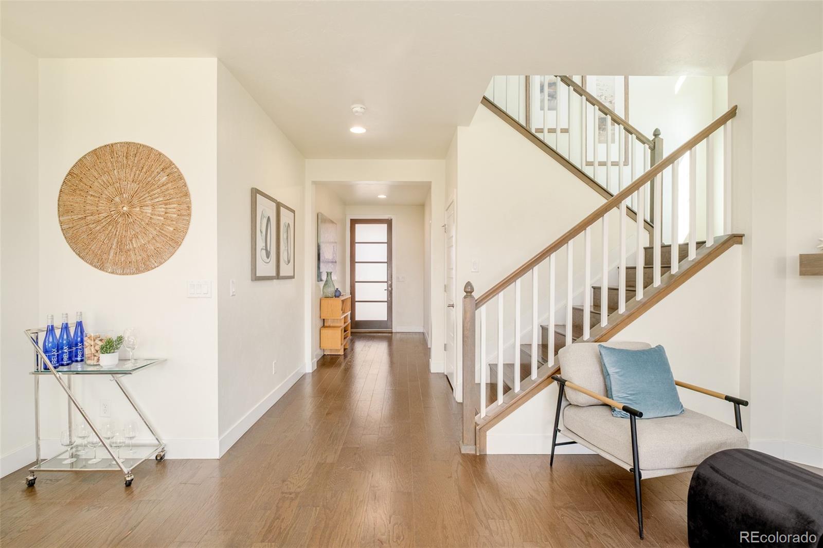 Contemporary Fireside Stunner! This beautifully upgraded home offers modern style, functionality, and comfort. Built in 2016, this home is loaded with upgrades and modern charm. The newly finished basement offers a spacious rec room, climbing wall, large bedroom, full bath, and extra storage perfect for entertaining or guests. Throughout the main and upper levels, you’ll find rich hardwood flooring, troweled walls, 8-foot doors, and specialty-made blinds. The designer kitchen features shaker cabinets with a French glaze finish, expansive honed granite island, classic subway tile backsplash, and Whirlpool appliances. The open floorplan flows effortlessly from the bright living room with cozy fireplace to the dining area ideal for gatherings. A flex room off the kitchen is perfect for a home office or playroom. The main level also includes a private bedroom and bath plus a mudroom conveniently located off the 3-car garage. Upstairs, a grand staircase leads to a loft, laundry room, two bedrooms sharing a full bath, and a spacious primary suite with dual walk-in closets and a luxurious 5-piece bath featuring soaking tub and dual vanities. Enjoy the outdoors in the professionally landscaped backyard with pergola, patio and a variety of fruit and herbs including grapes, raspberries, rhubarb, cherries and strawberries - an inviting retreat for relaxing or entertaining. Located near I-70, Lutheran Hospital, Lifetime Fitness, King Soopers, and a variety of restaurants, blending comfort, style, and convenience. Light, bright, and beautifully finished this one is sure to impress!
