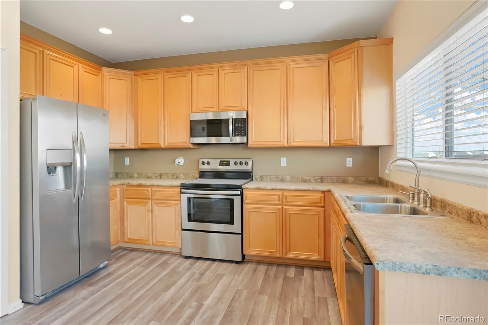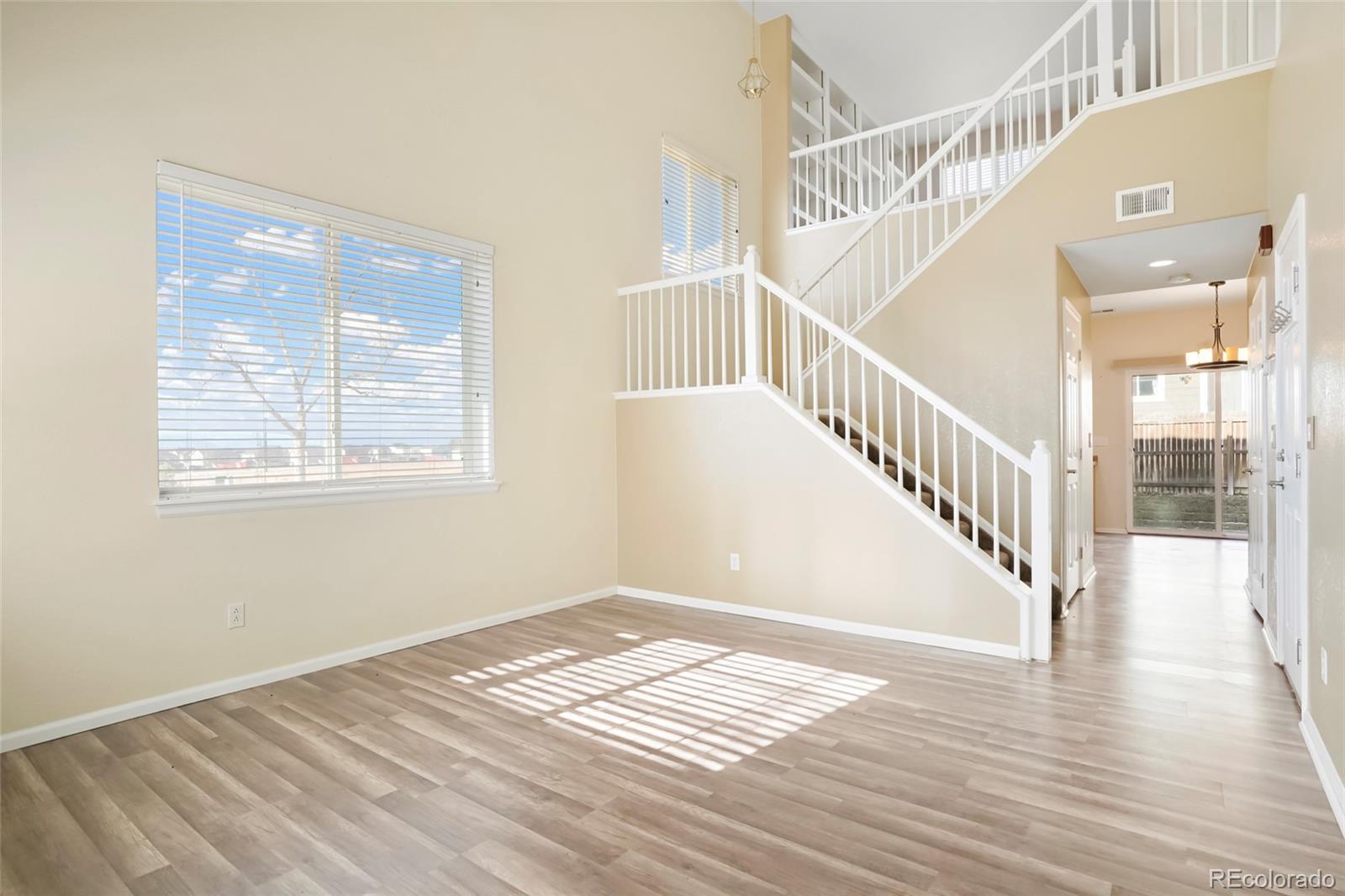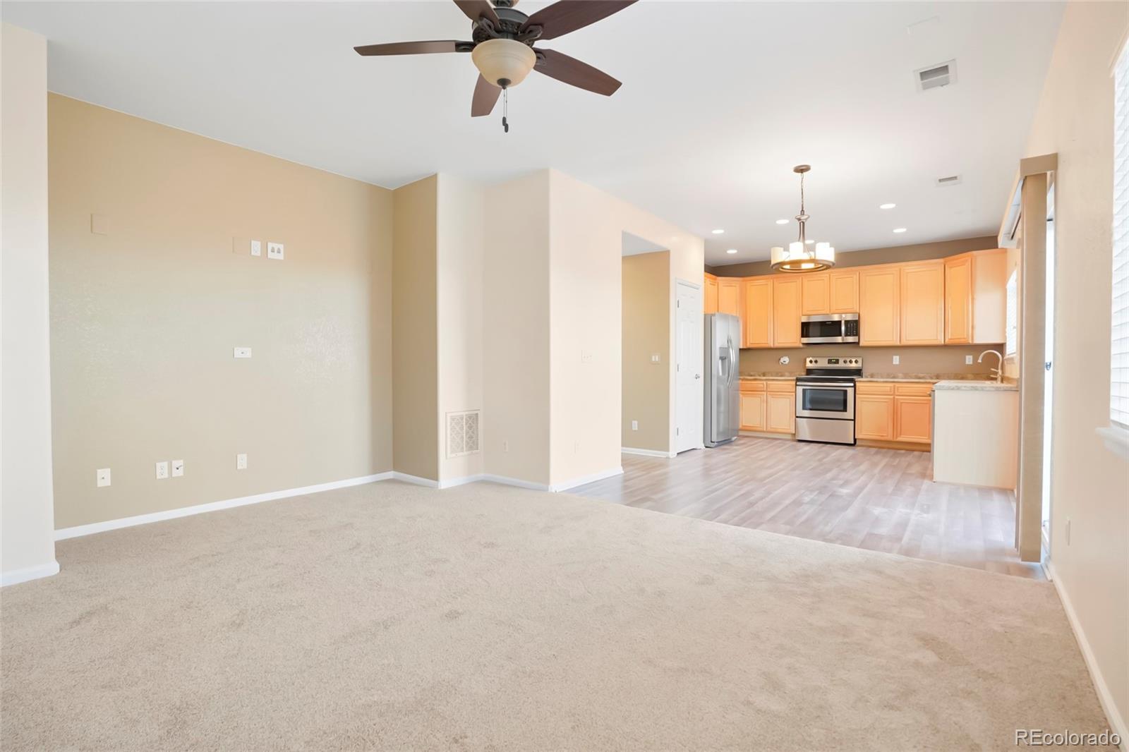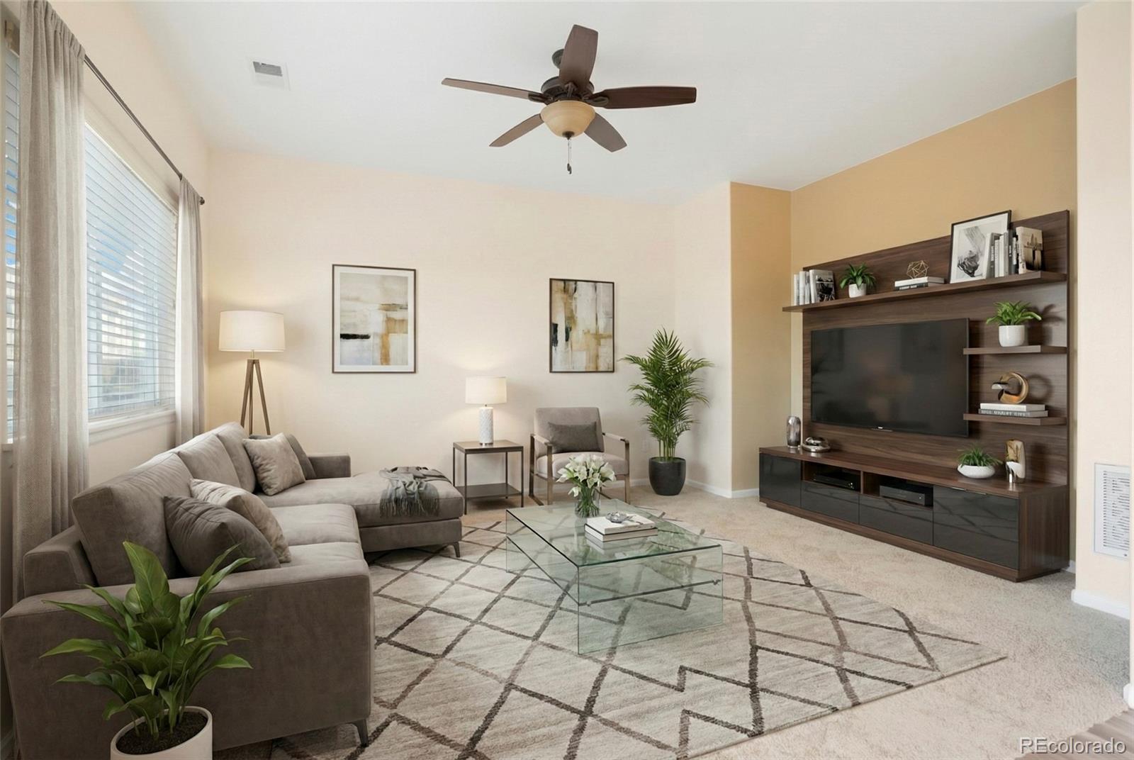 Nicely maintained home on a desirable corner lot in Foxton Village, offering beautiful mountain and city views. The inviting living room features a two-story ceiling and luxury vinyl flooring, flowing into an open kitchen with 42" cabinets topped with crown molding, a new stainless steel refrigerator, and an eating space with access to the backyard patio—perfect for outdoor dining. The spacious family room includes an inset entertainment niche and brand-new carpet. Upstairs, a large open loft with built-ins provides an ideal office, play area, or potential 3rd bedroom conversion. The primary suite offers an ensuite bath and walk-in closet, while a secondary bedroom, full bath, and convenient laundry with washer and dryer included complete the upper level. Additional highlights include a new water heater, tile roof, and freshly painted exterior. Fantastic location close to shopping, dining, Barr Lake State Park, Rocky Mountain Arsenal Wildlife Refuge, and Second Creek Open Space. ________________________________________
