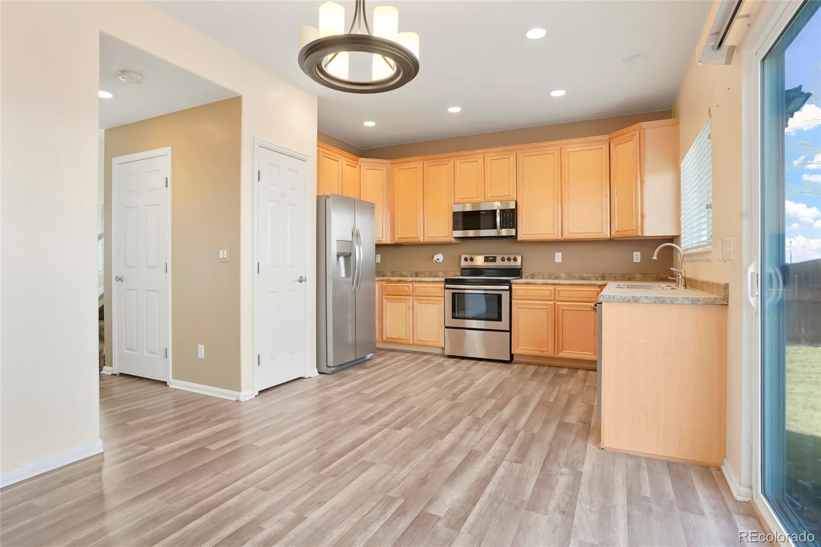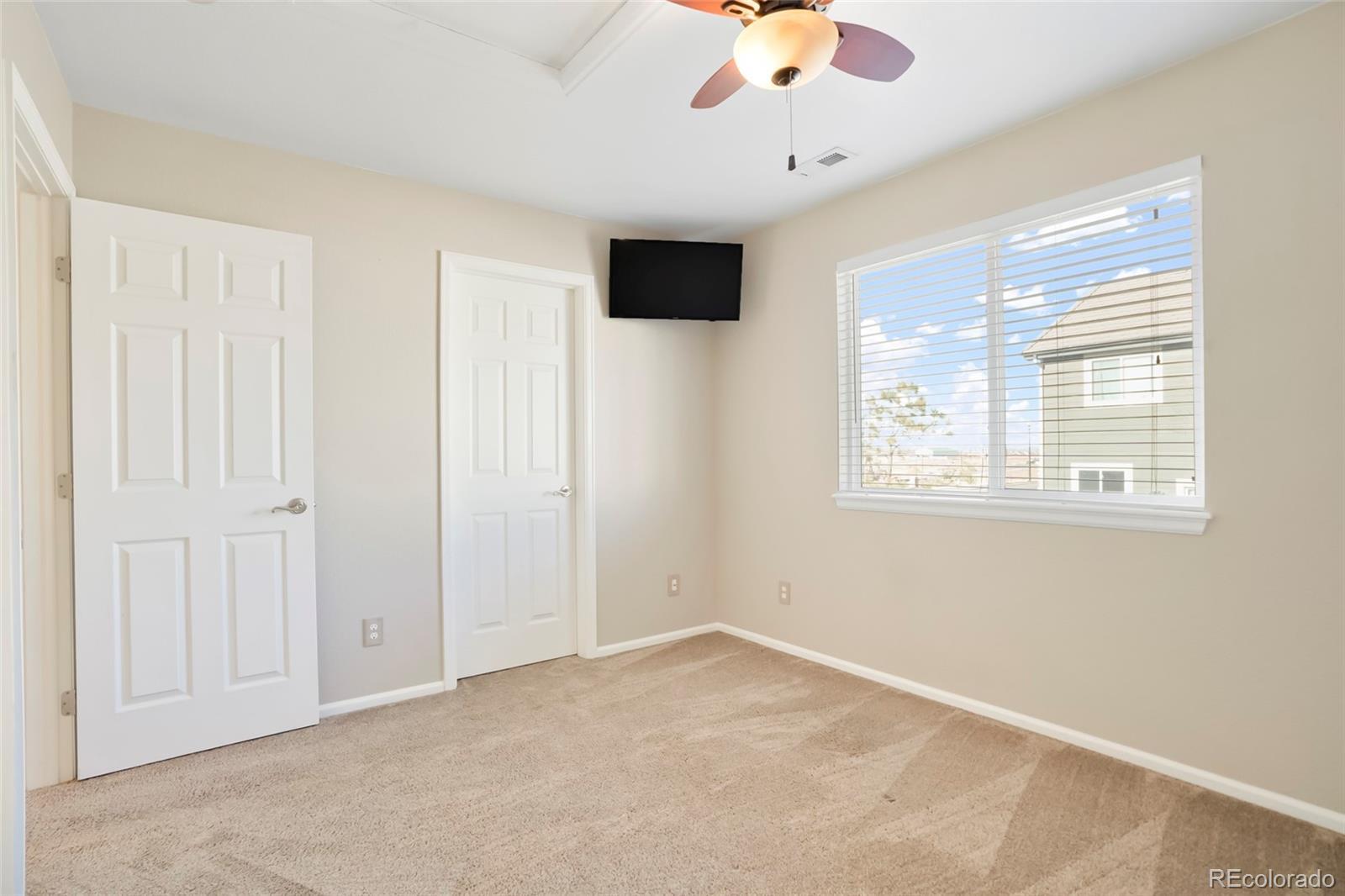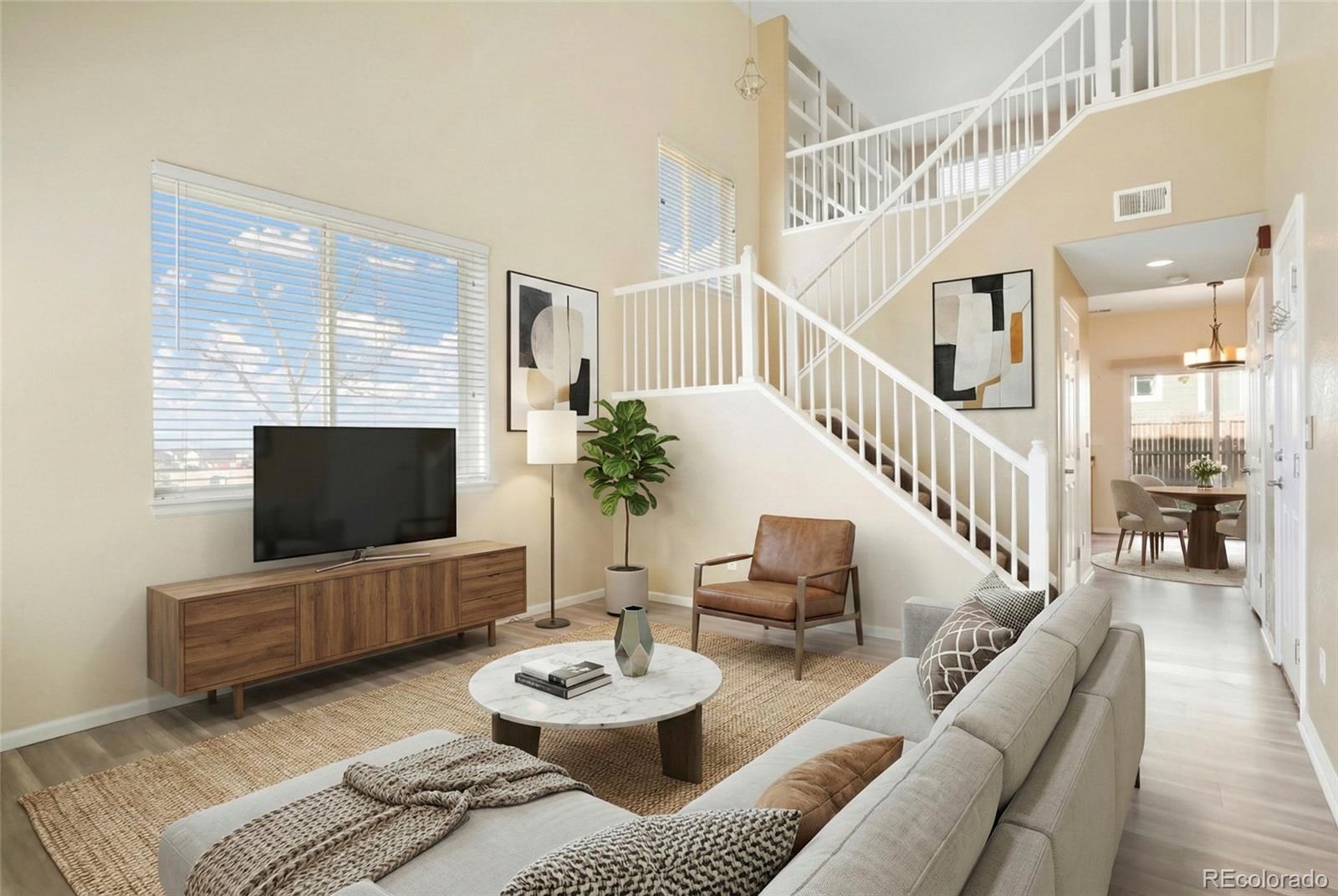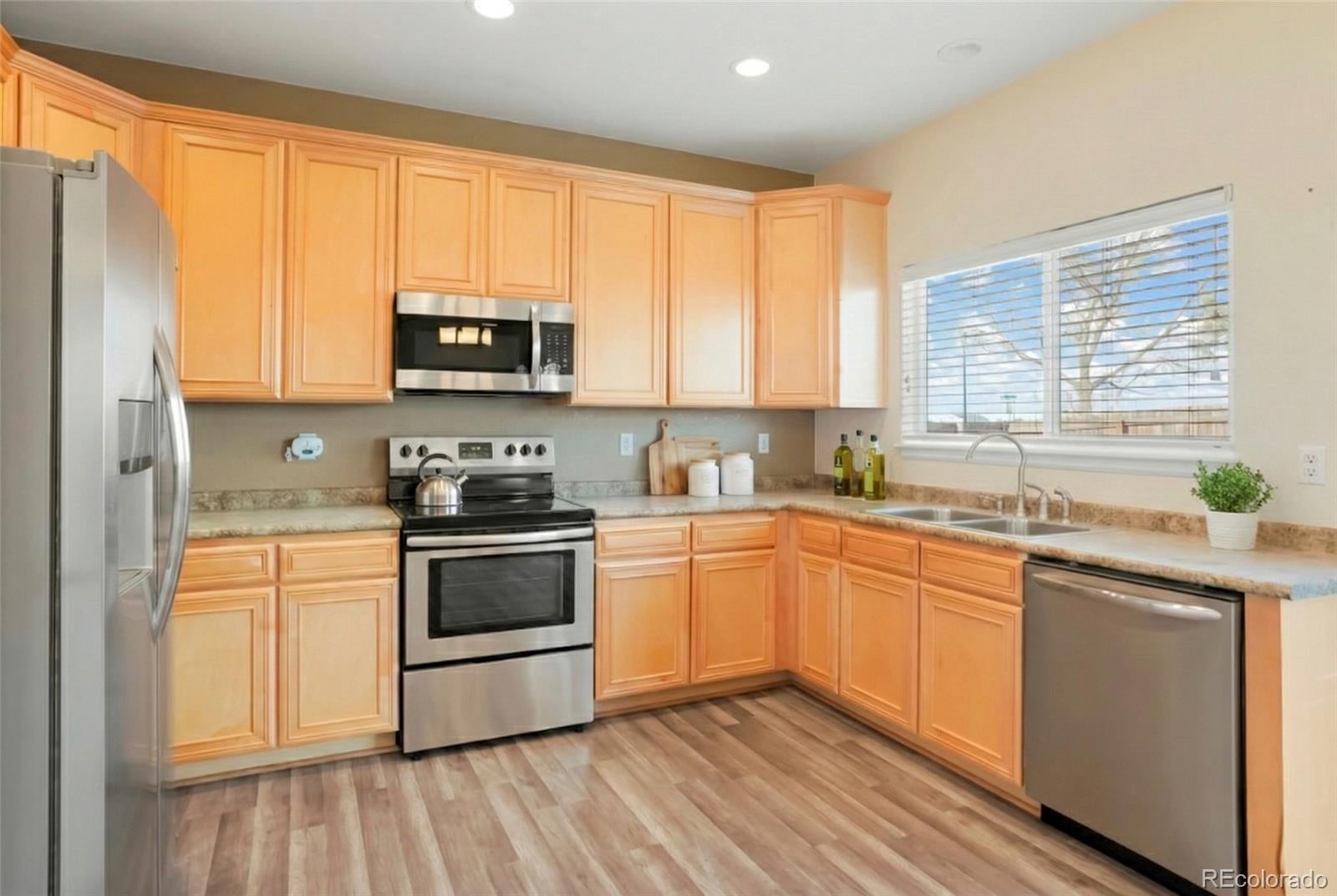 Nicely maintained home on a desirable corner lot in Foxton Village, offering beautiful mountain and city views. The inviting living room features a two-story ceiling and luxury vinyl flooring, flowing into an open kitchen with 42" cabinets topped with crown molding, a new stainless steel refrigerator, and an eating space with access to the backyard patio—perfect for outdoor dining. The spacious family room includes an inset entertainment niche and brand-new carpet. Upstairs, a large open loft with built-ins provides an ideal office, play area, or potential 3rd bedroom conversion. The primary suite offers an ensuite bath and walk-in closet, while a secondary bedroom, full bath, and convenient laundry with washer and dryer included complete the upper level. Additional highlights include a new water heater, tile roof, and freshly painted exterior. Fantastic location close to shopping, dining, Barr Lake State Park, Rocky Mountain Arsenal Wildlife Refuge, and Second Creek Open Space. ________________________________________