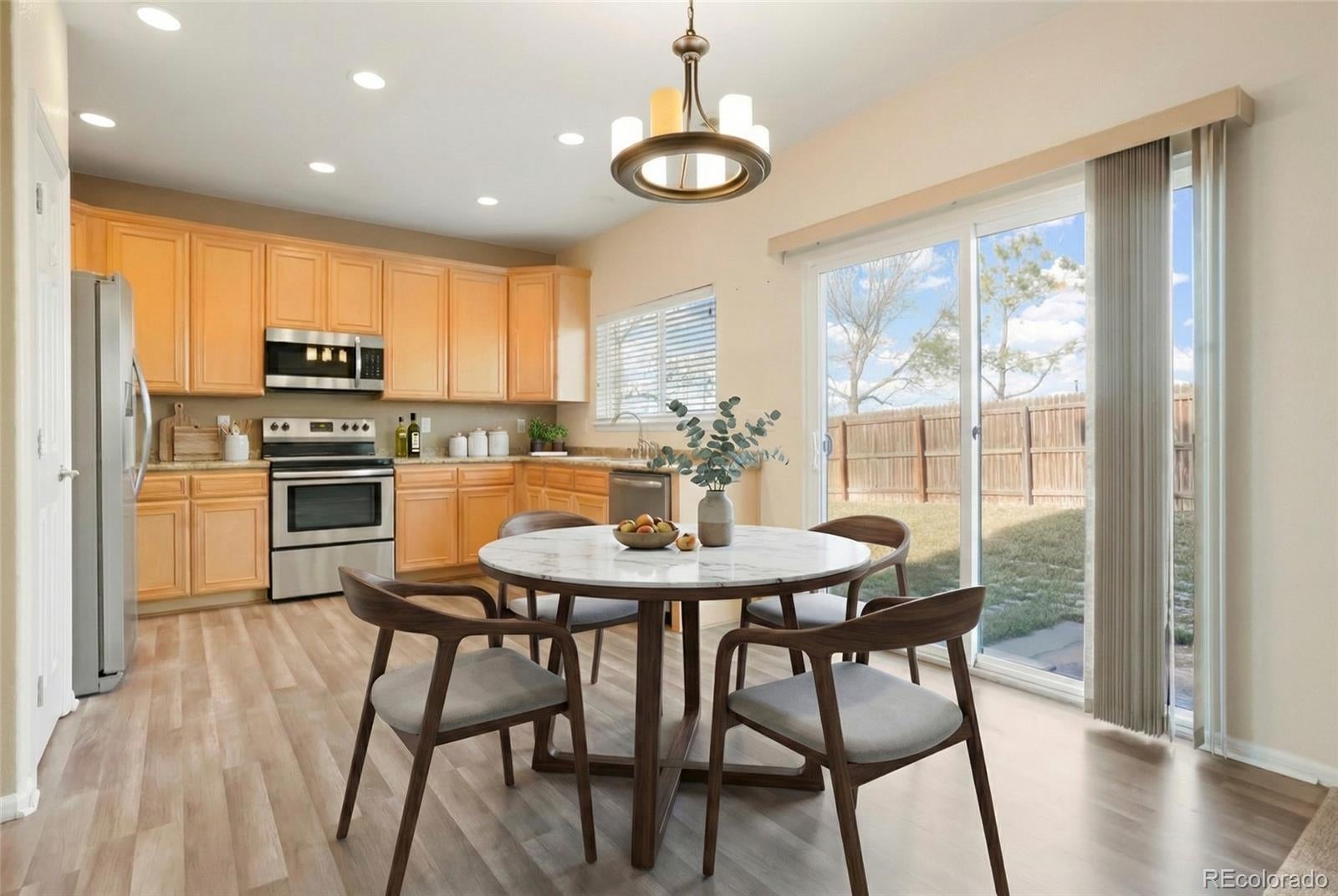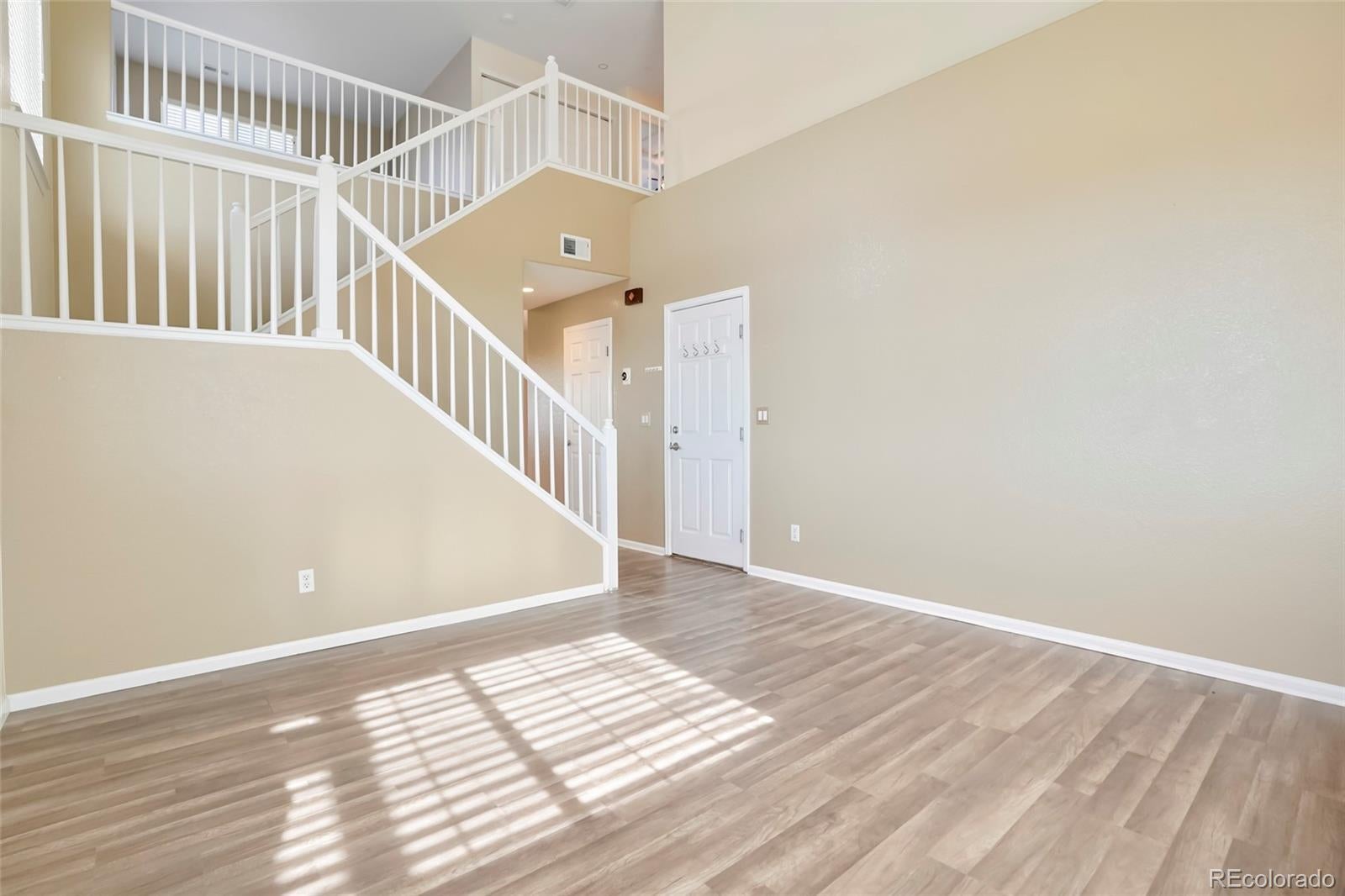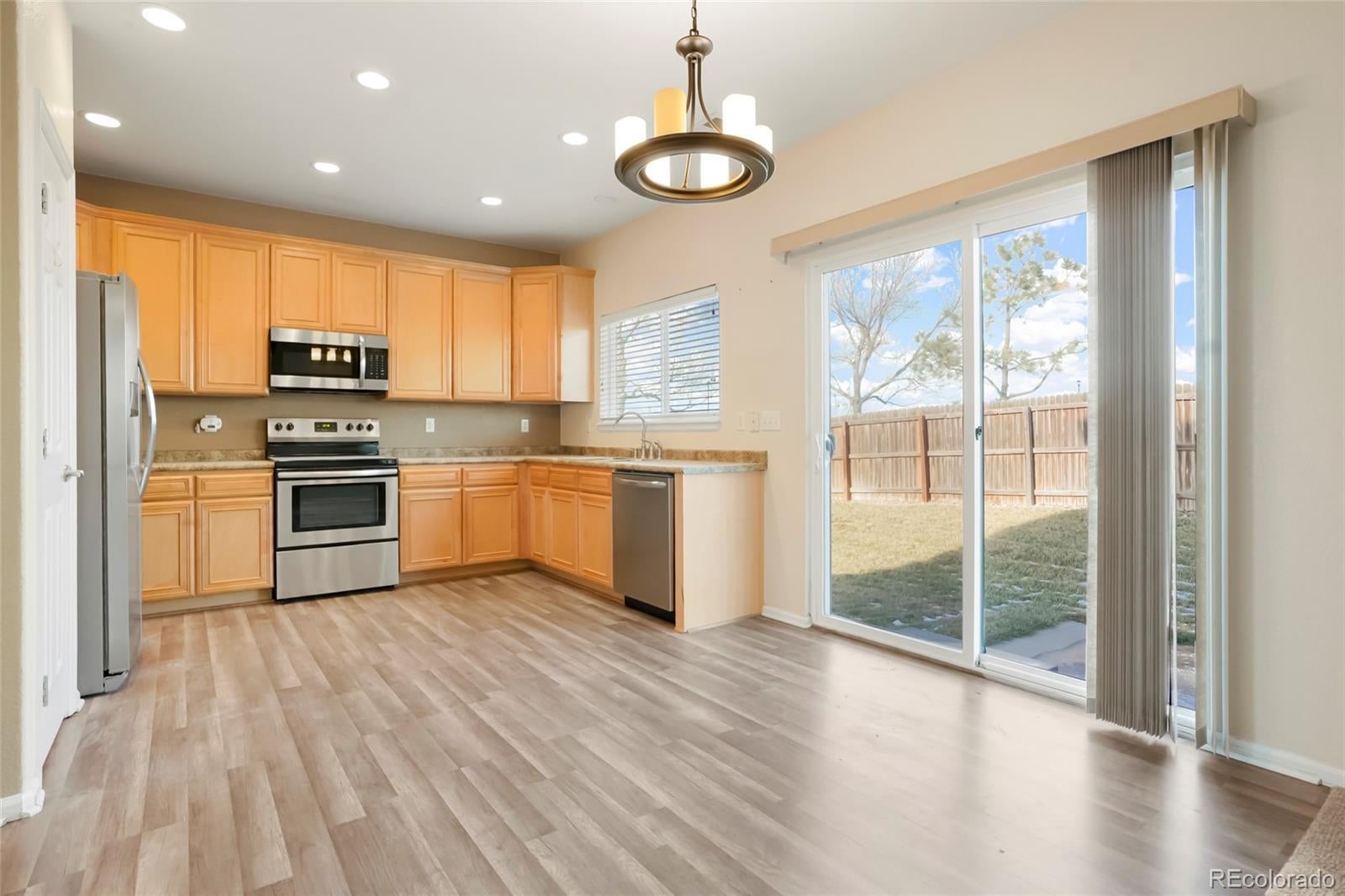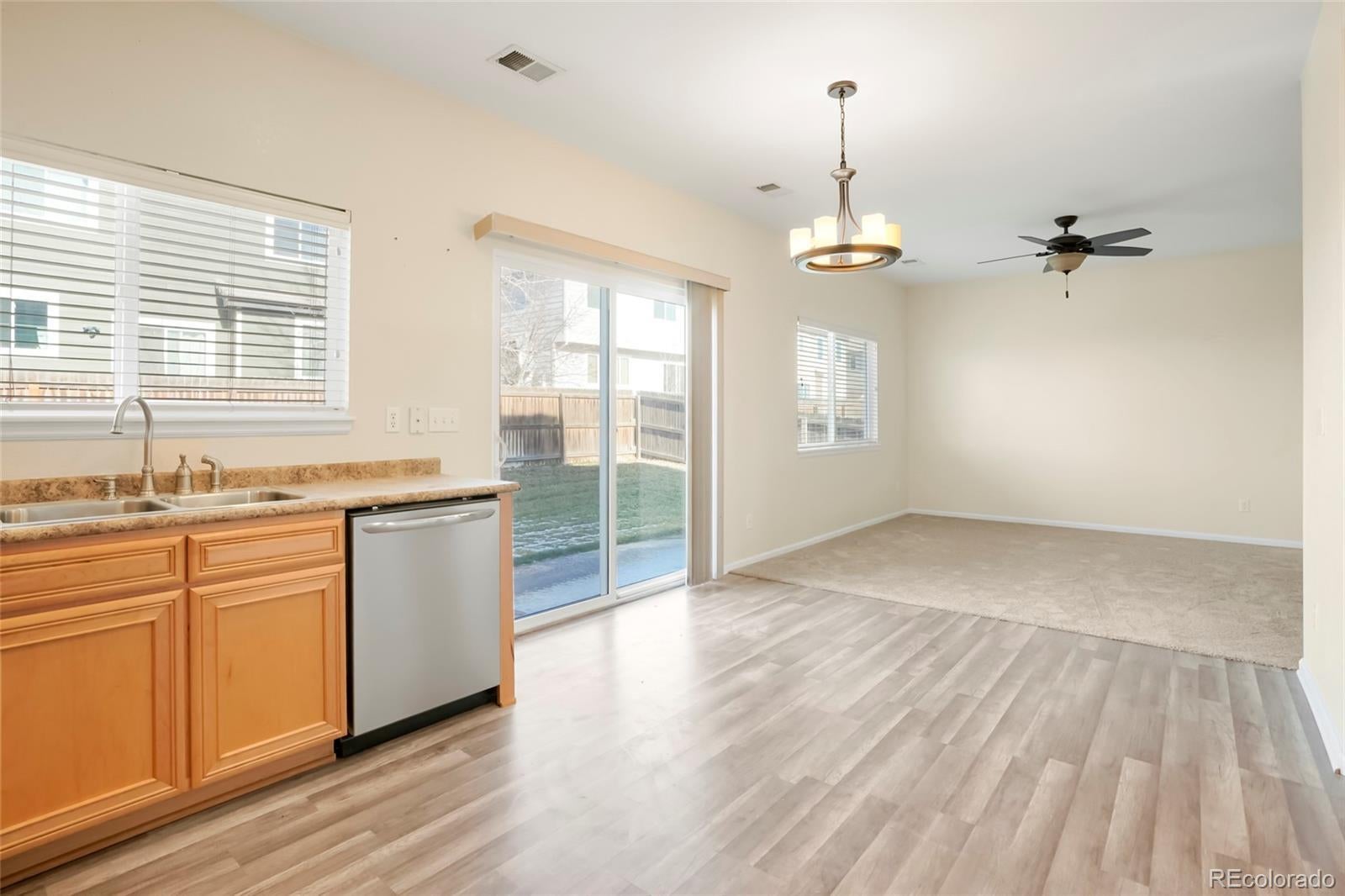 Nicely maintained home on a desirable corner lot in Foxton Village, offering beautiful mountain and city views. The inviting living room features a two-story ceiling and luxury vinyl flooring, flowing into an open kitchen with 42" cabinets topped with crown molding, a new stainless steel refrigerator, and an eating space with access to the backyard patio—perfect for outdoor dining. The spacious family room includes an inset entertainment niche and brand-new carpet. Upstairs, a large open loft with built-ins provides an ideal office, play area, or potential 3rd bedroom conversion. The primary suite offers an ensuite bath and walk-in closet, while a secondary bedroom, full bath, and convenient laundry with washer and dryer included complete the upper level. Additional highlights include a new water heater, tile roof, and freshly painted exterior. Fantastic location close to shopping, dining, Barr Lake State Park, Rocky Mountain Arsenal Wildlife Refuge, and Second Creek Open Space. ________________________________________