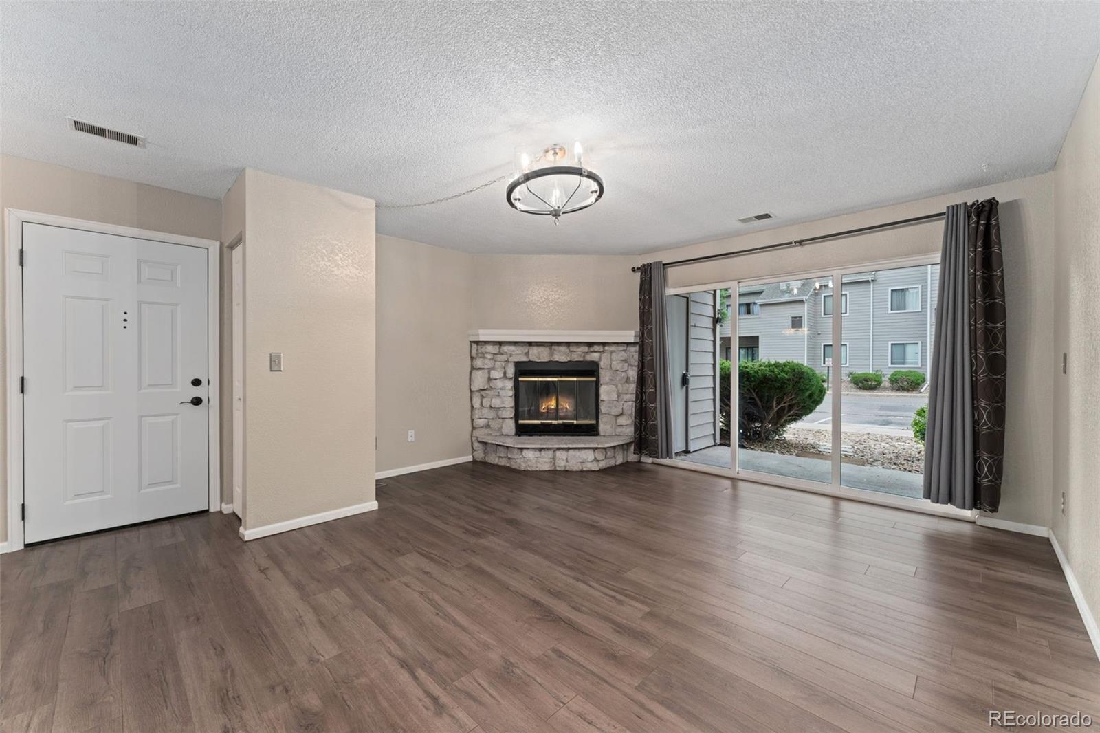Welcome to this beautifully updated ground-level condo in a great community! This 2-bed, 2-bath home features fresh new carpet throughout the bedrooms and new kitchen flooring adding comfort and a clean, move-in-ready feel. The kitchen shines with granite countertops and stainless steel appliances, while the spacious living room offers a cozy gas fireplace and access to a private patio—perfect for relaxing or entertaining. The primary suite includes a generous walk-in closet and a dual-sink vanity in the en-suite bath. The unit also features a second bedroom and second full bathroom. Sitting at a convenient location near Hwy 285, shopping, and parks, this condo truly has it all.