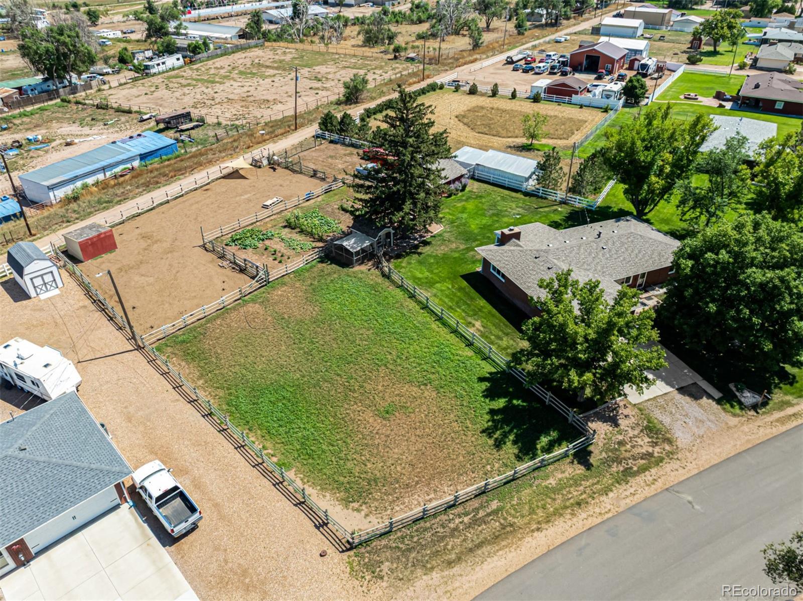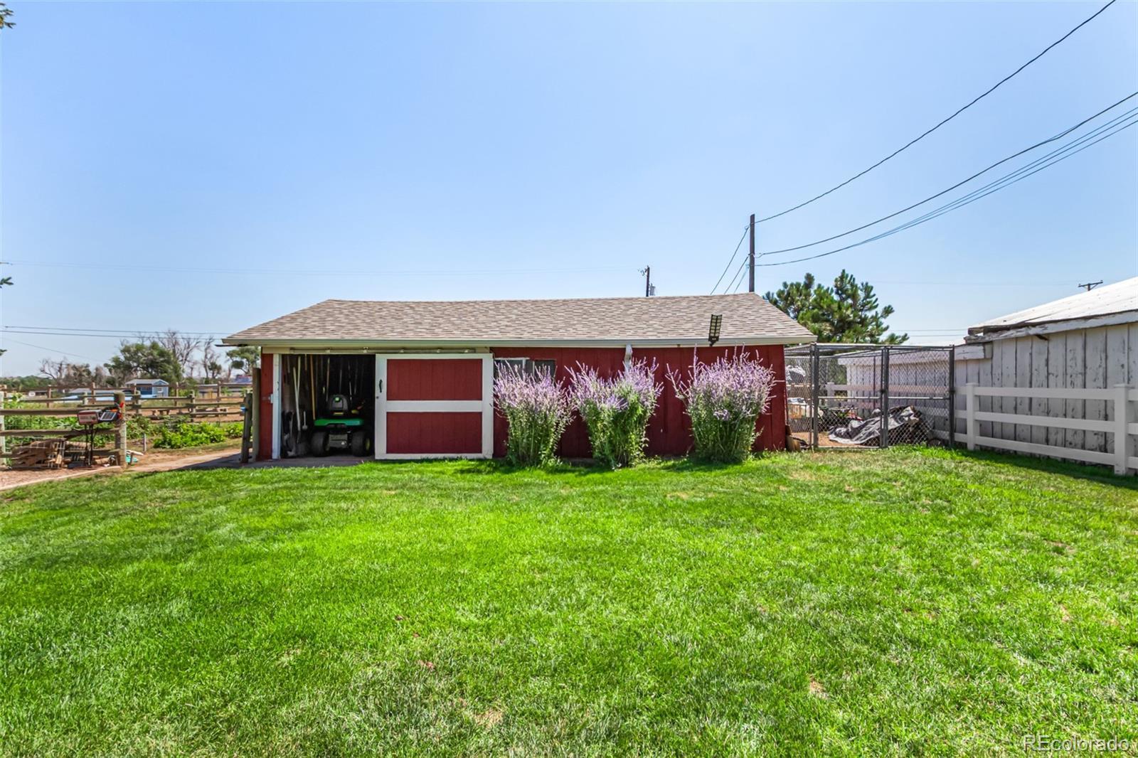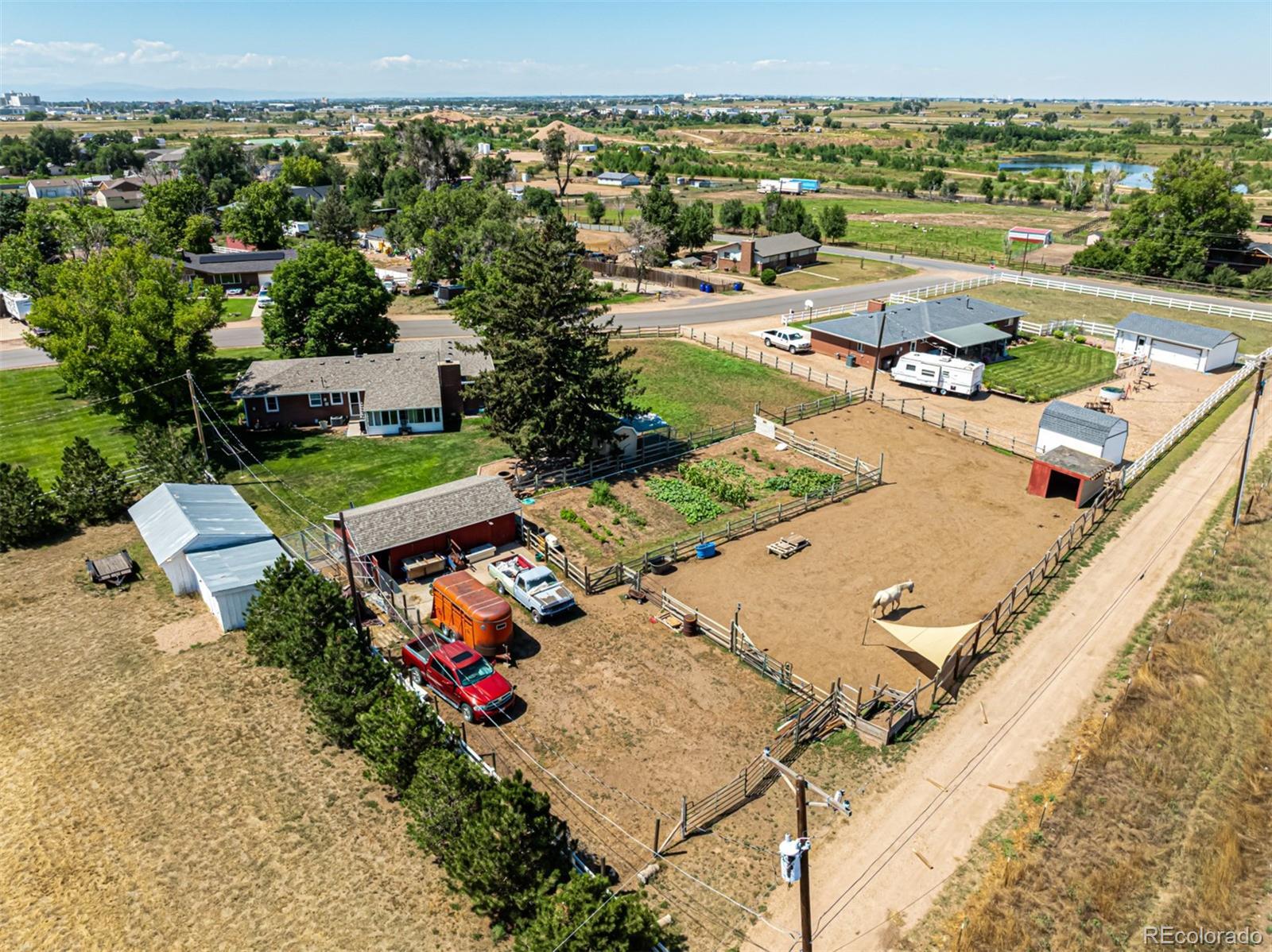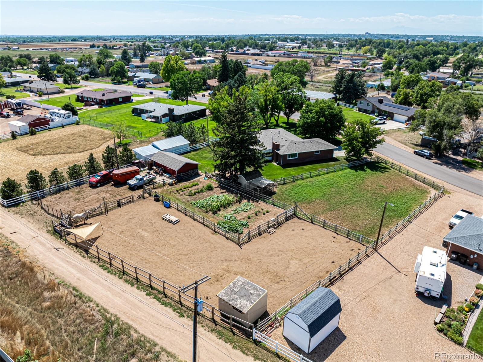 Become the proud owner of this sprawling 1-acre horse property, really a rare find at $600k. Get your picture-perfect curb appeal, lush natural grass, mature shade trees, and a classic white split-rail fence, plus a 2-car garage. Inside, a formal living room offers a soothing palette and soft carpeting, while the well-appointed family room features a cozy fireplace. The gourmet kitchen shines with quartz countertops, newer cabinetry, a tile backsplash, stainless steel appliances, and a peninsula for extra prep space. The main bedroom includes double built-in closets for easy storage, and the second main-level bedroom is good sized with great natural light. The shared main-level bathroom was recently remodeled with a large double vanity and a beautiful tile shower. Just down the hall is the main level laundry room and additional storage, plus the half bath. A bright sunroom with brand-new windows provides an ideal year-round spot for morning coffee or afternoon reading. The finished basement expands your living options with a large rec room, dedicated storage, and a third spacious, remodeled bedroom which is great for guests, an office, or hobbies. Outside, the property delivers true Colorado utility: horse barn space and tack room, a garden shed, corrals, nice perimeter fencing plus electric fencing, a well-loved producing vegetable garden, and extra back-alley access parking with trailer access/storage (including RV gate). Best of all, this home uniquely offers both city water and a private well—all outdoor water use runs off your own well for meaningful water-cost savings. Room to roam, thoughtful updates, and hard-to-find amenities—see it today!