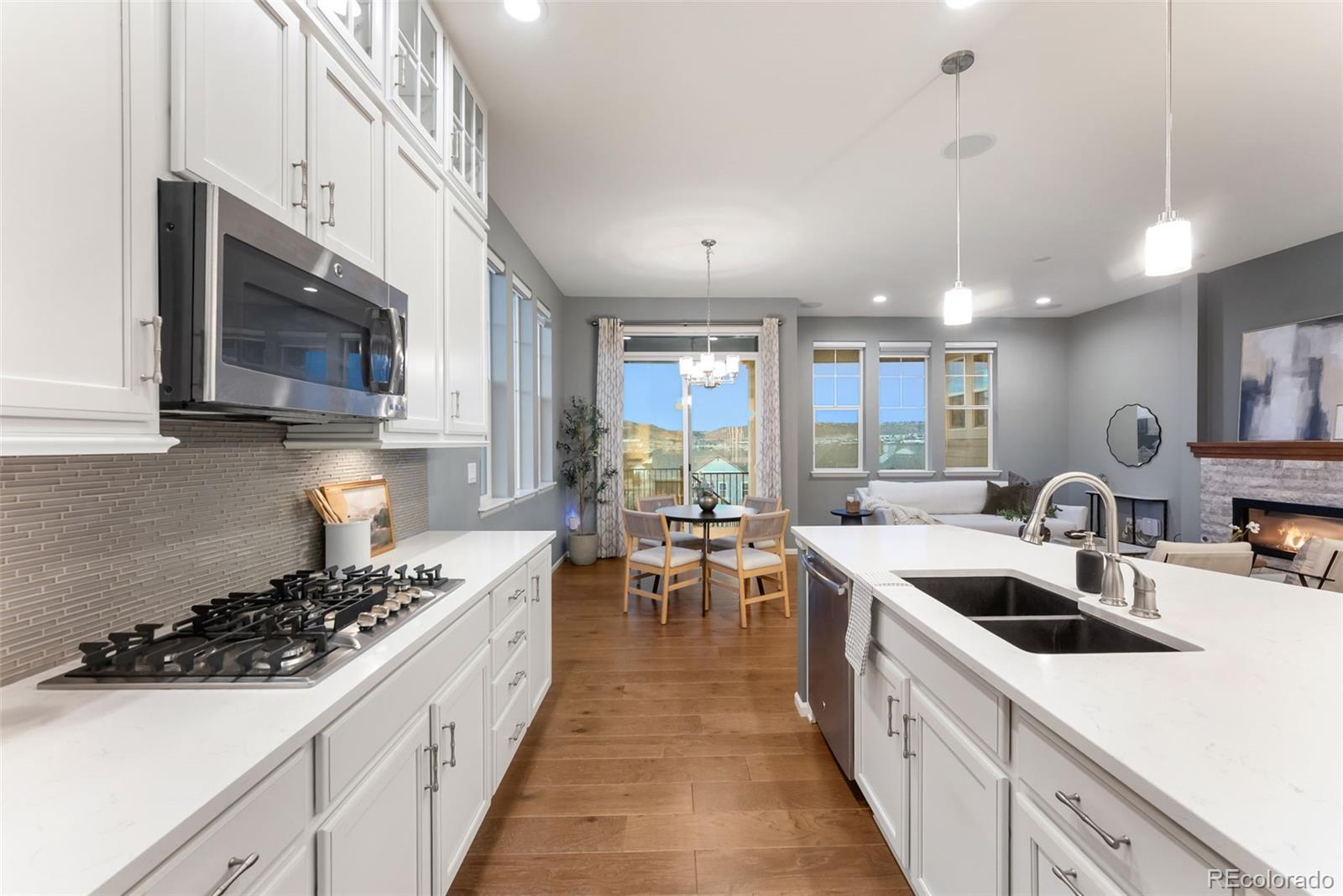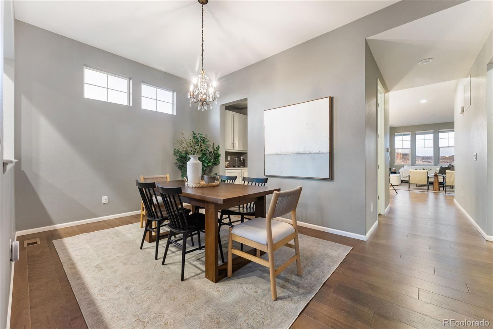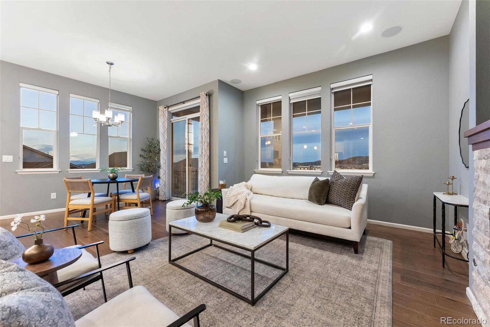Welcome to this beautifully upgraded ranch-style home in Castle Rock’s sought-after Meadows community! Offering the ease of main-floor living and the bonus of a finished walkout basement, this 3-bed, 3.5-bath home shines with hardwood floors, a formal dining room, and a spacious open layout. The stylish kitchen features quartz countertops, stainless steel appliances, extended cabinetry, and a large island for gatherings. The cozy living room with gas fireplace and large windows captures gorgeous mountain views. The finished basement expands your lifestyle options, with a full guest suite, spacious rec room, kitchenette, and brand-new carpet throughout. Outdoors, enjoy a backyard perfect for entertaining, and relax knowing the HOA takes care of front yard mowing and snow removal. Located moments from The Meadows’ shopping, dining, trails, neighborhood pools, Castle Rock Adventist Hospital, and schools—including walking distance to Aspen View Academy. This is easy living at its finest!
