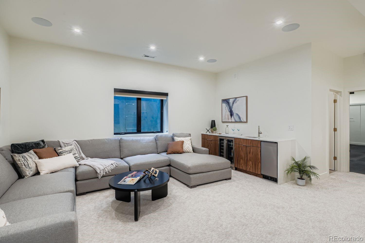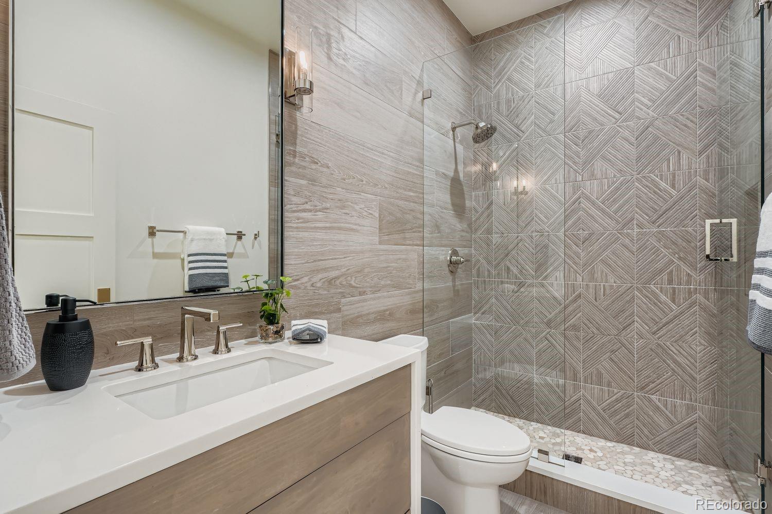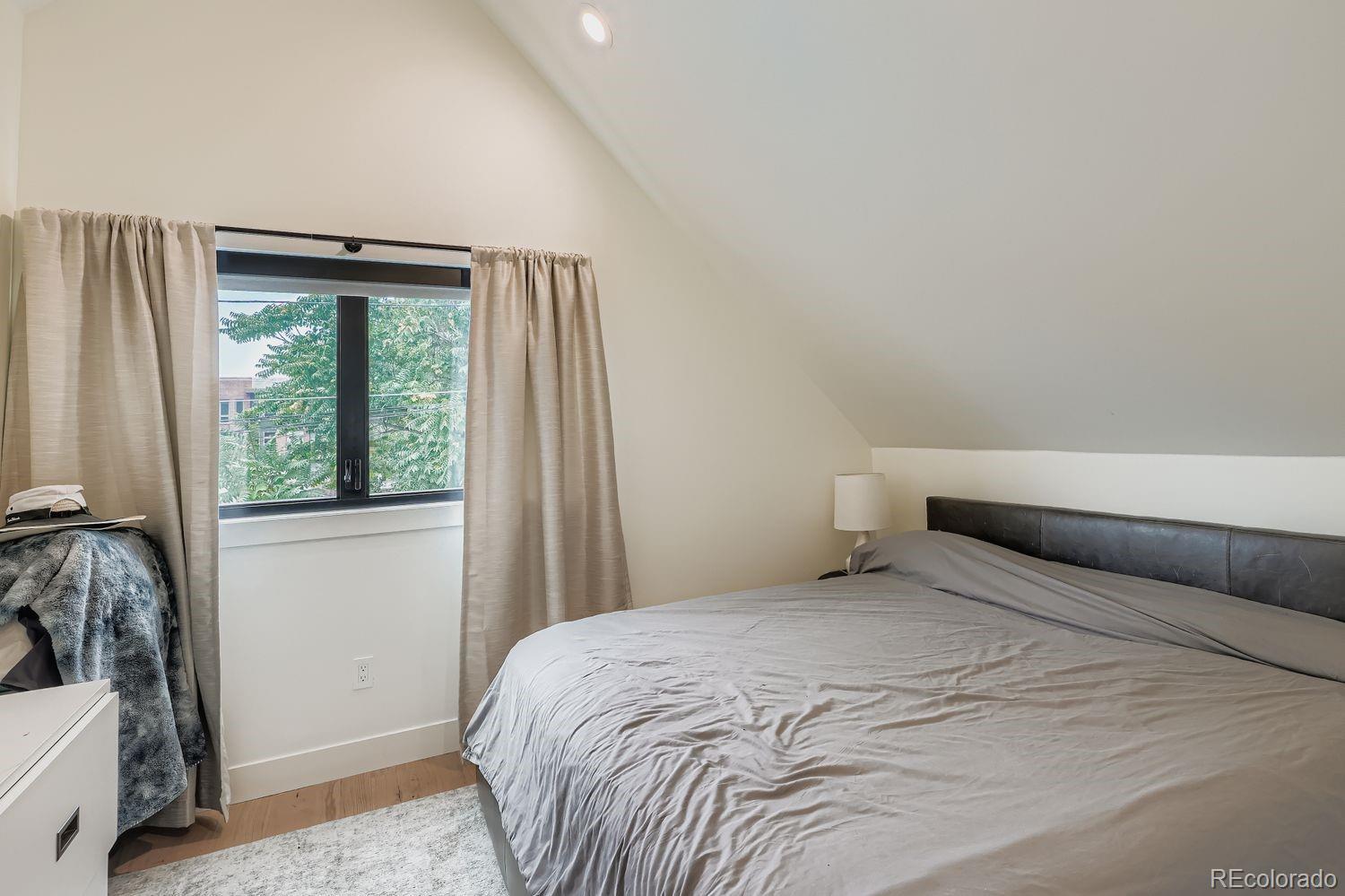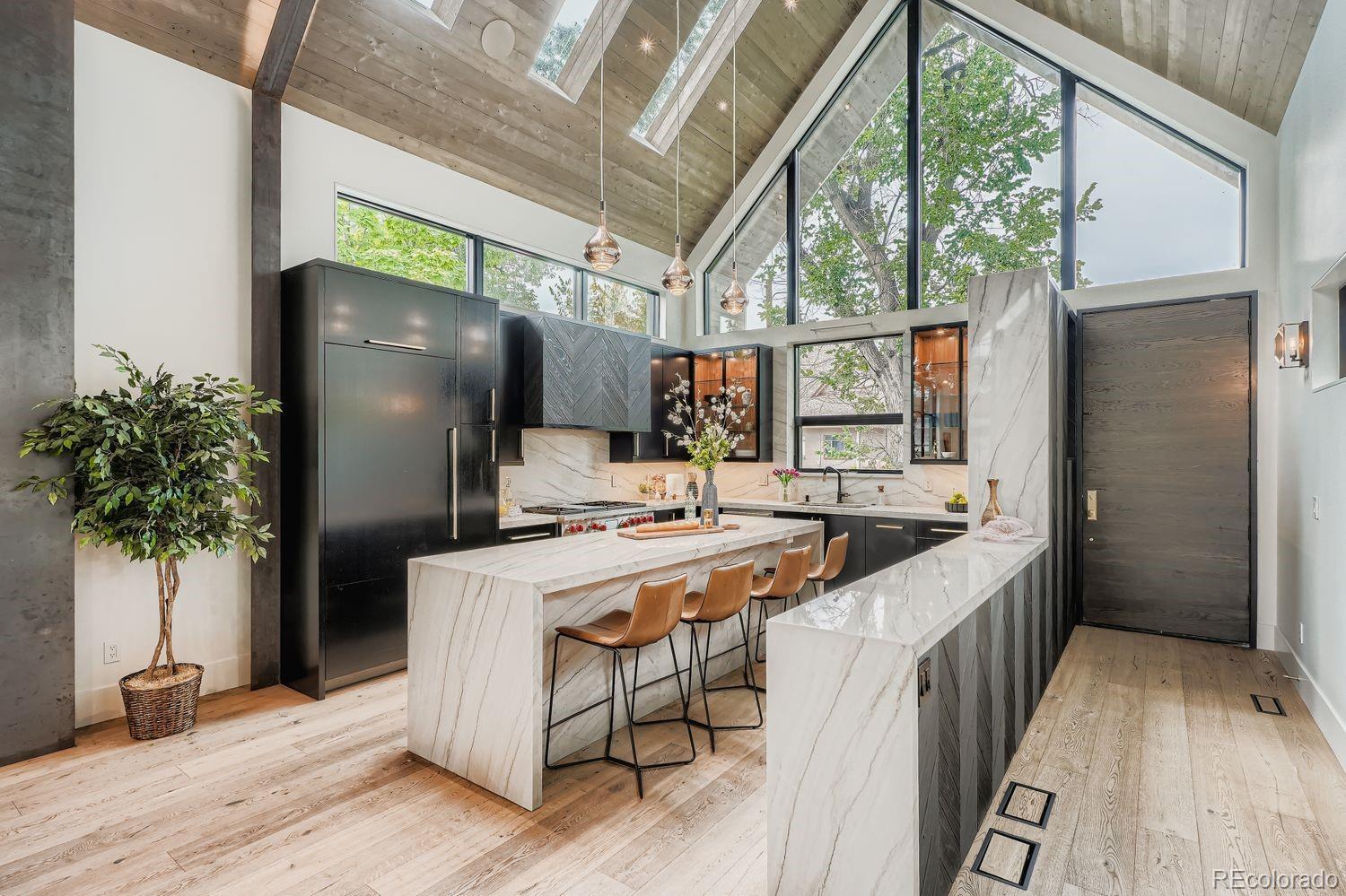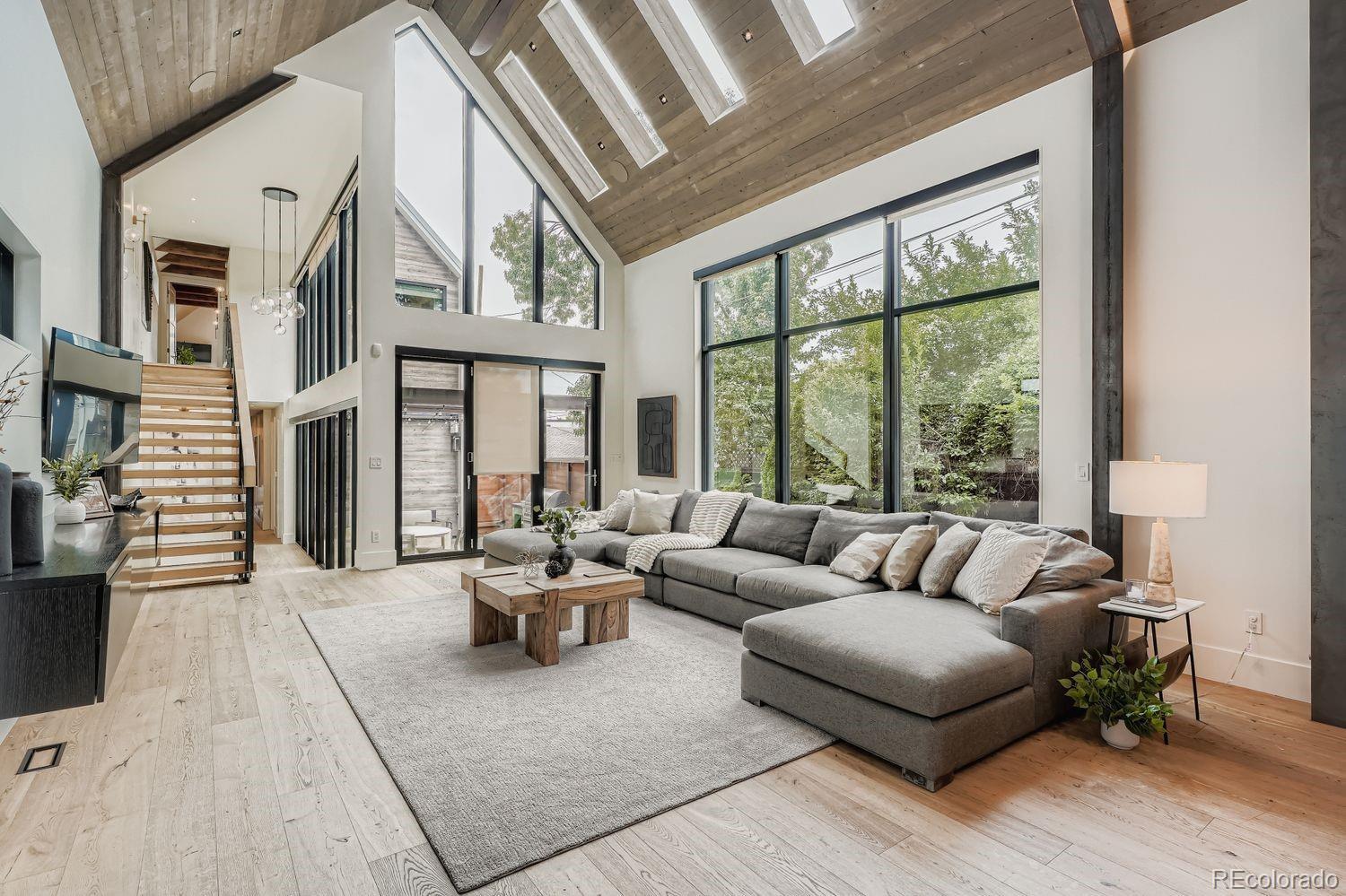 Architectural style meets everyday comfort in this custom modern home in Denver’s coveted LoHi. A bold mix of cedar, glass, and clean lines sets the tone, while vaulted ceilings, exposed beams, skylights, and walls of glass fill the open living area with light. Wide-plank hardwoods connect the living room with floating media console, dining area, and the striking designer kitchen with black cabinetry, high-end appliances, and dramatic lighting. Upstairs, the vaulted primary suite feels like a retreat with built-ins, a spa-style bath with dual vanities, bold tile, a glass walk-in shower, and a custom closet with ladder-access loft. A nearby office or nursery completes the level. The main floor offers two bedrooms, a full bath, half bath, and a large mudroom/laundry with dual washer/dryer hookups. The finished lower level features a bright living space and a combined two-bedroom layout currently used as a fitness room—easily converted back. The private yard with low-maintenance turf is ideal for gatherings. The oversized garage includes 220v wiring, and the well-finished ADU above is perfect for guests, in-laws, or rental income. Oversized windows throughout create a seamless indoor-outdoor feel. Set on a quiet street yet steps to LoHi’s best dining, coffee, and culture, this home delivers refined, stylish, modern Denver living. Seller offering a rate buy down with acceptable offer. Ask listing agent for details.