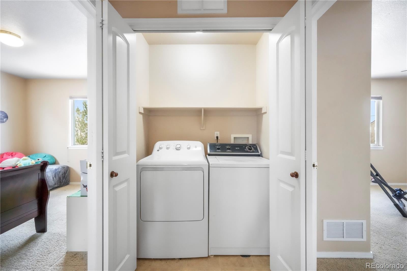 Located in the highly sought-after Wolf Ranch community and award-winning District 20, this spacious two-story home offers five bedrooms, 3.5 baths, a three-car garage, and a finished basement—providing flexibility for everyday living and multigenerational needs. Mature landscaping and a welcoming entry lead into a bright main level with luxury tile flooring, abundant natural light, and a convenient powder room. The open-concept kitchen and living room include granite countertops, stainless steel appliances, subway tile backsplash, a window over the sink, generous pantry, and an eat-in dining area with a walkout to the backyard. (The yard is not fenced, though fencing is allowed.) The living room features a gas fireplace and numerous windows for abundant natural light. Upstairs, the primary suite offers dual closets and an open 5-piece bath with dual vanities, a soaking tub/shower combination, and a private water closet. Three additional generous bedrooms and a full bath complete the upper level, along with a convenient laundry room with washer and dryer included. The finished basement adds exceptional versatility with a large recreation room currently used as a bedroom, plus another bedroom serving as an oversized closet and a full bath—ideal for teens, guests, roommates, or extended family. Wolf Ranch enhances the lifestyle with walking trails, a dog park, community pool, clubhouse, and a private lake for fishing, paddleboarding, and more. With newer furnace and AC and a new water heater in November 2025, this home is move in ready! Situated just off the Powers Corridor, the home offers quick access to parks, top-rated schools, restaurants, shopping, the Air Force Academy, Peterson SFB, and I-25—combining comfort, space, and vibrant community amenities in one exceptional property.