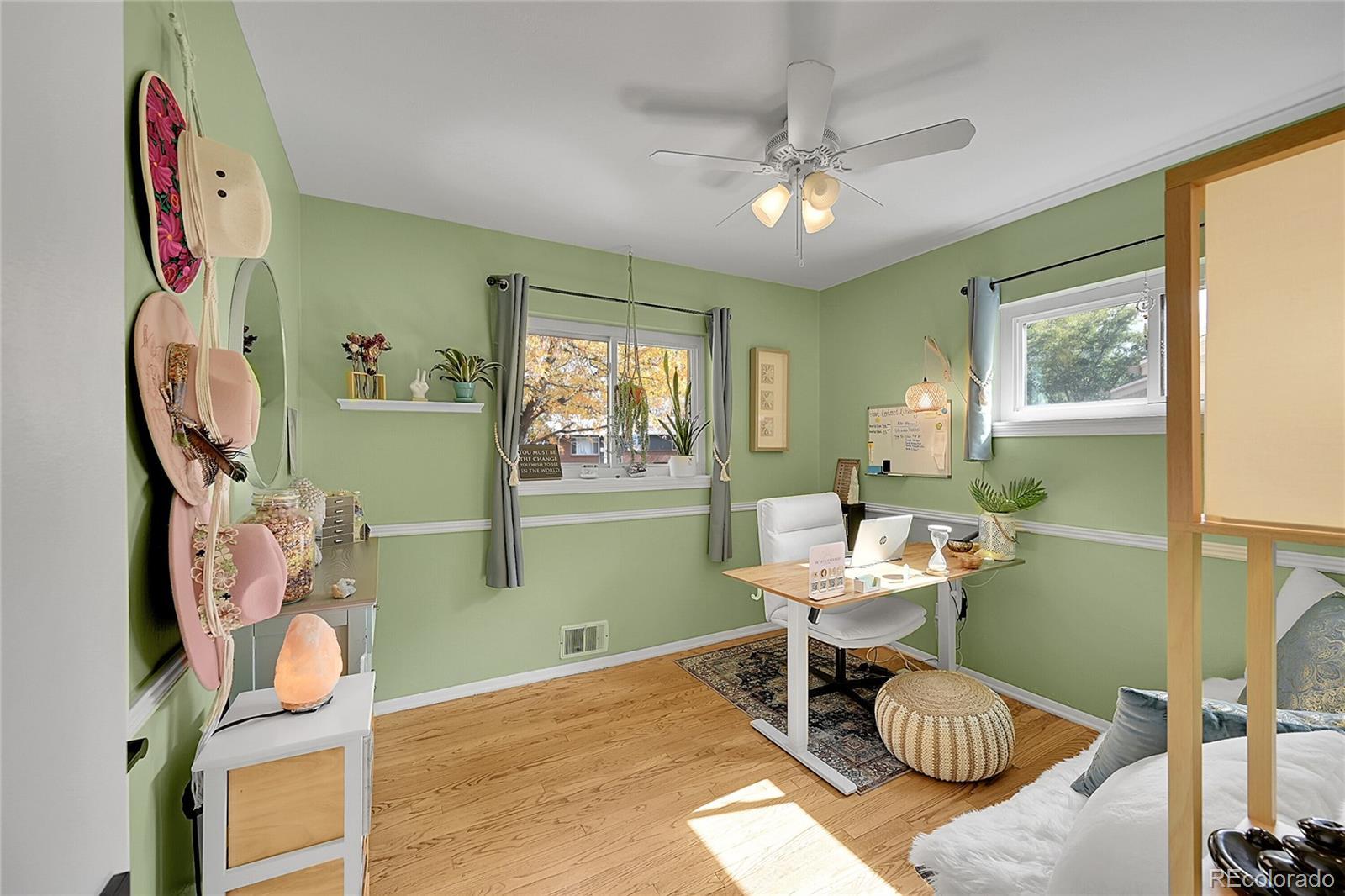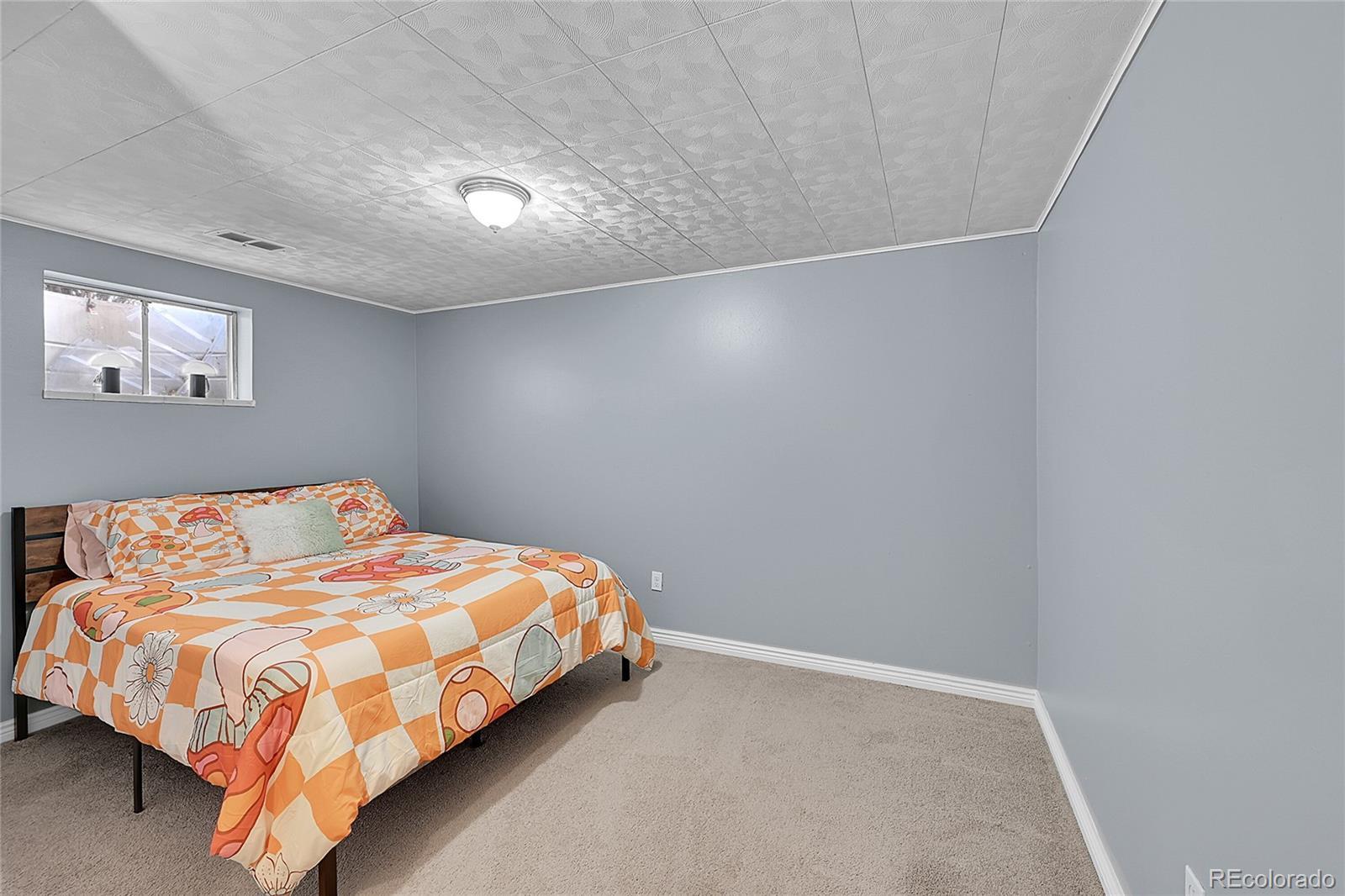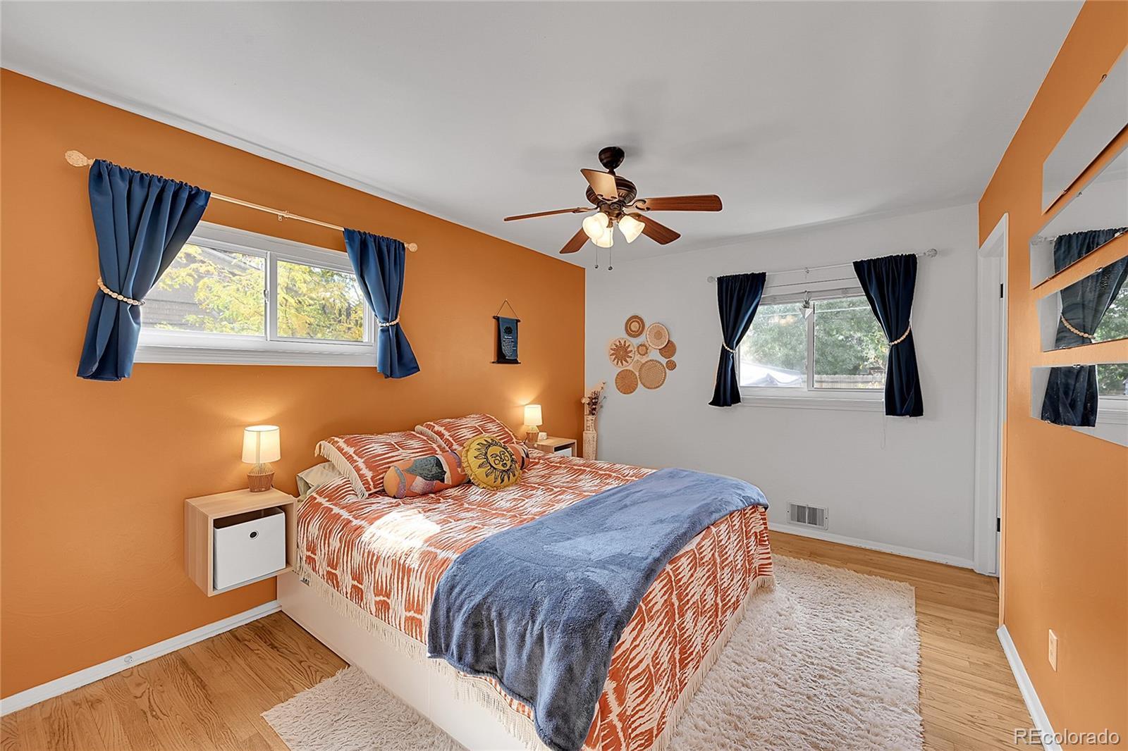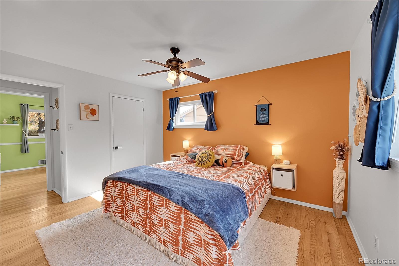 Welcome to this inviting 5-bedroom, 3-bath gem nestled in Denver’s desirable Harvey Park neighborhood. Beautiful landscaping and mature trees create a welcoming curb appeal, setting the tone for the warmth and character found inside. Offering 2,266 square feet of thoughtfully designed living space, this home combines comfort, functionality, and timeless appeal. The open layout flows naturally, with wood floors gracing the living room and main-level bedrooms, creating a cohesive and inviting atmosphere. The dining area and kitchen open to a covered patio, providing the perfect setting for outdoor dining or relaxing in the spacious, fully fenced backyard. The peaceful primary suite features a private ¾ bath, while two additional bedrooms share a full hall bath, offering flexibility for family, guests, or a home office. Downstairs, the finished basement expands your living space with a cozy family room anchored by a brick-wall wood-burning fireplace, ideal for movie nights or entertaining. Two more bedrooms, a ¾ bath, and a generous laundry area complete the lower level, providing ample room for guests or hobbies. Outside, an additional enclosed area in the backyard offers a perfect spot for pets or children to play safely. A large storage shed and a one-car attached garage add convenience and functionality. This property’s prime location offers easy access to Highway 285 and Santa Fe Drive, along with nearby shopping, restaurants, and recreational destinations. Outdoor enthusiasts will love being minutes from Bear Creek Trail, Loretta Heights Park, and Harvey Park Lake, as well as the local recreation center. Blending modern comfort with a peaceful suburban feel, this Harvey Park treasure is ready to welcome you home.