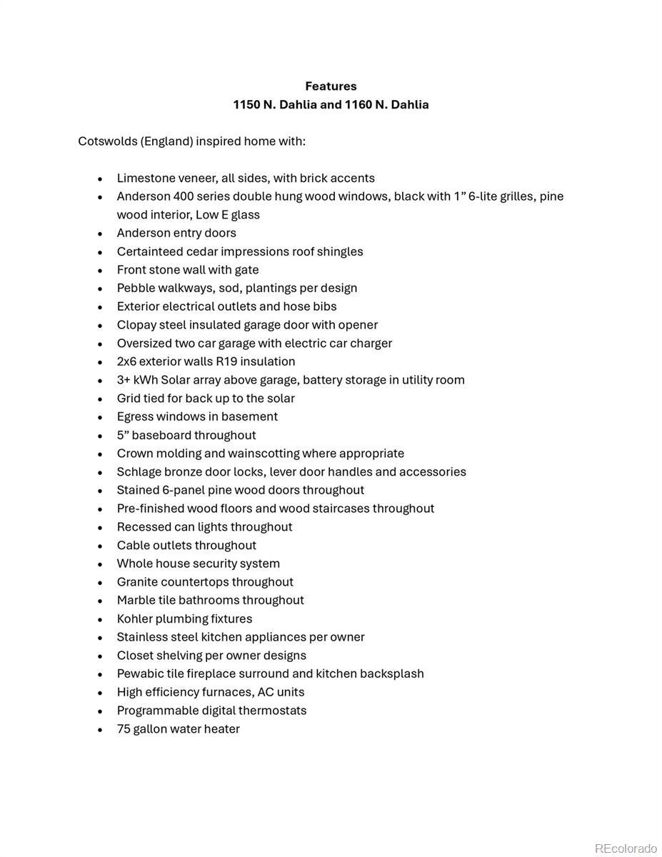 This is a listing for one of two new houses, to be built next to each other, on two new lots being split from the parking lot of the Church of Christ. The existing house at 1150 N Dahlia will be removed. The new houses (a 2nd elevation is being created) will be in the Cotswold style of central England, with a real limestone veneer on all sides, wood floors and staircases, and wood doors throughout. The homes will feature crown moldings, wainscotting, fireplaces with pewabic tile surrounds, window seats, the finest old-world construction that we can build. The roof shingles will be simulated cedar. The houses are steps away from Lindsey Park and are served by some of the best public schools in Denver, including Hill Middle School and East High School. The sites are walkable to restaurants, shops, and a movie theater. Each house is 5,472 sf, six bedrooms, five and a half baths. Stainless steel appliances. There will be a 3+ kW solar array with battery storage, which should provide most of the energy used. The house is still grid tied for backup power. Designed by noted Michigan architect Jeff Dawkins, an expert on luxury infill houses. Call Jason 303 802 6700.